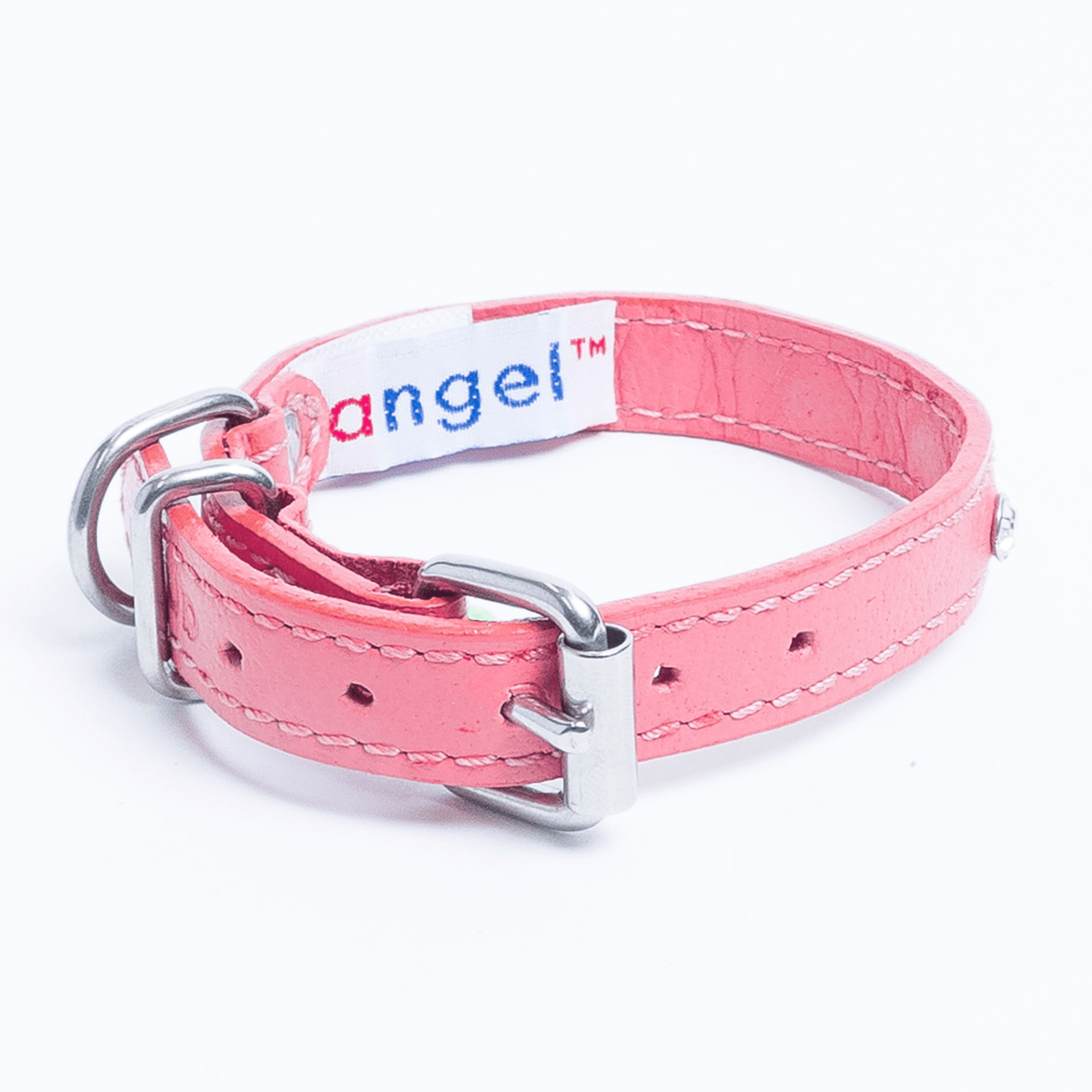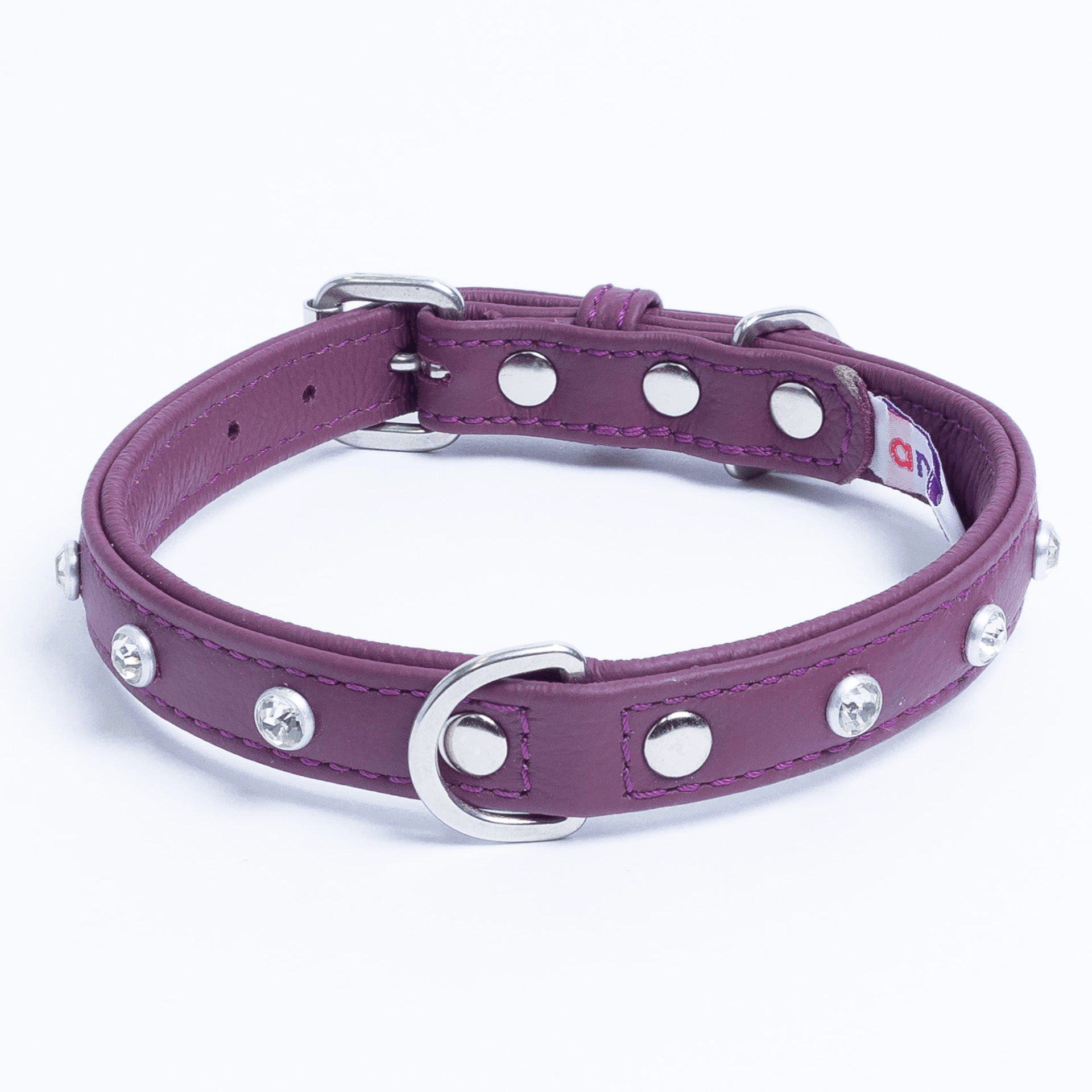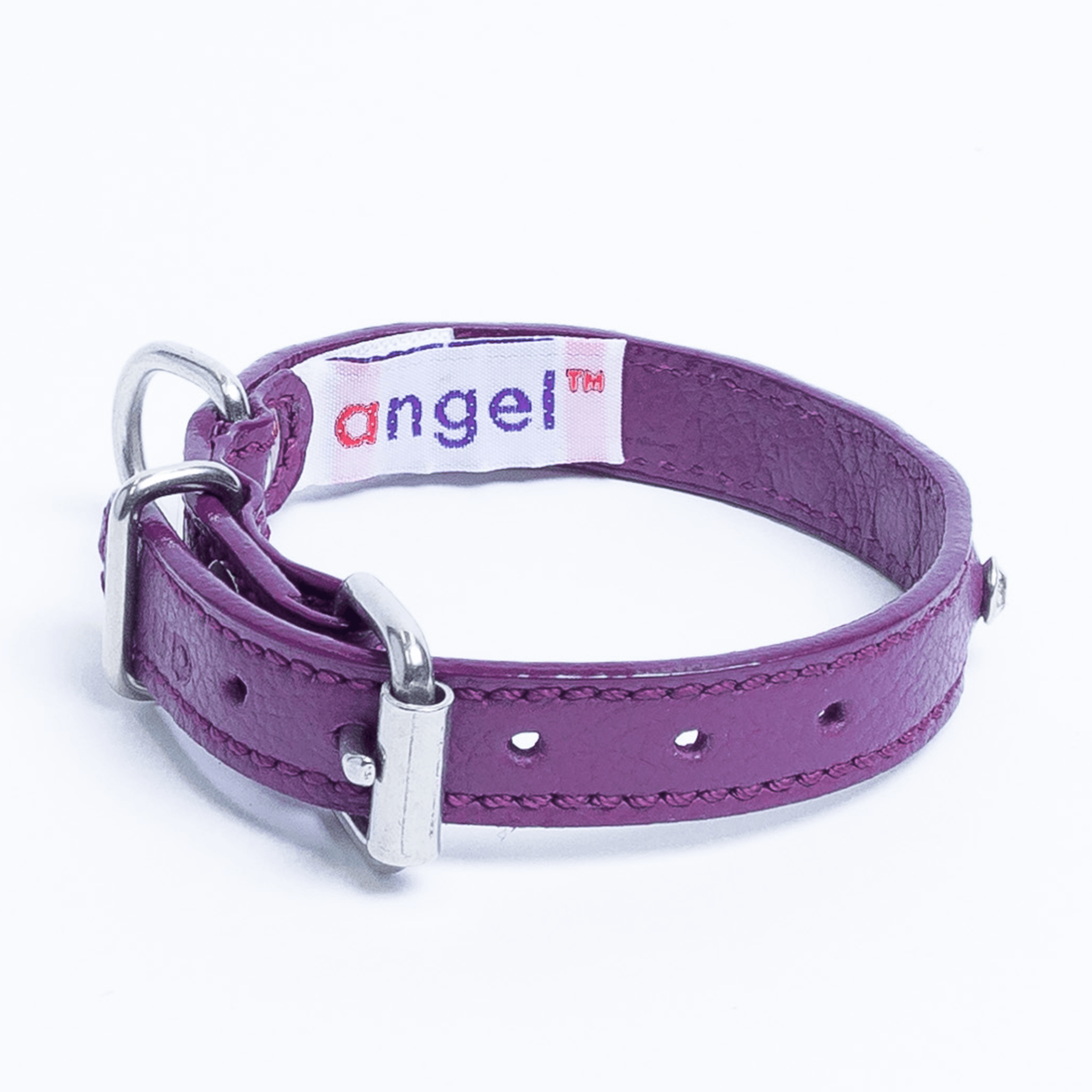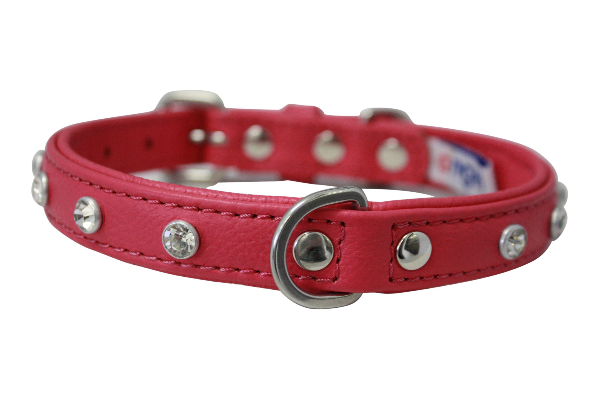 This top selling collection is sure to separate your dog from the rest of the pack. . Single or multi rows of shiny replica diamonds surround these blingy collars. This collection is made with genuine soft cowhide, padded for supreme comfort and stainless steel hardware. Available from 10" to 30", in increments of 2". The Angel signature centre D- ring is present for maximum control and exposure (except the 10" size).