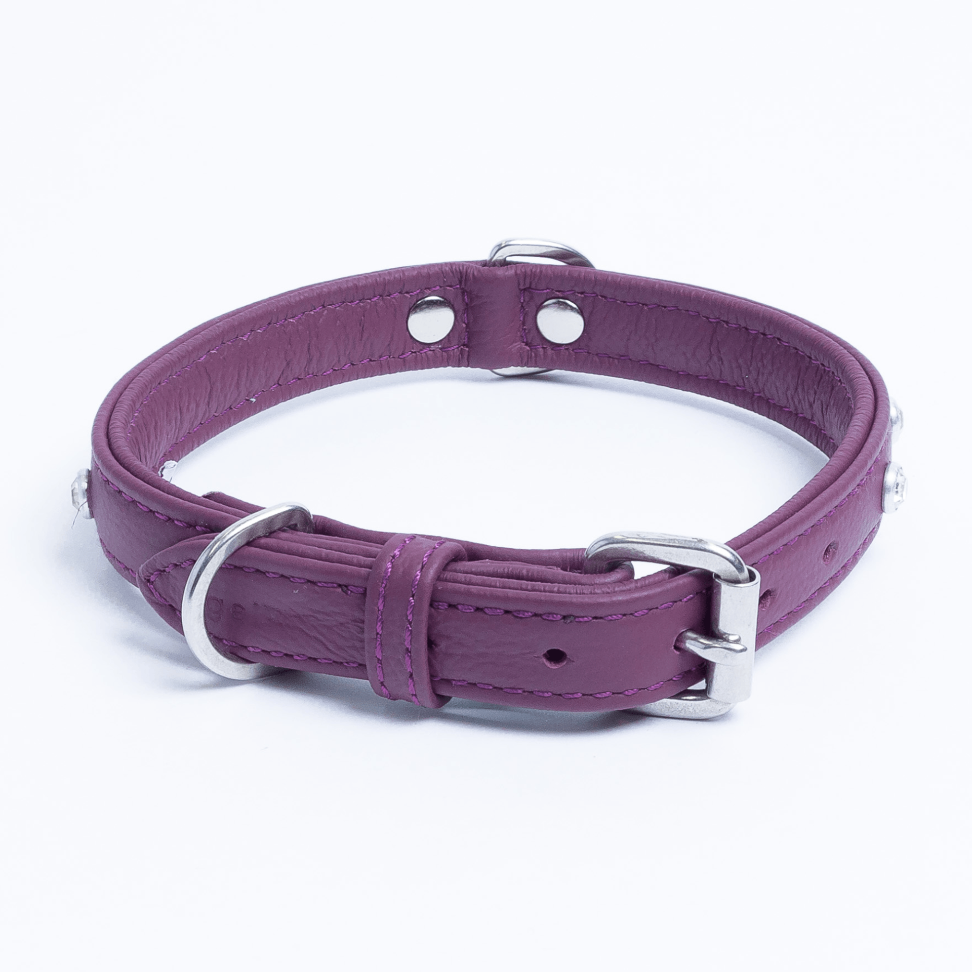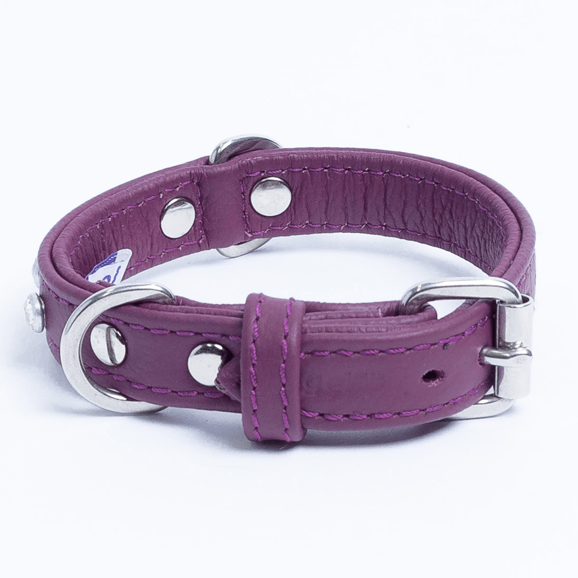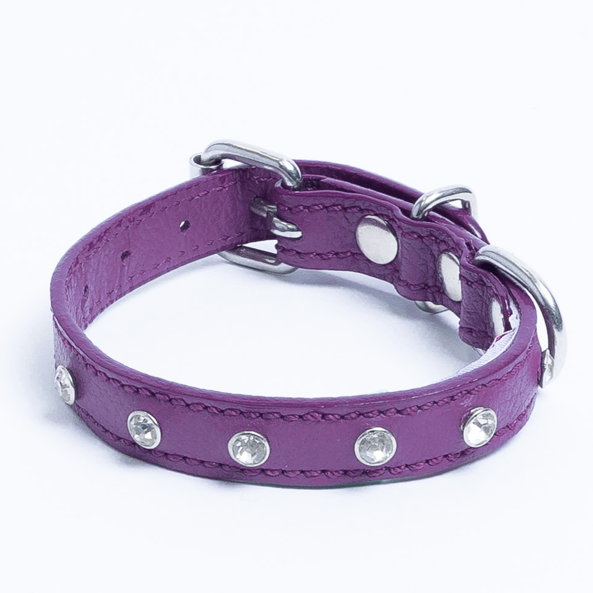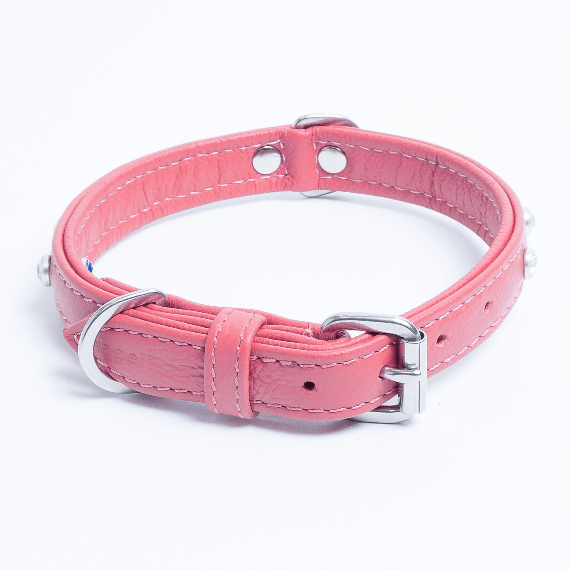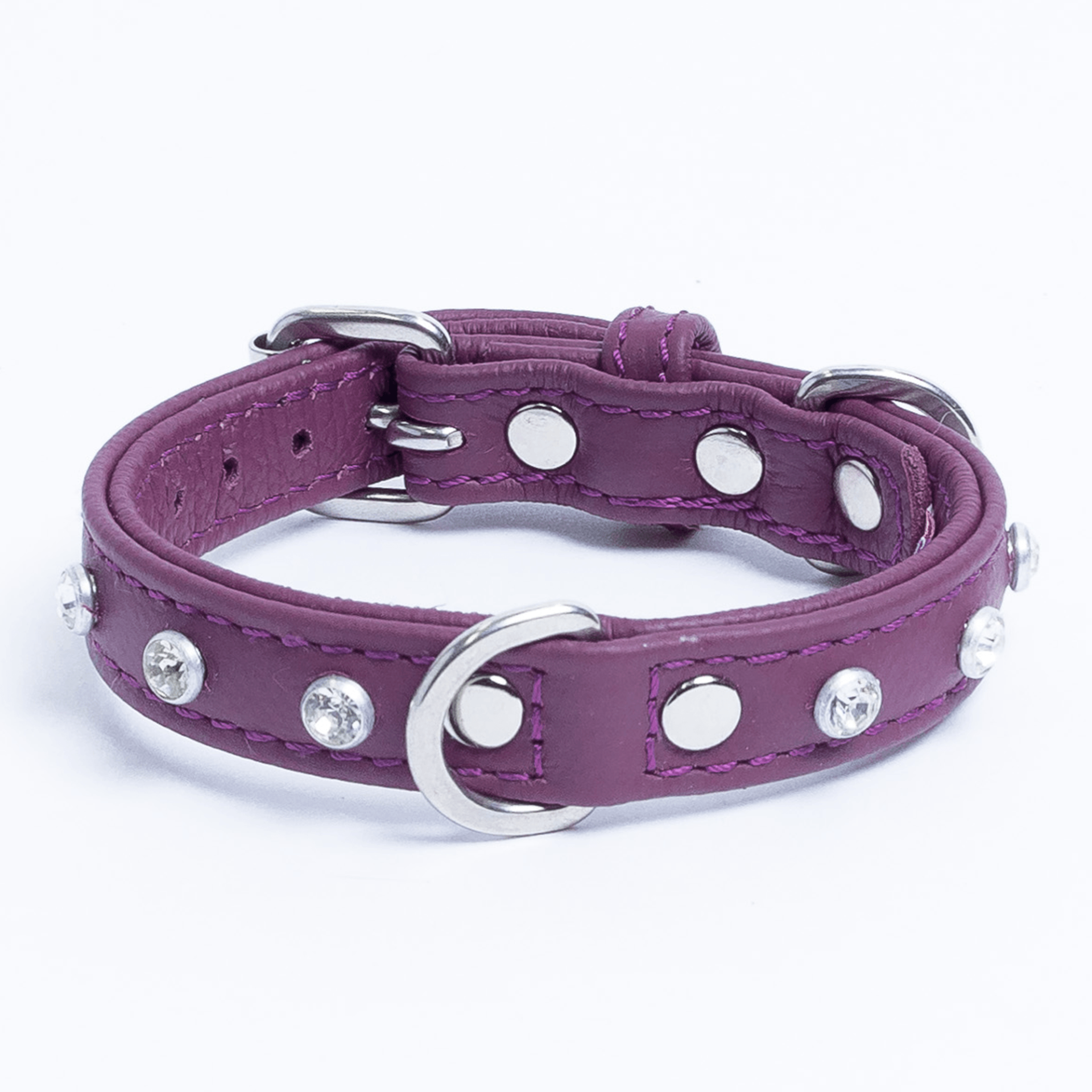 This top selling collection is sure to separate your dog from the rest of the pack. . Single or multi rows of shiny replica diamonds surround these blingy collars. This collection is made with genuine soft cowhide, padded for supreme comfort and stainless steel hardware. Available from 10" to 30", in increments of 2". The Angel signature centre D- ring is present for maximum control and exposure (except the 10" size).