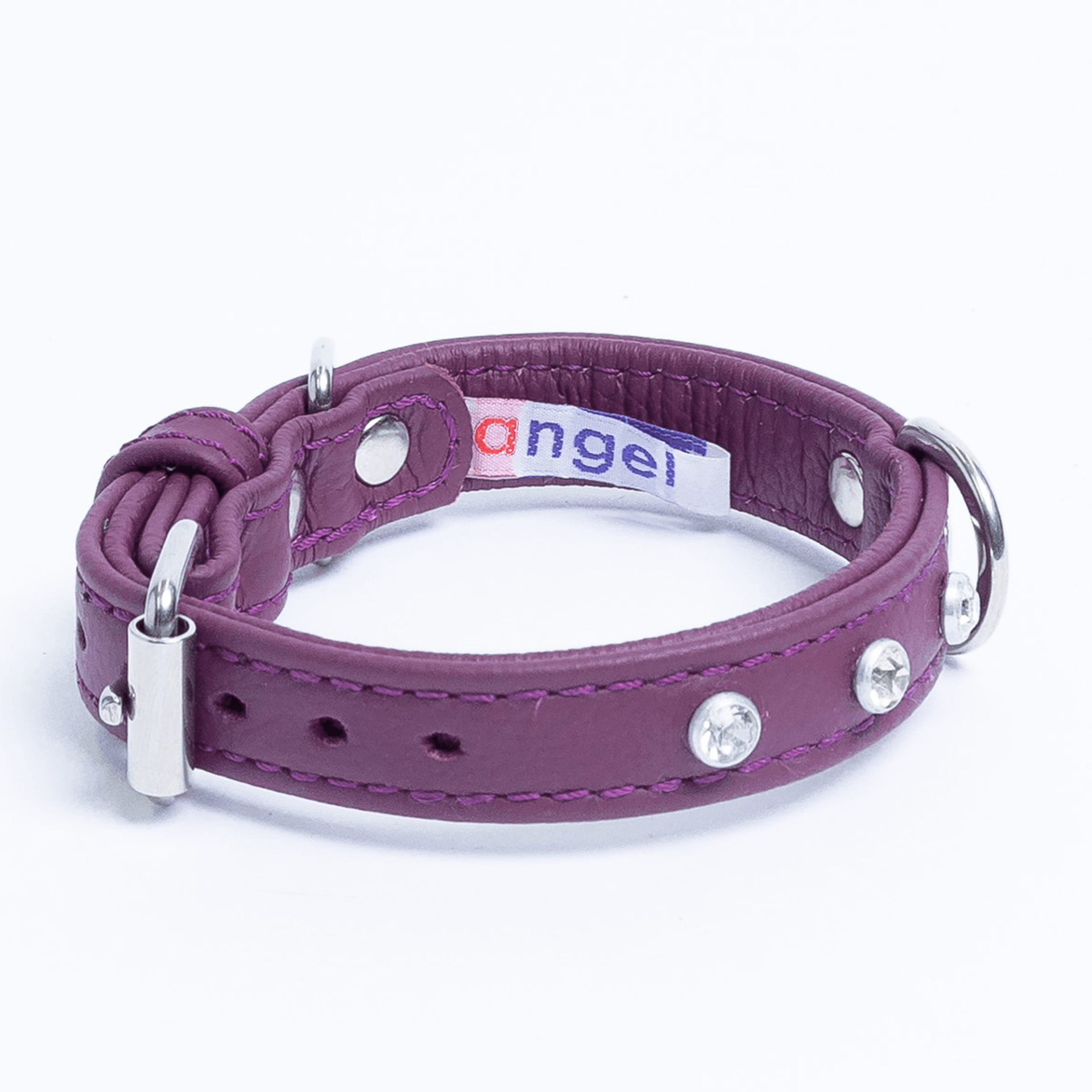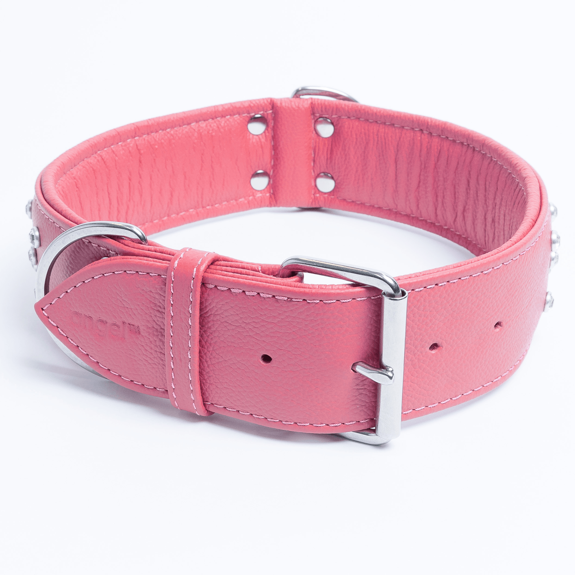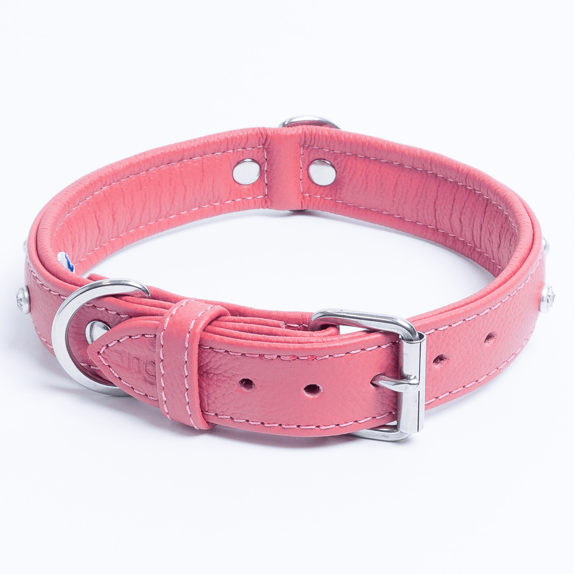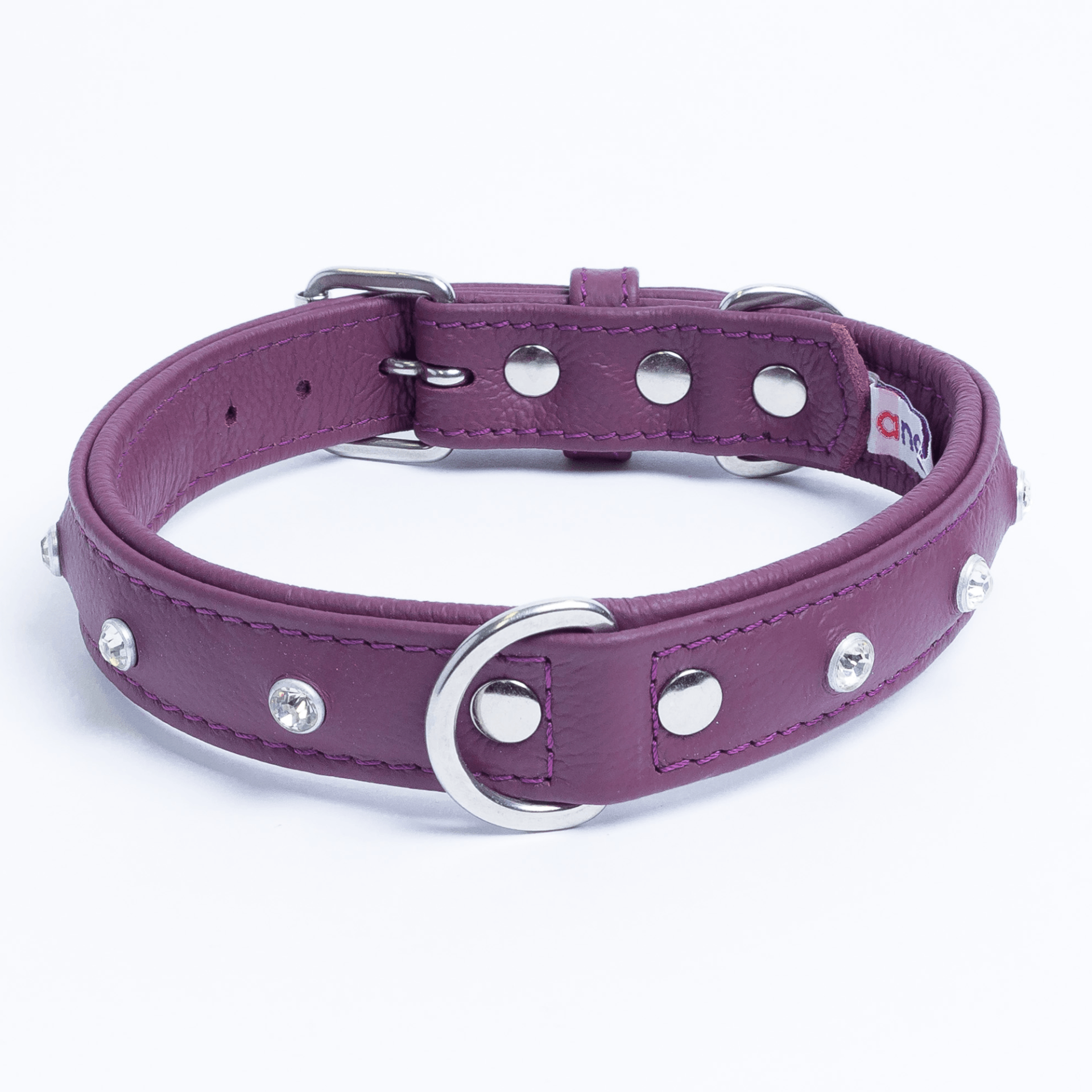 This top selling collection is sure to separate your dog from the rest of the pack. . Single or multi rows of shiny replica diamonds surround these blingy collars. This collection is made with genuine soft cowhide, padded for supreme comfort and stainless steel hardware. Available from 10" to 30", in increments of 2". The Angel signature centre D- ring is present for maximum control and exposure (except the 10" size).