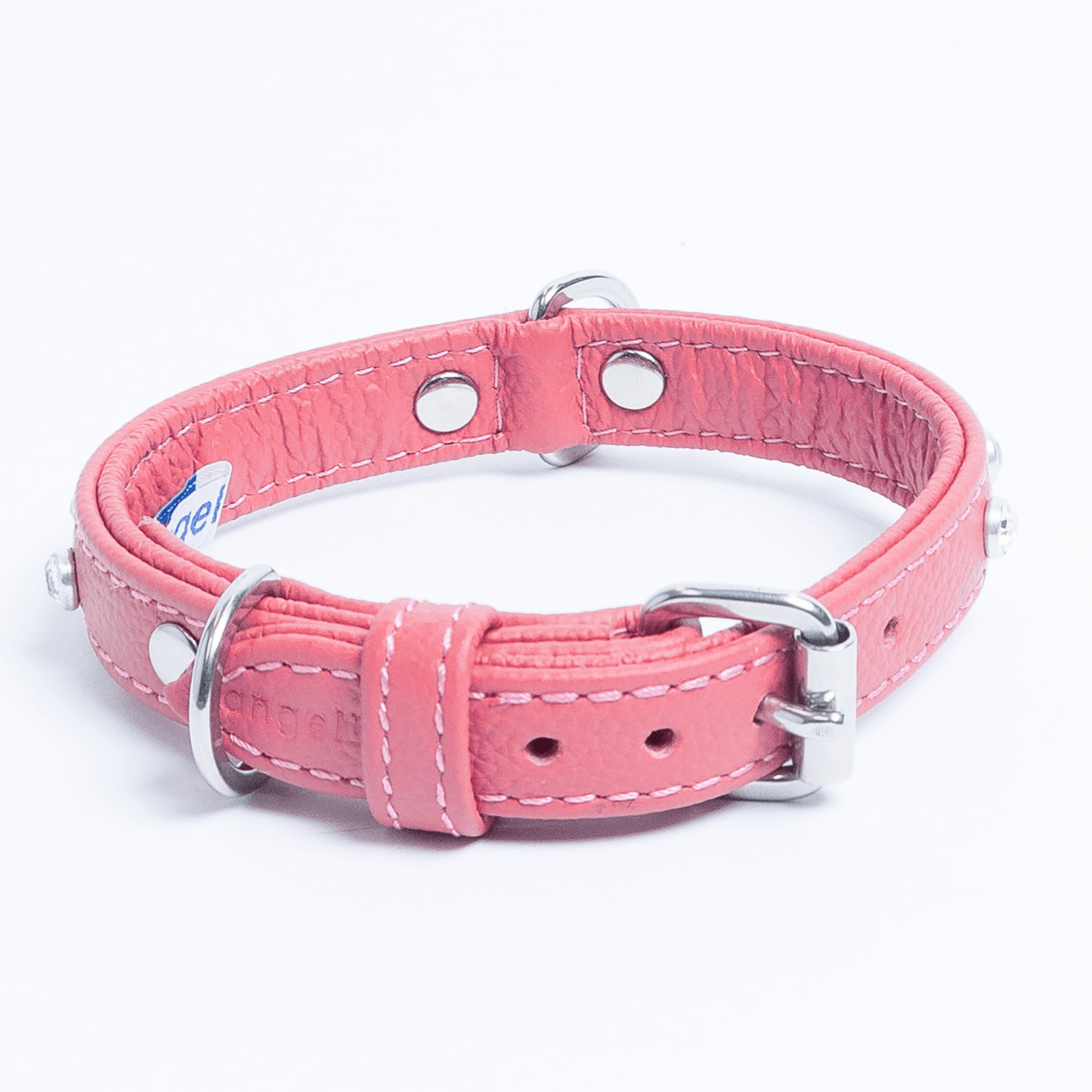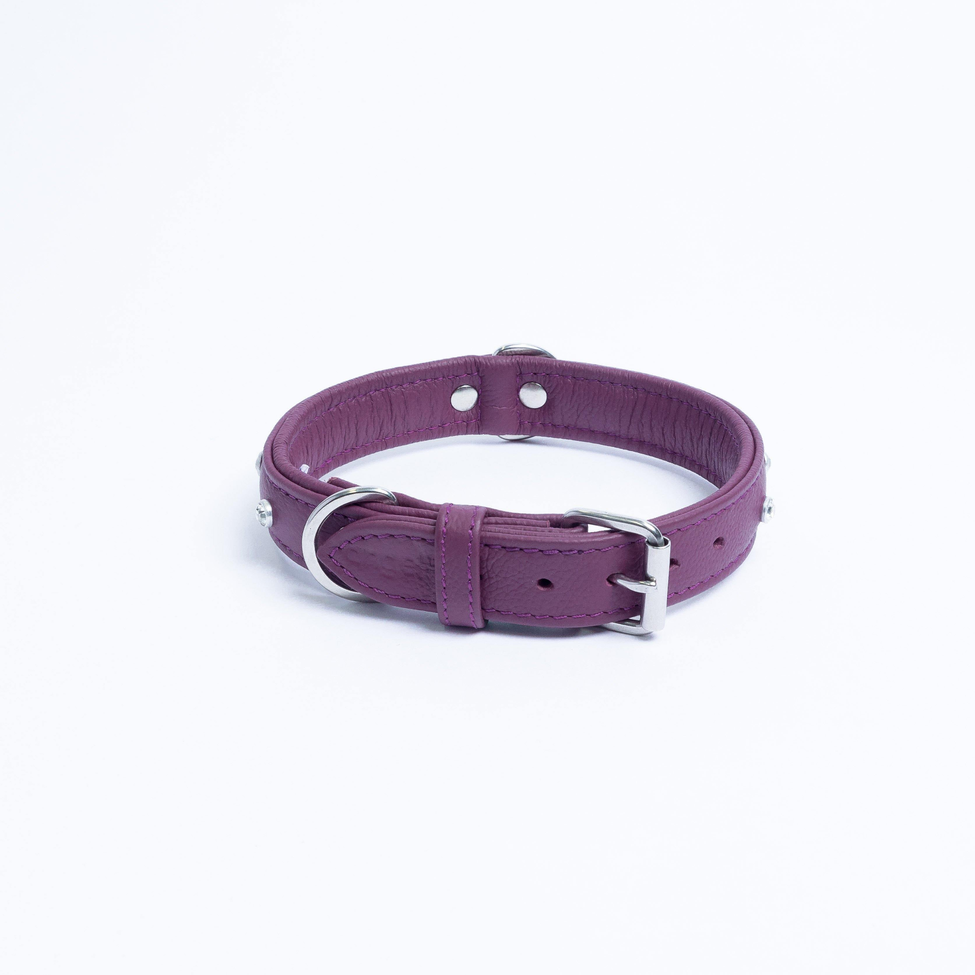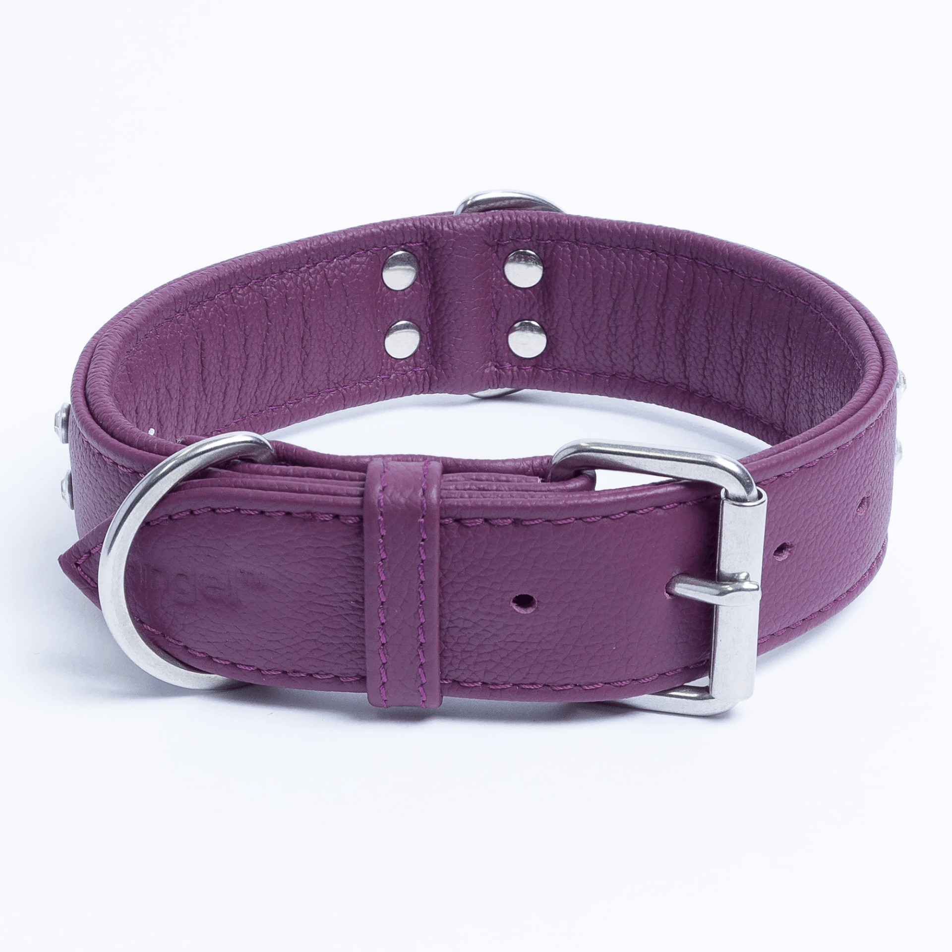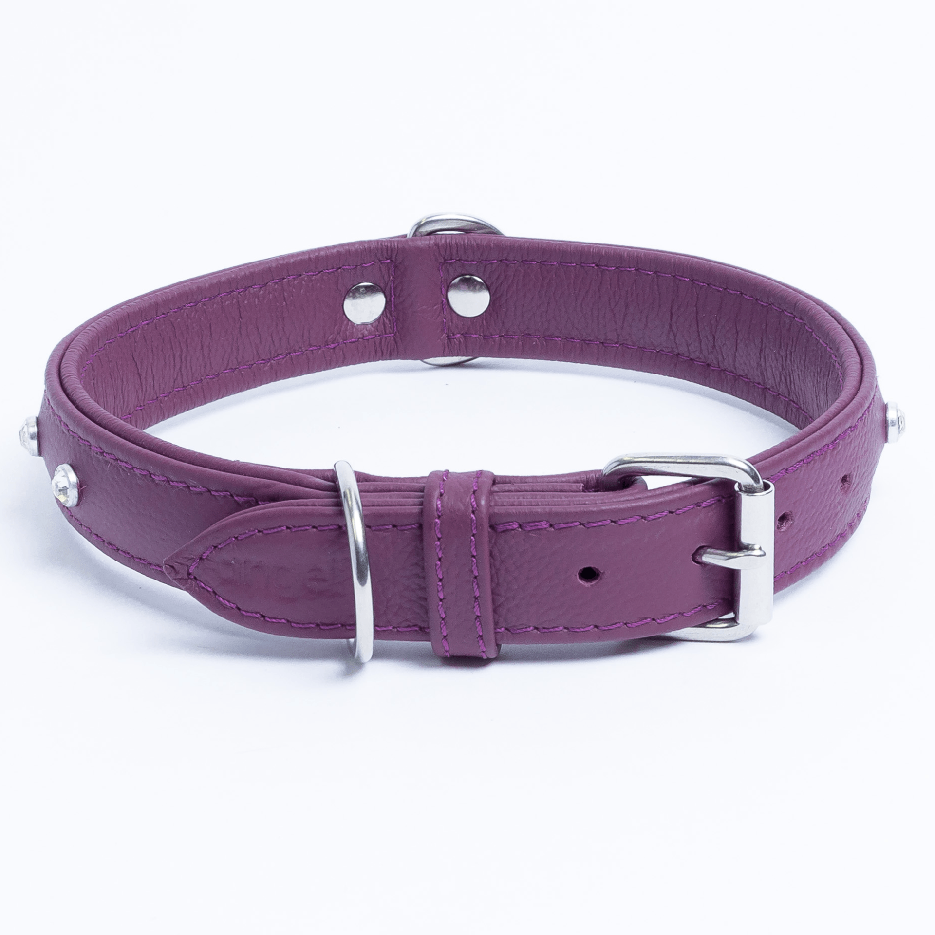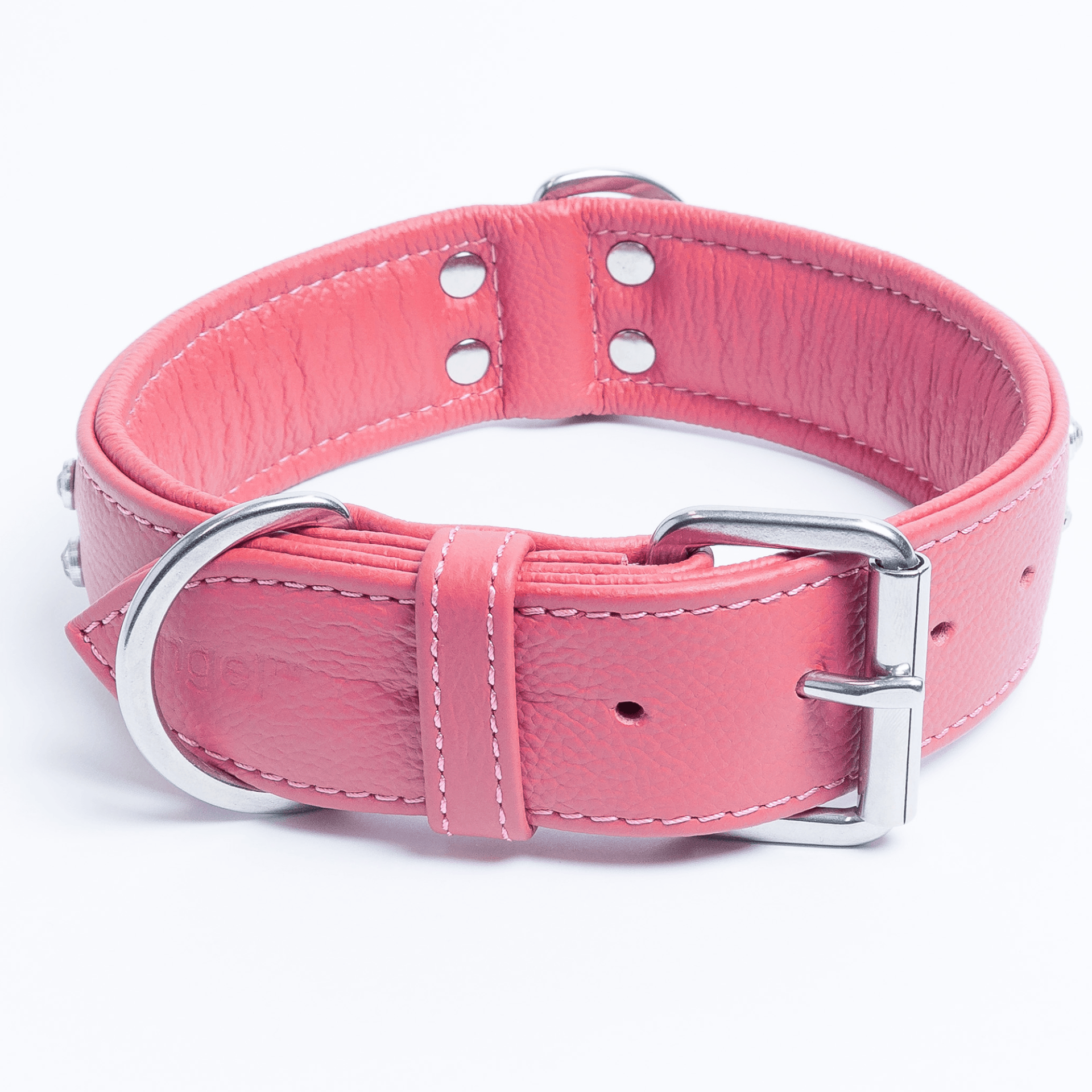 This top selling collection is sure to separate your dog from the rest of the pack. . Single or multi rows of shiny replica diamonds surround these blingy collars. This collection is made with genuine soft cowhide, padded for supreme comfort and stainless steel hardware. Available from 10" to 30", in increments of 2". The Angel signature centre D- ring is present for maximum control and exposure (except the 10" size).