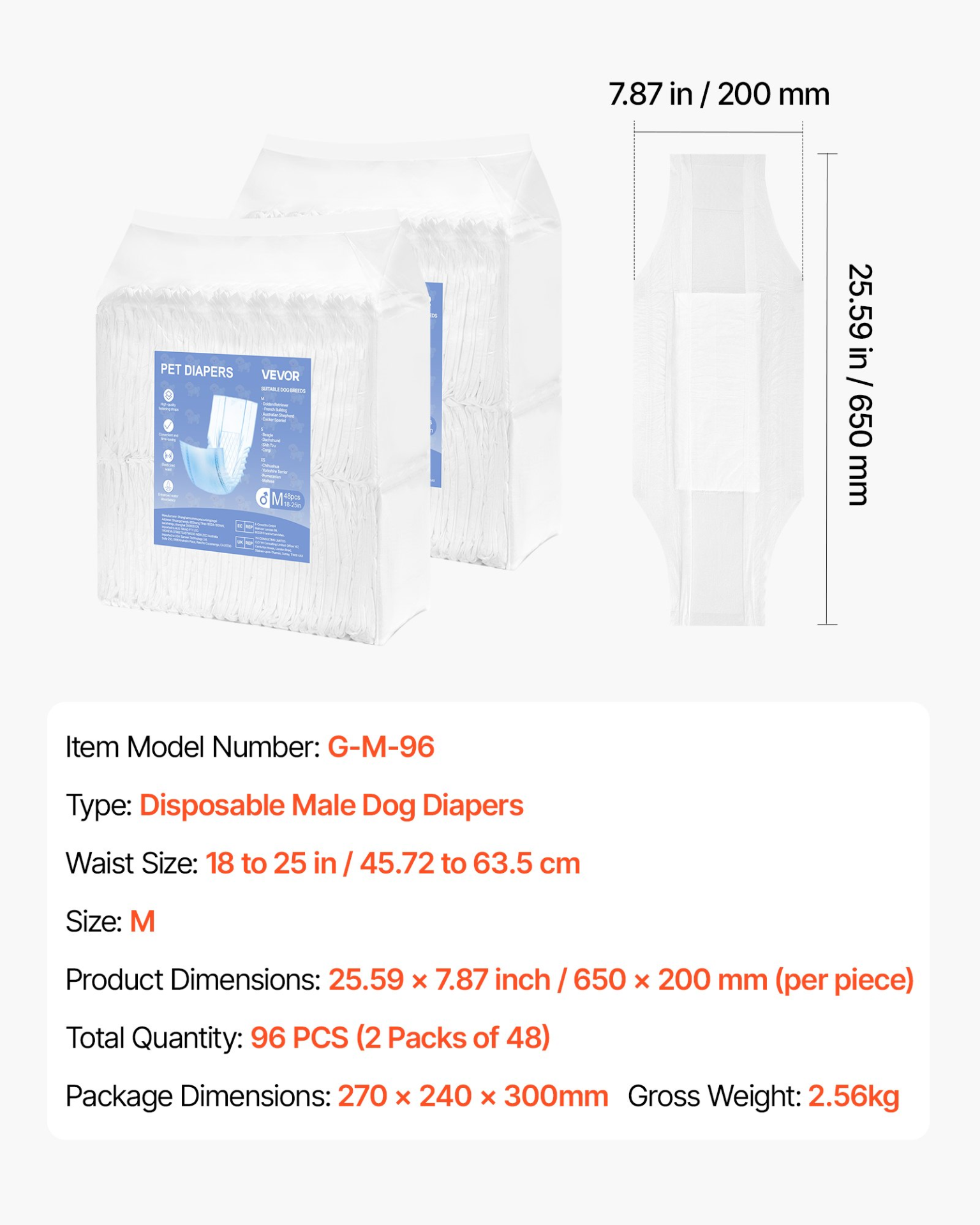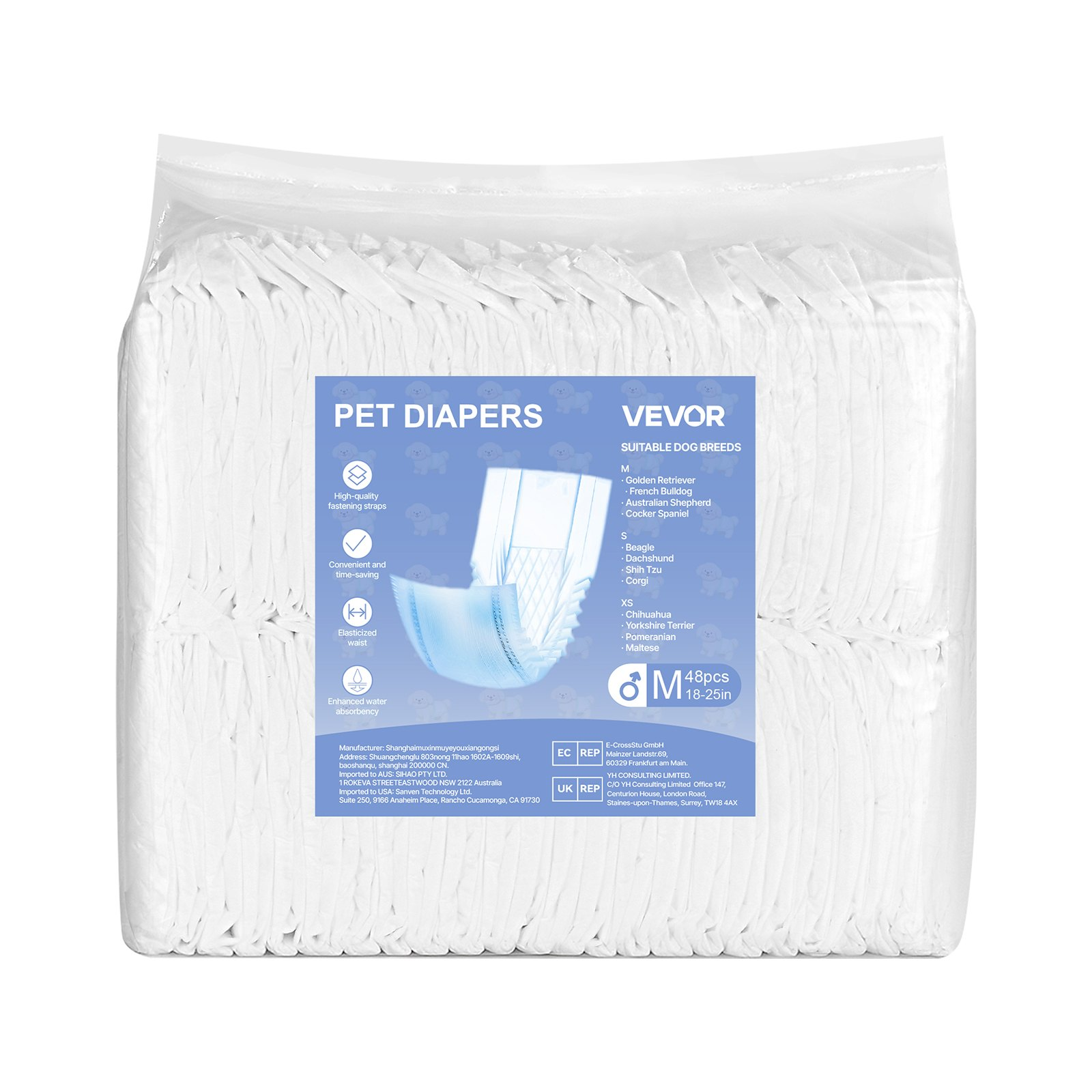 Keep your medium-sized dog clean and confident with the VEVOR Disposable Male Dog Diapers, expertly designed for all-day comfort and protection. Perfect for male dogs during heat cycles, house training, travel, or incontinence care, these belly bands feature a super-absorbent polymer core that locks in moisture while keeping your pet dry and odor-free.