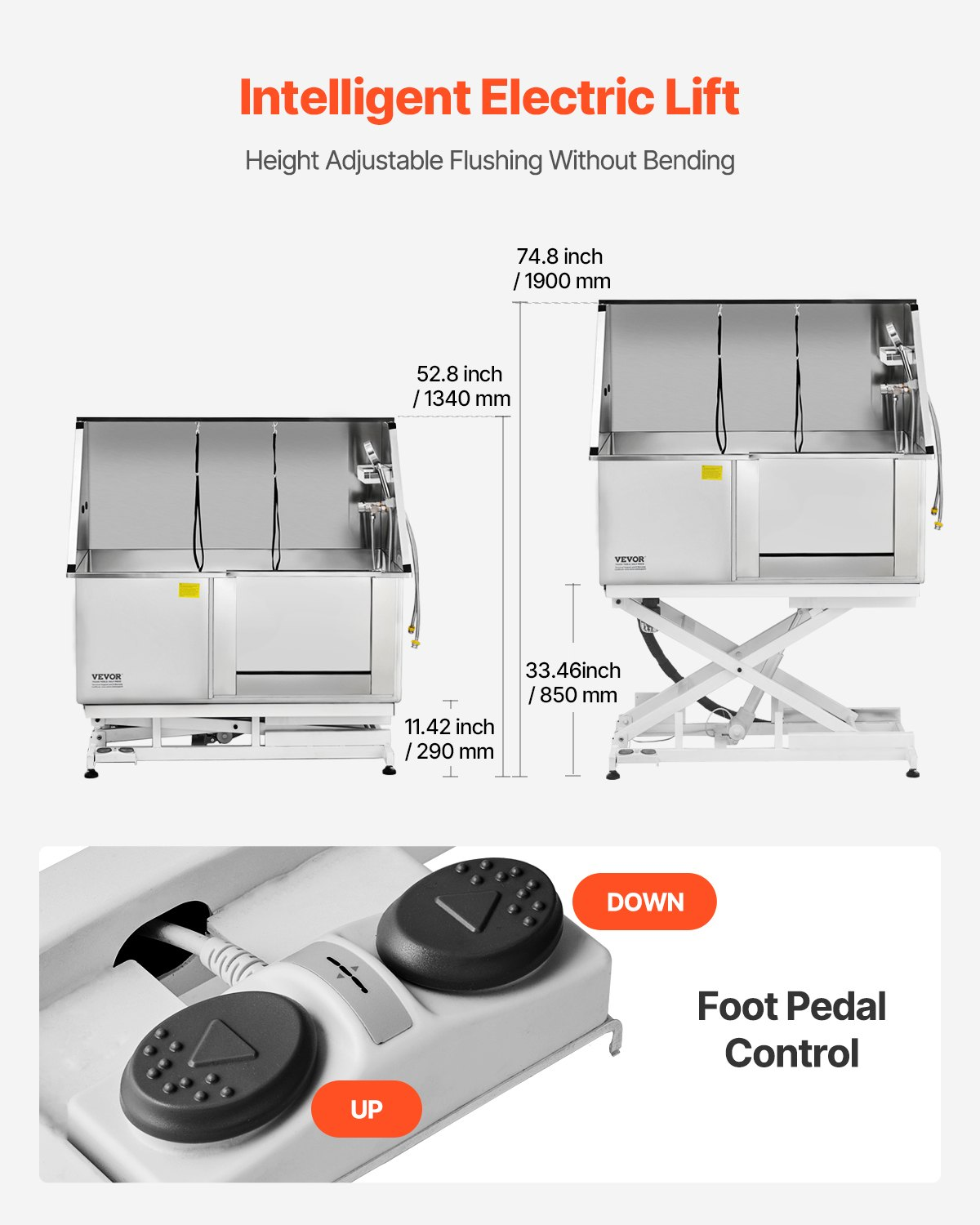 Experience professional-level grooming at home or in your salon with the VEVOR 50" Electric Lift Dog Washing Station, designed for safety, comfort, and convenience. Built from heavy-duty stainless steel, this grooming tub is both rust-resistant and easy to clean, offering unmatched durability for long-term use. The electric lift system smoothly raises and lowers the tub to your preferred height, eliminating back strain and making it easier to bathe pets of all sizes.
