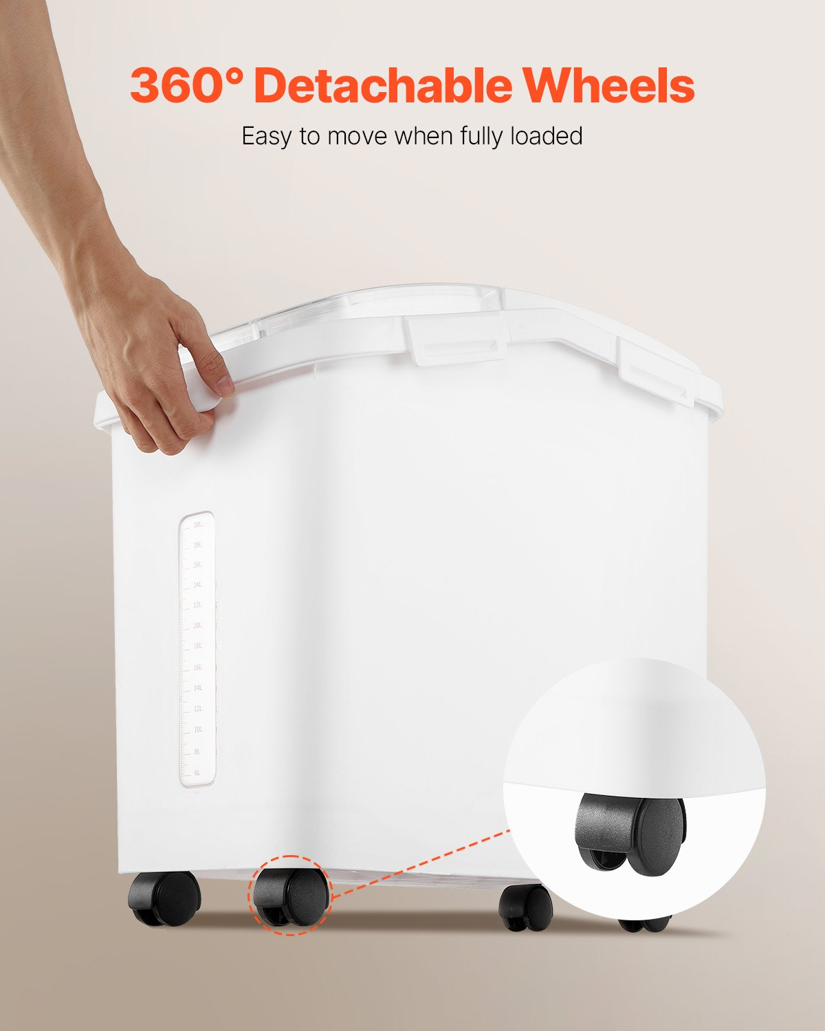 Constructed from thickened PP and PET materials, the container ensures long-lasting durability while keeping contents safe from moisture, dust, and pests. The airtight silicone-sealed lid and secure locking clips maintain freshness, while the built-in wheels make it effortless to move even when full. A transparent scale window helps you monitor contents at a glance, and the included measuring scoop makes dispensing quick and clean.