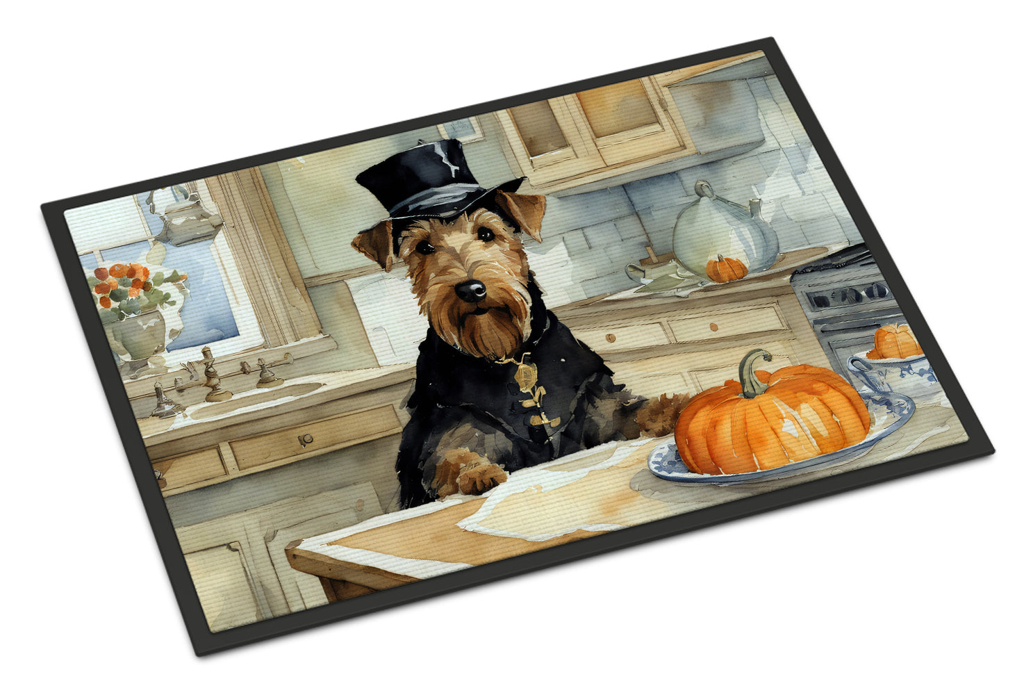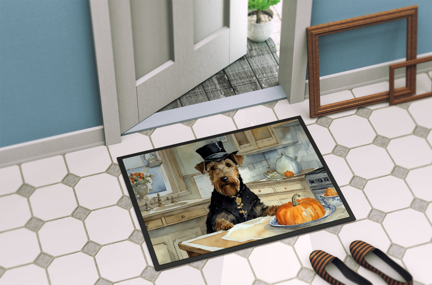 Doormat featuring breed specific Airedale Terrier artwork. Celebrate Halloween with this Halloween Doormat. Welcome your guests in style with our Artwork Door Mat, designed to withstand almost any weather condition. This mat, measuring approximately 24 by 36 inches, is held together by durable black binding tape. Its top layer, composed of polyester felt, is dyed with the eye-catching image you see on the mat. A few layers below provide the mat with stability, while its rubber bottom is stamped to help prevent slipping and ensures safety. Our mat works wonderfully as both an indoor or outdoor door mat. For cleaning, simply hose it off with water or use a power washer - no need for any cleaner that produces suds. Avoid scrubbing with a brush, instead, opt for the vacuum on floor setting. Designed manufactured and printed in the USA, this mat is a perfect addition to your porch, outdoor kitchen, entryway, or any indoor space. Its unique design makes it a charming decorative rug that greets your guests and adds a stylish touch to your home decor.