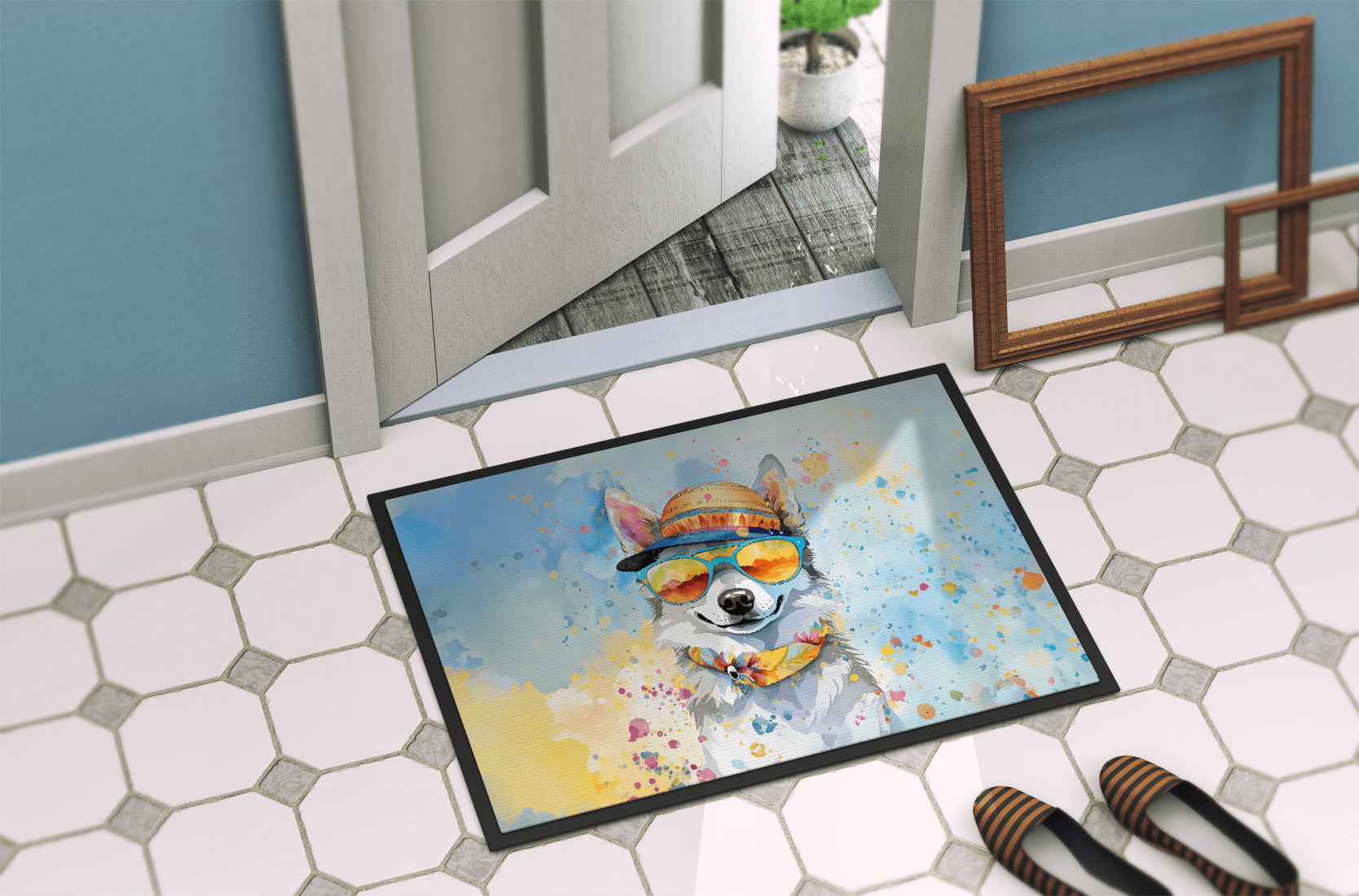 Doormat featuring breed specific Alaskan Klee Kai artwork. Welcome your guests in style with our Artwork Door Mat, designed to withstand almost any weather condition. This mat, measuring approximately 24 by 36 inches, is held together by durable black binding tape. Its top layer, composed of polyester felt, is dyed with the eye-catching image you see on the mat. A few layers below provide the mat with stability, while its rubber bottom is stamped to help prevent slipping and ensures safety. Our mat works wonderfully as both an indoor or outdoor door mat. For cleaning, simply hose it off with water or use a power washer - no need for any cleaner that produces suds. Avoid scrubbing with a brush, instead, opt for the vacuum on floor setting. Designed manufactured and printed in the USA, this mat is a perfect addition to your porch, outdoor kitchen, entryway, or any indoor space. Its unique design makes it a charming decorative rug that greets your guests and adds a stylish touch to your home decor.