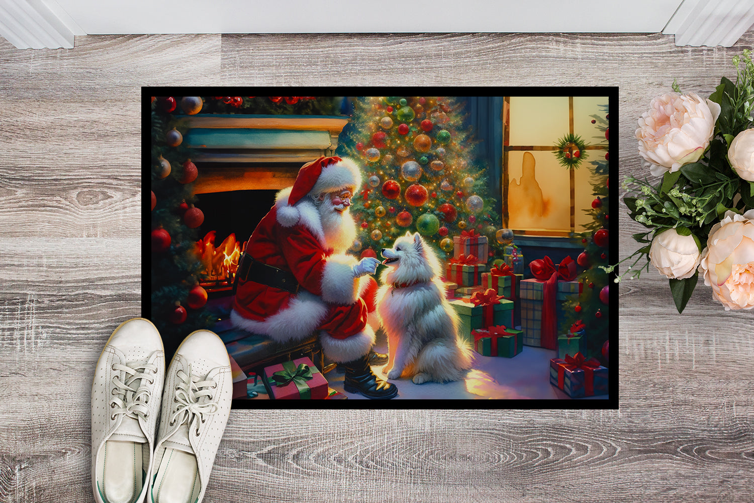 Doormat featuring breed specific American Eskimo artwork. Celebrate Christmas with this Christmas Doormat. Welcome your guests in style with our Artwork Door Mat, designed to withstand almost any weather condition. This mat, measuring approximately 18 by 27 inches, is held together by durable black binding tape. Its top layer, composed of polyester felt, is dyed with the eye-catching image you see on the mat. A few layers below provide the mat with stability, while its rubber bottom is stamped to help prevent slipping and ensures safety. Our mat works wonderfully as both an indoor or outdoor door mat. For cleaning, simply hose it off with water or use a power washer - no need for any cleaner that produces suds. Avoid scrubbing with a brush, instead, opt for the vacuum on floor setting. Designed manufactured and printed in the USA, this mat is a perfect addition to your porch, outdoor kitchen, entryway, or any indoor space. Its unique design makes it a charming decorative rug that greets your guests and adds a stylish touch to your home decor.