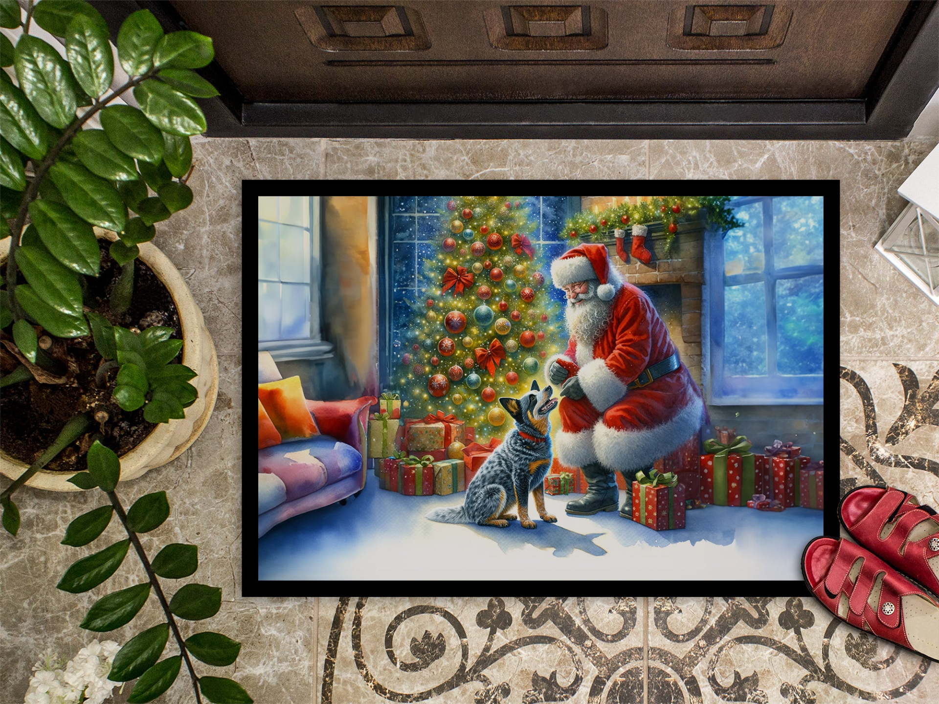 Doormat featuring breed specific Australian Cattle Dog artwork. Celebrate Christmas with this Christmas Doormat. Welcome your guests in style with our Artwork Door Mat, designed to withstand almost any weather condition. This mat, measuring approximately 18 by 27 inches, is held together by durable black binding tape. Its top layer, composed of polyester felt, is dyed with the eye-catching image you see on the mat. A few layers below provide the mat with stability, while its rubber bottom is stamped to help prevent slipping and ensures safety. Our mat works wonderfully as both an indoor or outdoor door mat. For cleaning, simply hose it off with water or use a power washer - no need for any cleaner that produces suds. Avoid scrubbing with a brush, instead, opt for the vacuum on floor setting. Designed manufactured and printed in the USA, this mat is a perfect addition to your porch, outdoor kitchen, entryway, or any indoor space. Its unique design makes it a charming decorative rug that greets your guests and adds a stylish touch to your home decor.