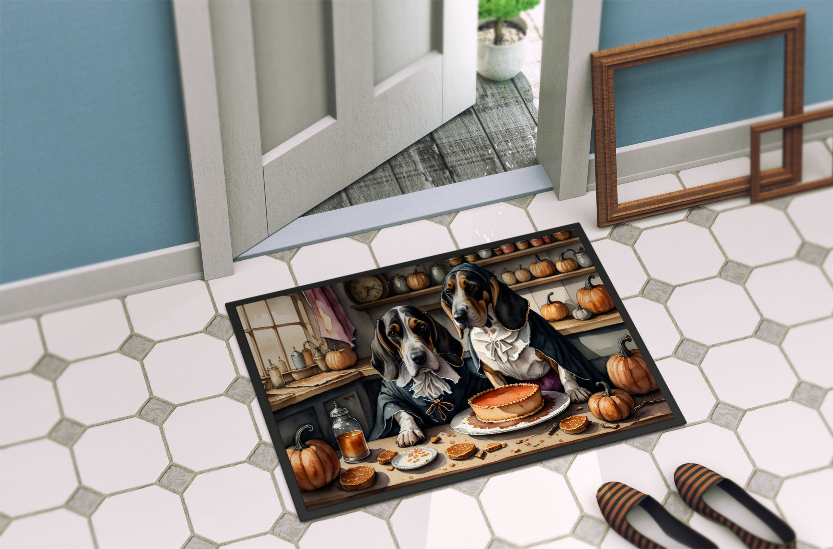 Doormat featuring breed specific Basset Hound artwork. Celebrate Halloween with this Halloween Doormat. Welcome your guests in style with our Artwork Door Mat, designed to withstand almost any weather condition. This mat, measuring approximately 24 by 36 inches, is held together by durable black binding tape. Its top layer, composed of polyester felt, is dyed with the eye-catching image you see on the mat. A few layers below provide the mat with stability, while its rubber bottom is stamped to help prevent slipping and ensures safety. Our mat works wonderfully as both an indoor or outdoor door mat. For cleaning, simply hose it off with water or use a power washer - no need for any cleaner that produces suds. Avoid scrubbing with a brush, instead, opt for the vacuum on floor setting. Designed manufactured and printed in the USA, this mat is a perfect addition to your porch, outdoor kitchen, entryway, or any indoor space. Its unique design makes it a charming decorative rug that greets your guests and adds a stylish touch to your home decor.