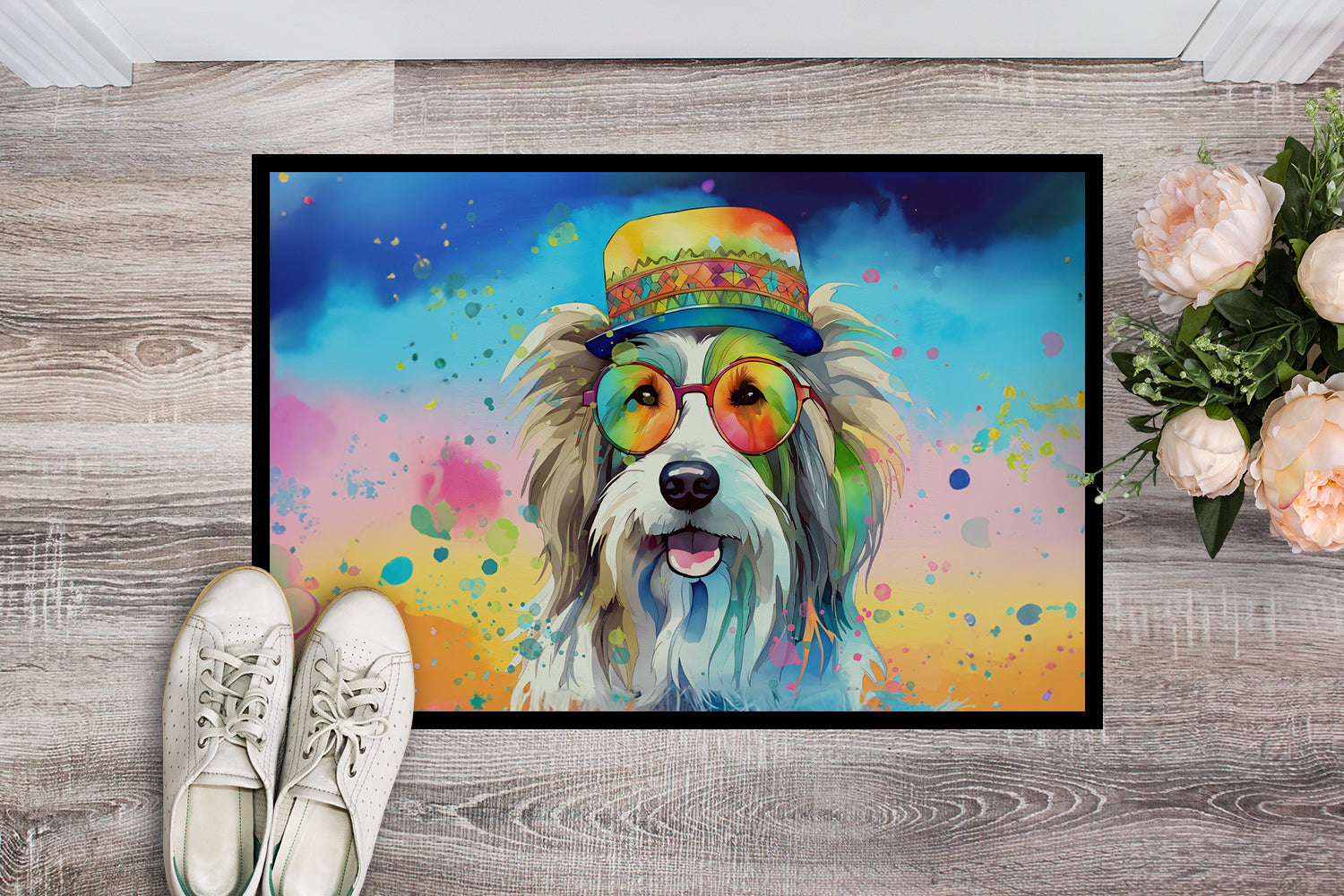 Doormat featuring breed specific Bearded Collie artwork. Welcome your guests in style with our Artwork Door Mat, designed to withstand almost any weather condition. This mat, measuring approximately 18 by 27 inches, is held together by durable black binding tape. Its top layer, composed of polyester felt, is dyed with the eye-catching image you see on the mat. A few layers below provide the mat with stability, while its rubber bottom is stamped to help prevent slipping and ensures safety. Our mat works wonderfully as both an indoor or outdoor door mat. For cleaning, simply hose it off with water or use a power washer - no need for any cleaner that produces suds. Avoid scrubbing with a brush, instead, opt for the vacuum on floor setting. Designed manufactured and printed in the USA, this mat is a perfect addition to your porch, outdoor kitchen, entryway, or any indoor space. Its unique design makes it a charming decorative rug that greets your guests and adds a stylish touch to your home decor.