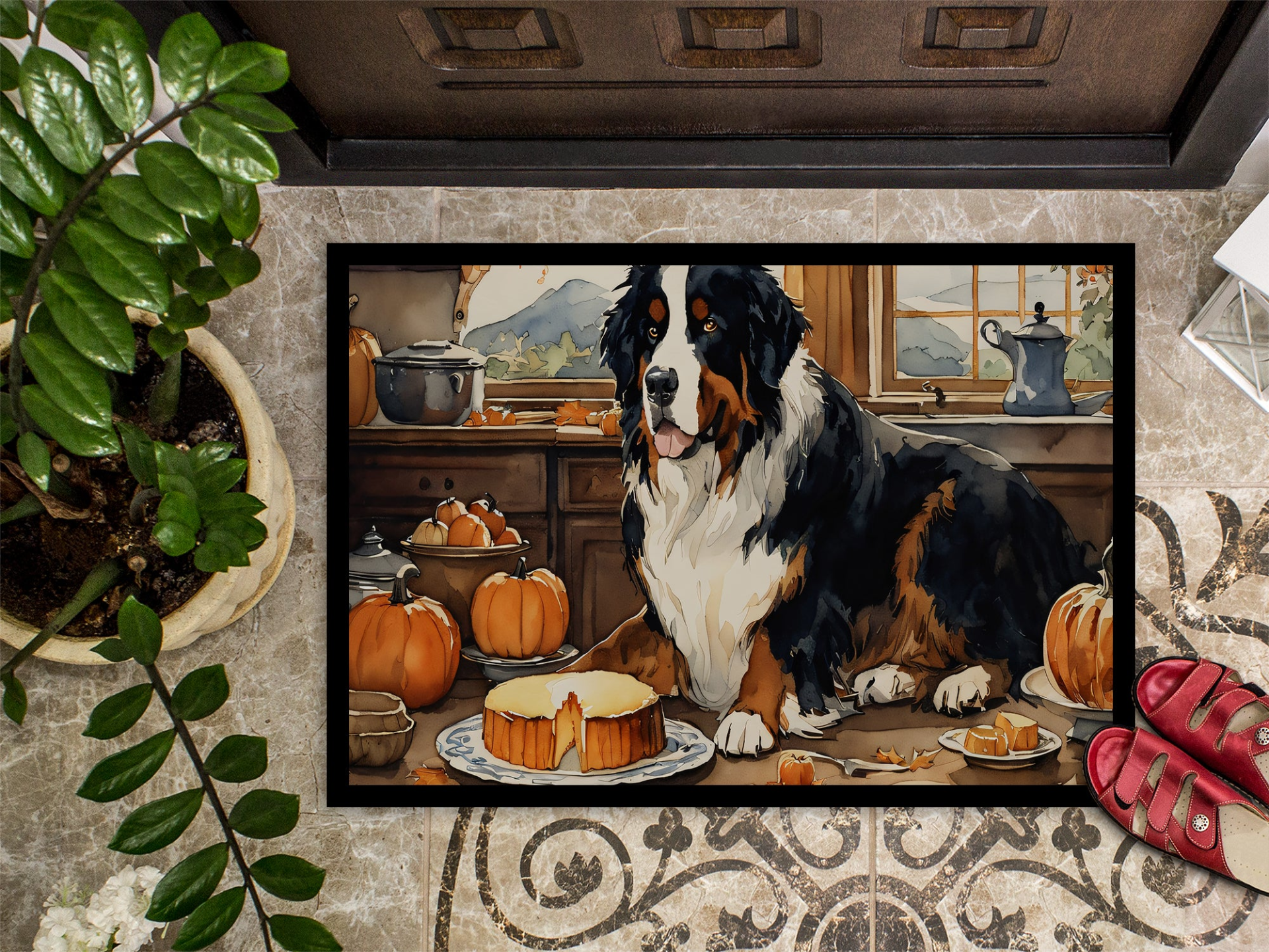Doormat featuring breed specific Bernese Mountain Dog artwork. Celebrate Halloween with this Halloween Doormat. Welcome your guests in style with our Artwork Door Mat, designed to withstand almost any weather condition. This mat, measuring approximately 18 by 27 inches, is held together by durable black binding tape. Its top layer, composed of polyester felt, is dyed with the eye-catching image you see on the mat. A few layers below provide the mat with stability, while its rubber bottom is stamped to help prevent slipping and ensures safety. Our mat works wonderfully as both an indoor or outdoor door mat. For cleaning, simply hose it off with water or use a power washer - no need for any cleaner that produces suds. Avoid scrubbing with a brush, instead, opt for the vacuum on floor setting. Designed manufactured and printed in the USA, this mat is a perfect addition to your porch, outdoor kitchen, entryway, or any indoor space. Its unique design makes it a charming decorative rug that greets your guests and adds a stylish touch to your home decor.
