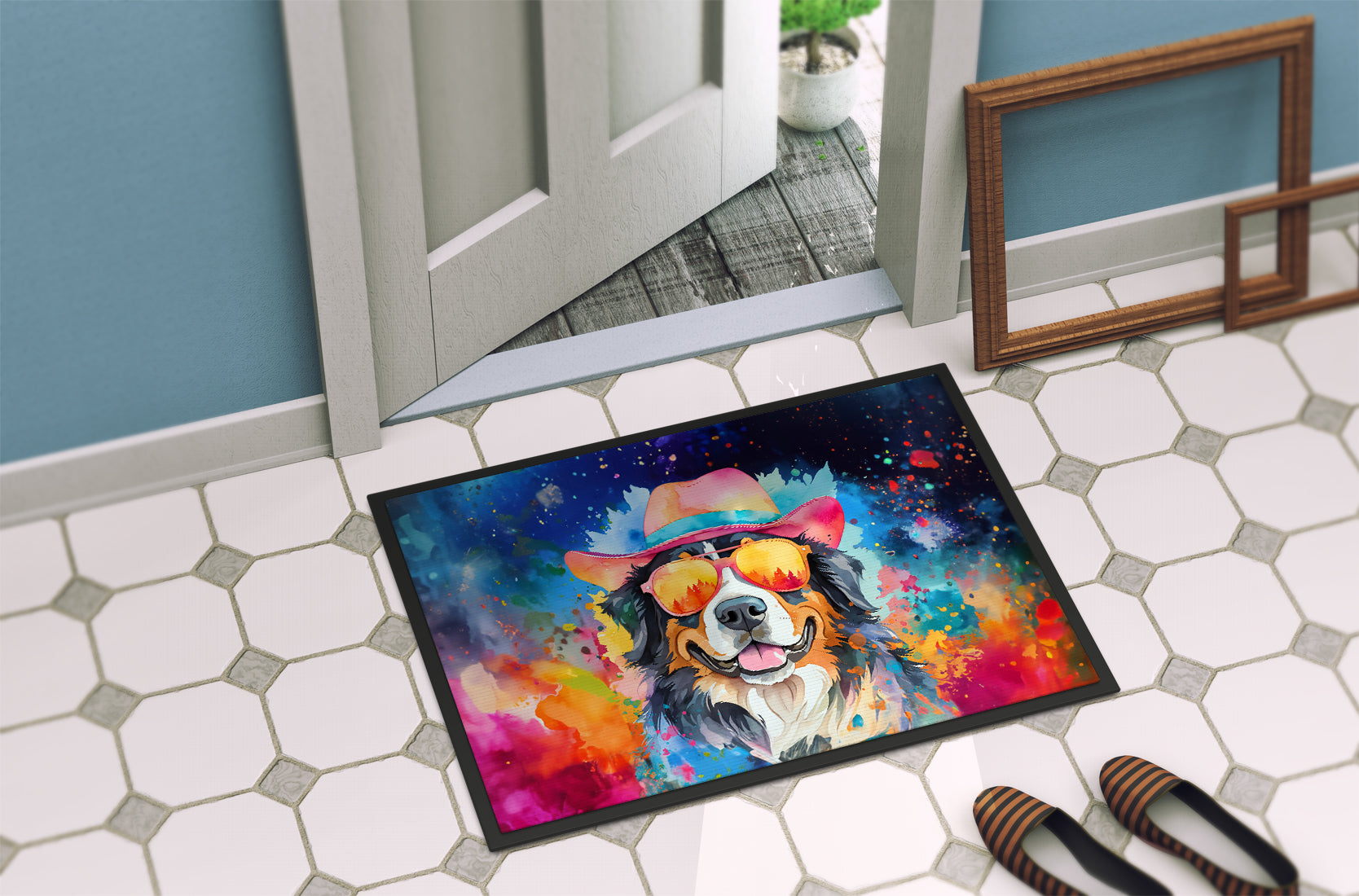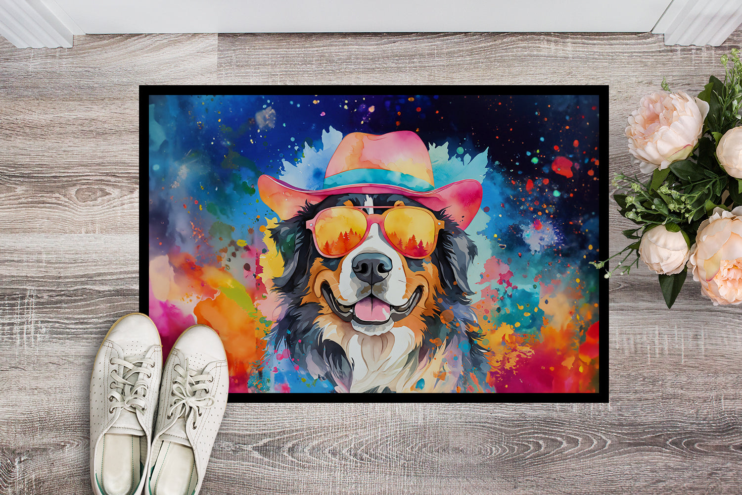 Doormat featuring breed specific Bernese Mountain Dog artwork. Welcome your guests in style with our Artwork Door Mat, designed to withstand almost any weather condition. This mat, measuring approximately 18 by 27 inches, is held together by durable black binding tape. Its top layer, composed of polyester felt, is dyed with the eye-catching image you see on the mat. A few layers below provide the mat with stability, while its rubber bottom is stamped to help prevent slipping and ensures safety. Our mat works wonderfully as both an indoor or outdoor door mat. For cleaning, simply hose it off with water or use a power washer - no need for any cleaner that produces suds. Avoid scrubbing with a brush, instead, opt for the vacuum on floor setting. Designed manufactured and printed in the USA, this mat is a perfect addition to your porch, outdoor kitchen, entryway, or any indoor space. Its unique design makes it a charming decorative rug that greets your guests and adds a stylish touch to your home decor.