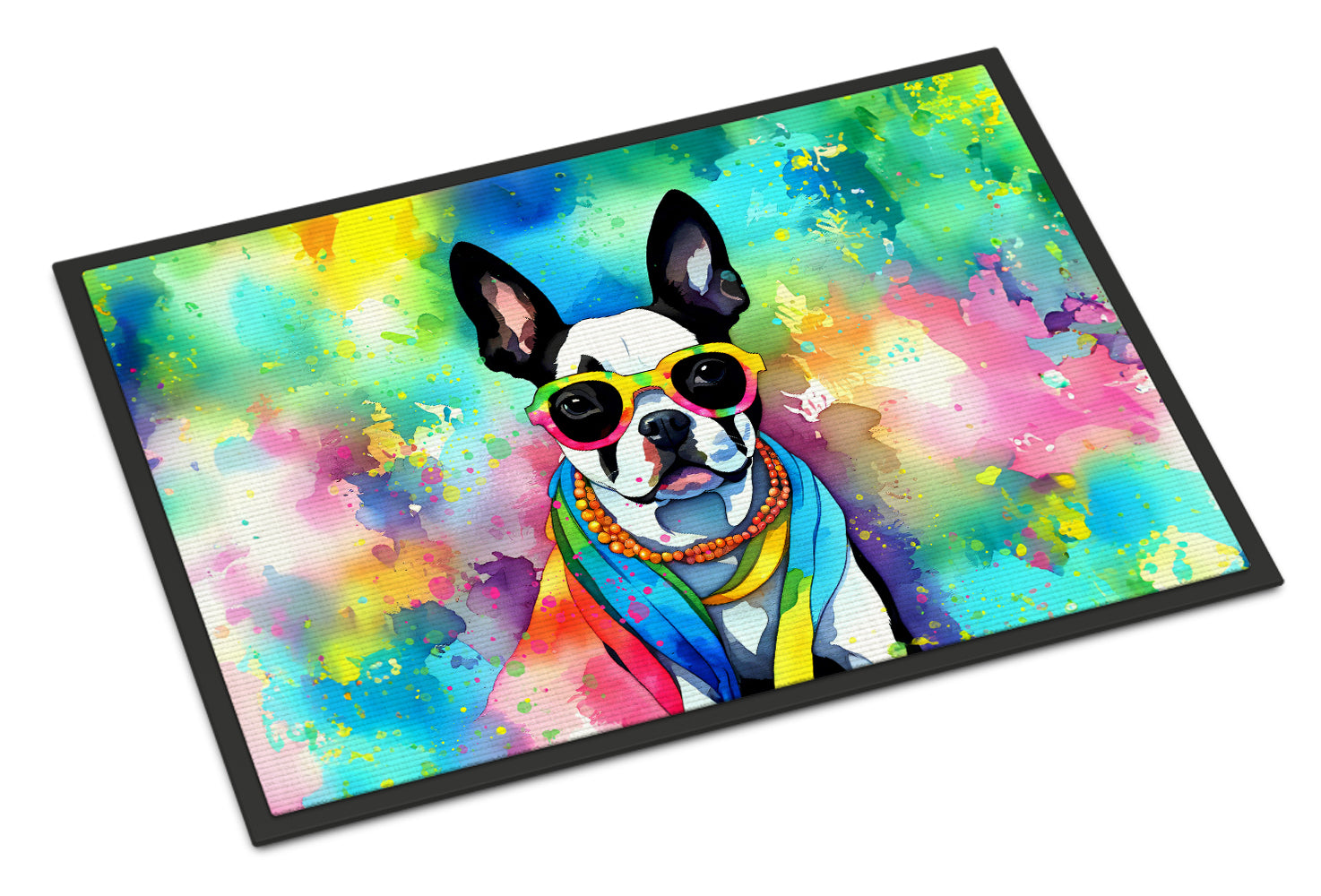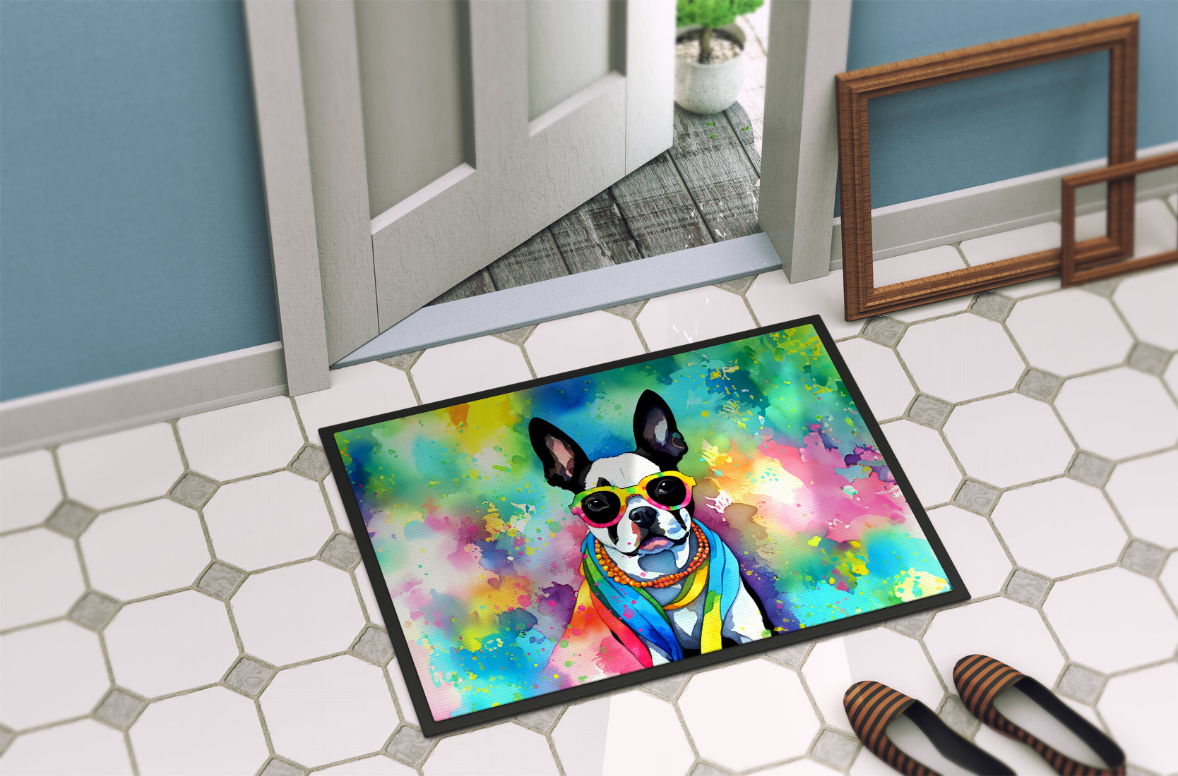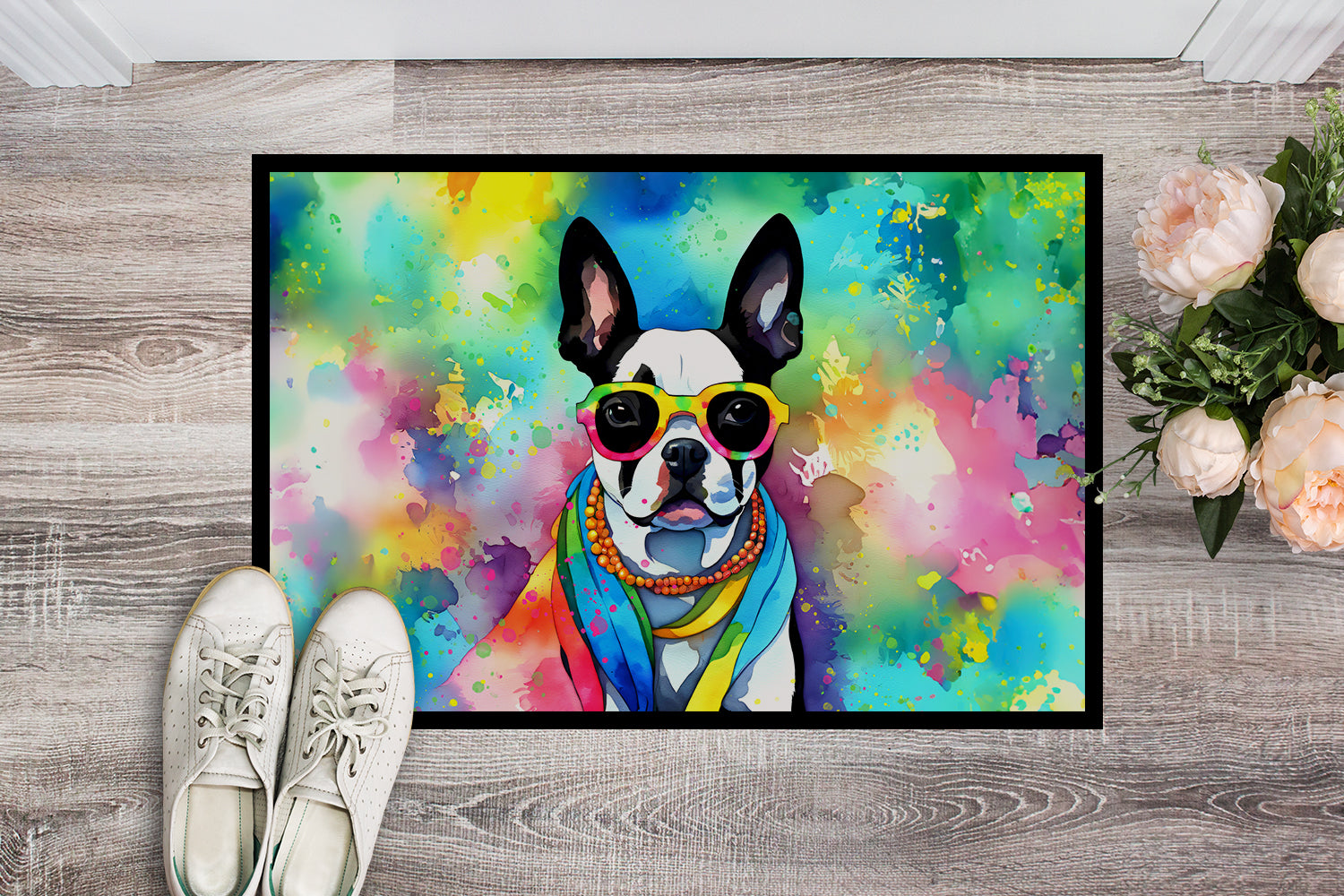 Doormat featuring breed specific Boston Terrier artwork. Welcome your guests in style with our Artwork Door Mat, designed to withstand almost any weather condition. This mat, measuring approximately 24 by 36 inches, is held together by durable black binding tape. Its top layer, composed of polyester felt, is dyed with the eye-catching image you see on the mat. A few layers below provide the mat with stability, while its rubber bottom is stamped to help prevent slipping and ensures safety. Our mat works wonderfully as both an indoor or outdoor door mat. For cleaning, simply hose it off with water or use a power washer - no need for any cleaner that produces suds. Avoid scrubbing with a brush, instead, opt for the vacuum on floor setting. Designed manufactured and printed in the USA, this mat is a perfect addition to your porch, outdoor kitchen, entryway, or any indoor space. Its unique design makes it a charming decorative rug that greets your guests and adds a stylish touch to your home decor.