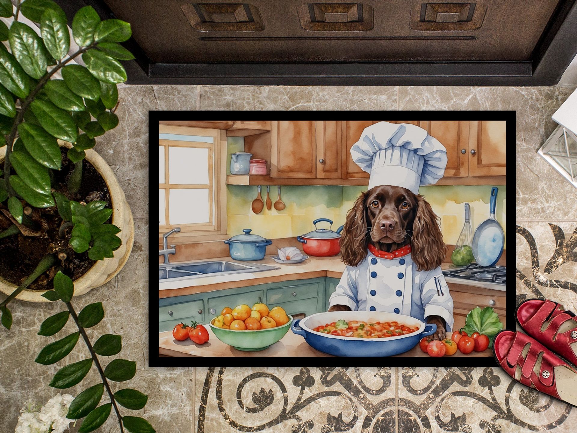 Doormat featuring breed specific Boykin Spaniel artwork. Welcome your guests in style with our Artwork Door Mat, designed to withstand almost any weather condition. This mat, measuring approximately 18 by 27 inches, is held together by durable black binding tape. Its top layer, composed of polyester felt, is dyed with the eye-catching image you see on the mat. A few layers below provide the mat with stability, while its rubber bottom is stamped to help prevent slipping and ensures safety. Our mat works wonderfully as both an indoor or outdoor door mat. For cleaning, simply hose it off with water or use a power washer - no need for any cleaner that produces suds. Avoid scrubbing with a brush, instead, opt for the vacuum on floor setting. Designed manufactured and printed in the USA, this mat is a perfect addition to your porch, outdoor kitchen, entryway, or any indoor space. Its unique design makes it a charming decorative rug that greets your guests and adds a stylish touch to your home decor.