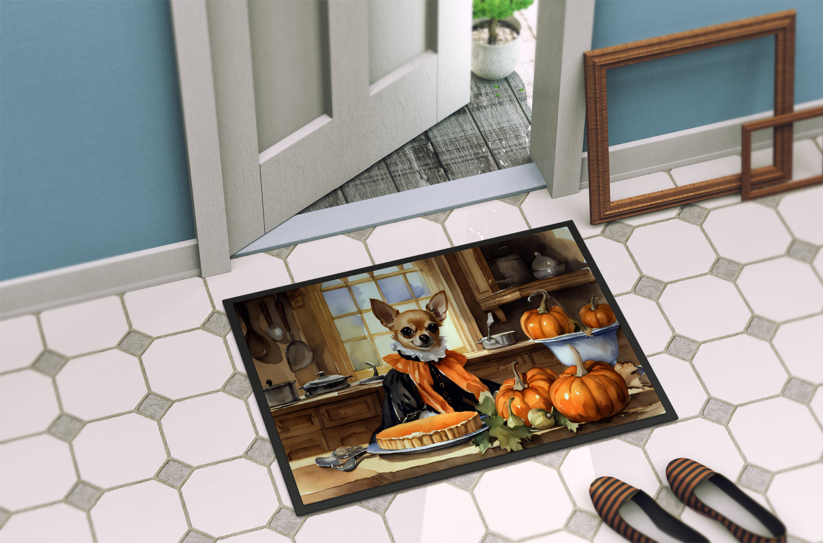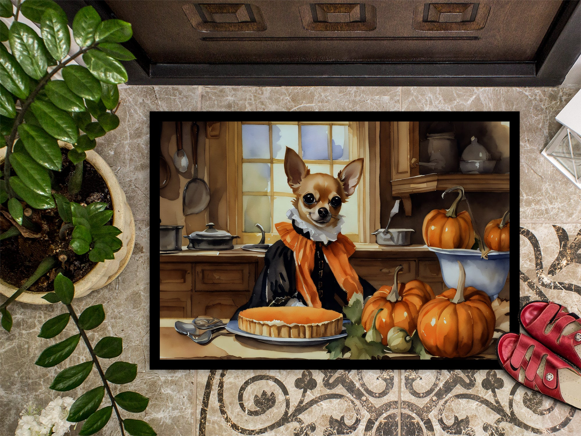 Doormat featuring breed specific Chihuahua artwork. Celebrate Halloween with this Halloween Doormat. Welcome your guests in style with our Artwork Door Mat, designed to withstand almost any weather condition. This mat, measuring approximately 24 by 36 inches, is held together by durable black binding tape. Its top layer, composed of polyester felt, is dyed with the eye-catching image you see on the mat. A few layers below provide the mat with stability, while its rubber bottom is stamped to help prevent slipping and ensures safety. Our mat works wonderfully as both an indoor or outdoor door mat. For cleaning, simply hose it off with water or use a power washer - no need for any cleaner that produces suds. Avoid scrubbing with a brush, instead, opt for the vacuum on floor setting. Designed manufactured and printed in the USA, this mat is a perfect addition to your porch, outdoor kitchen, entryway, or any indoor space. Its unique design makes it a charming decorative rug that greets your guests and adds a stylish touch to your home decor.