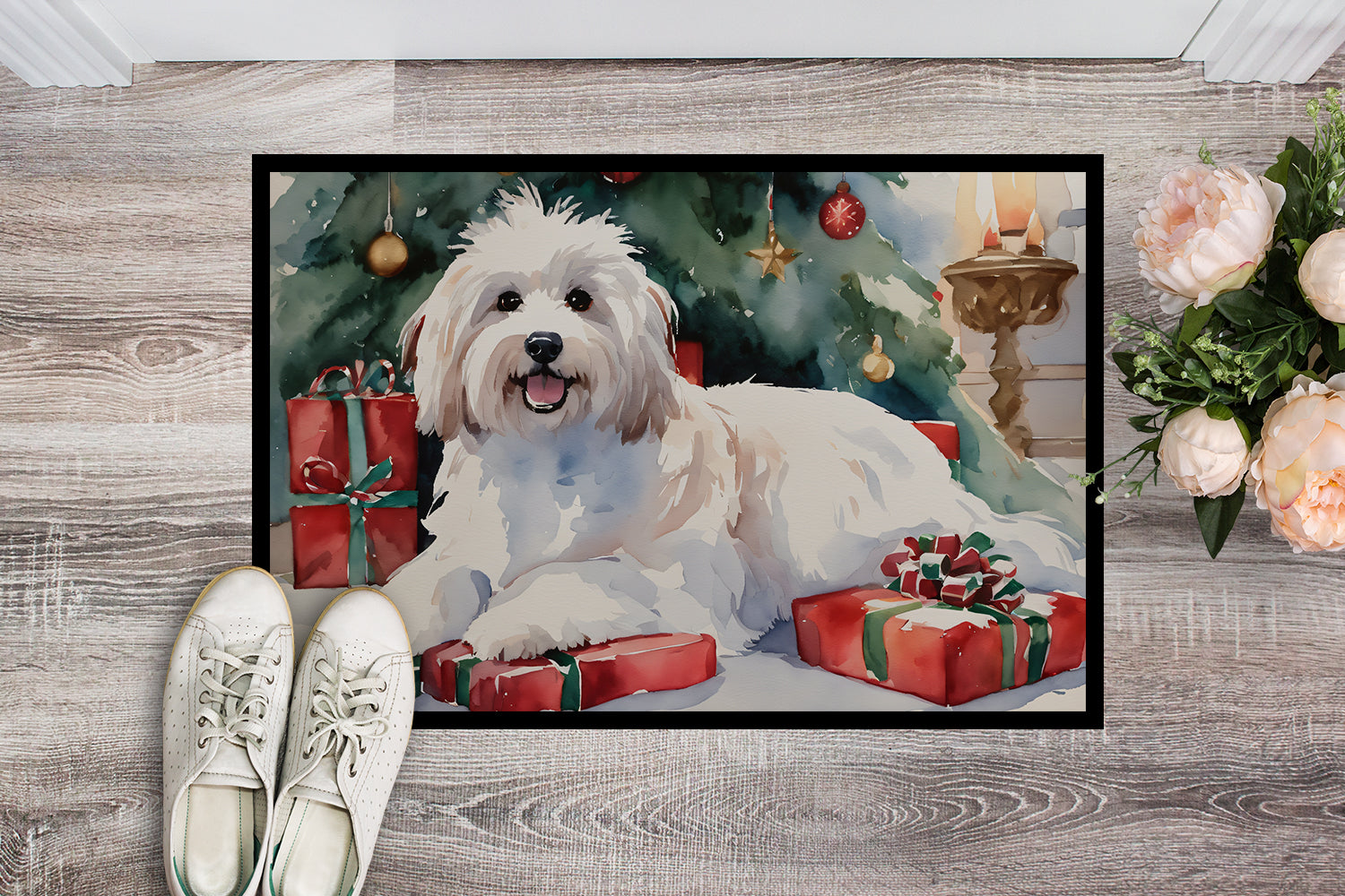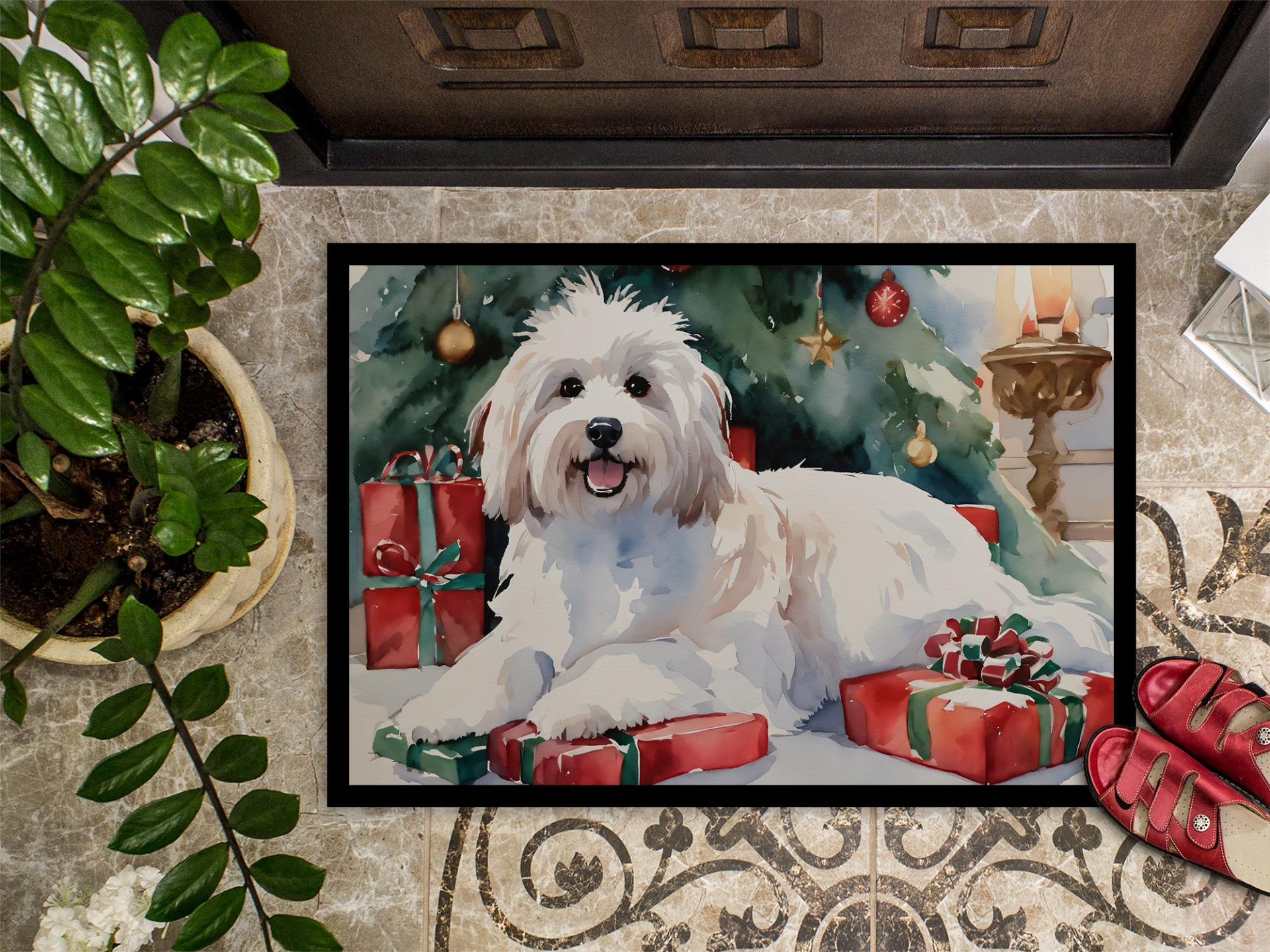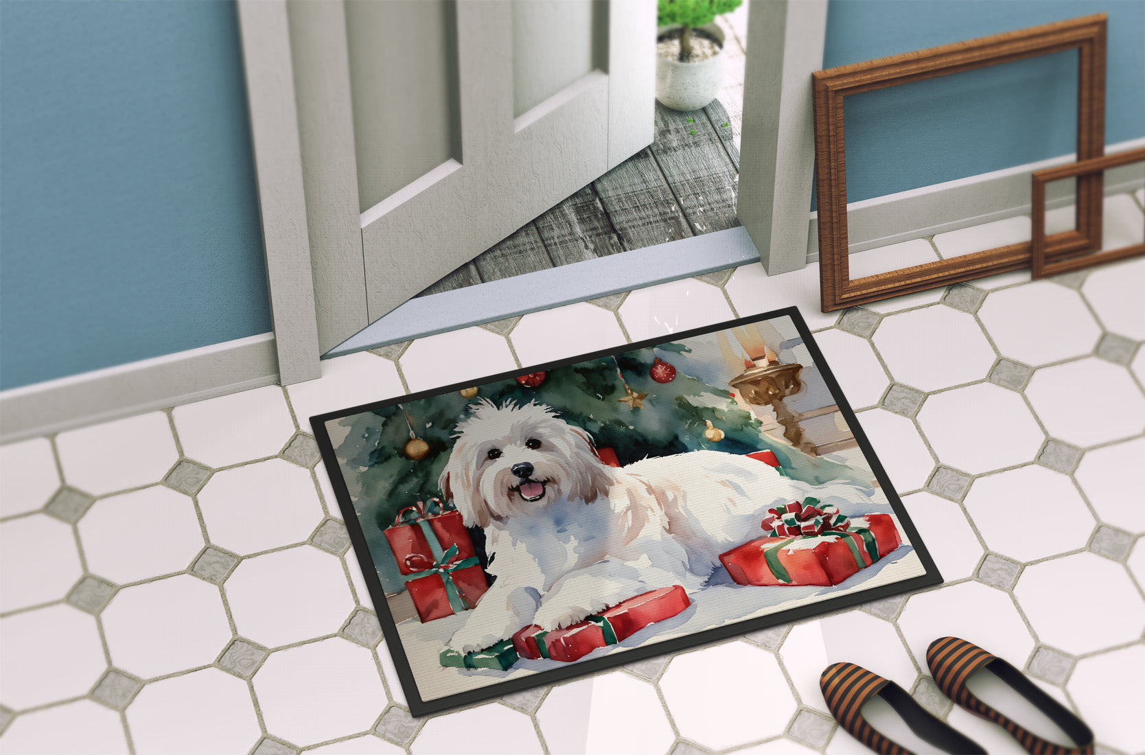 Doormat featuring breed specific Coton De Tulear artwork. Celebrate Christmas with this Christmas Doormat. Welcome your guests in style with our Artwork Door Mat, designed to withstand almost any weather condition. This mat, measuring approximately 24 by 36 inches, is held together by durable black binding tape. Its top layer, composed of polyester felt, is dyed with the eye-catching image you see on the mat. A few layers below provide the mat with stability, while its rubber bottom is stamped to help prevent slipping and ensures safety. Our mat works wonderfully as both an indoor or outdoor door mat. For cleaning, simply hose it off with water or use a power washer - no need for any cleaner that produces suds. Avoid scrubbing with a brush, instead, opt for the vacuum on floor setting. Designed manufactured and printed in the USA, this mat is a perfect addition to your porch, outdoor kitchen, entryway, or any indoor space. Its unique design makes it a charming decorative rug that greets your guests and adds a stylish touch to your home decor.