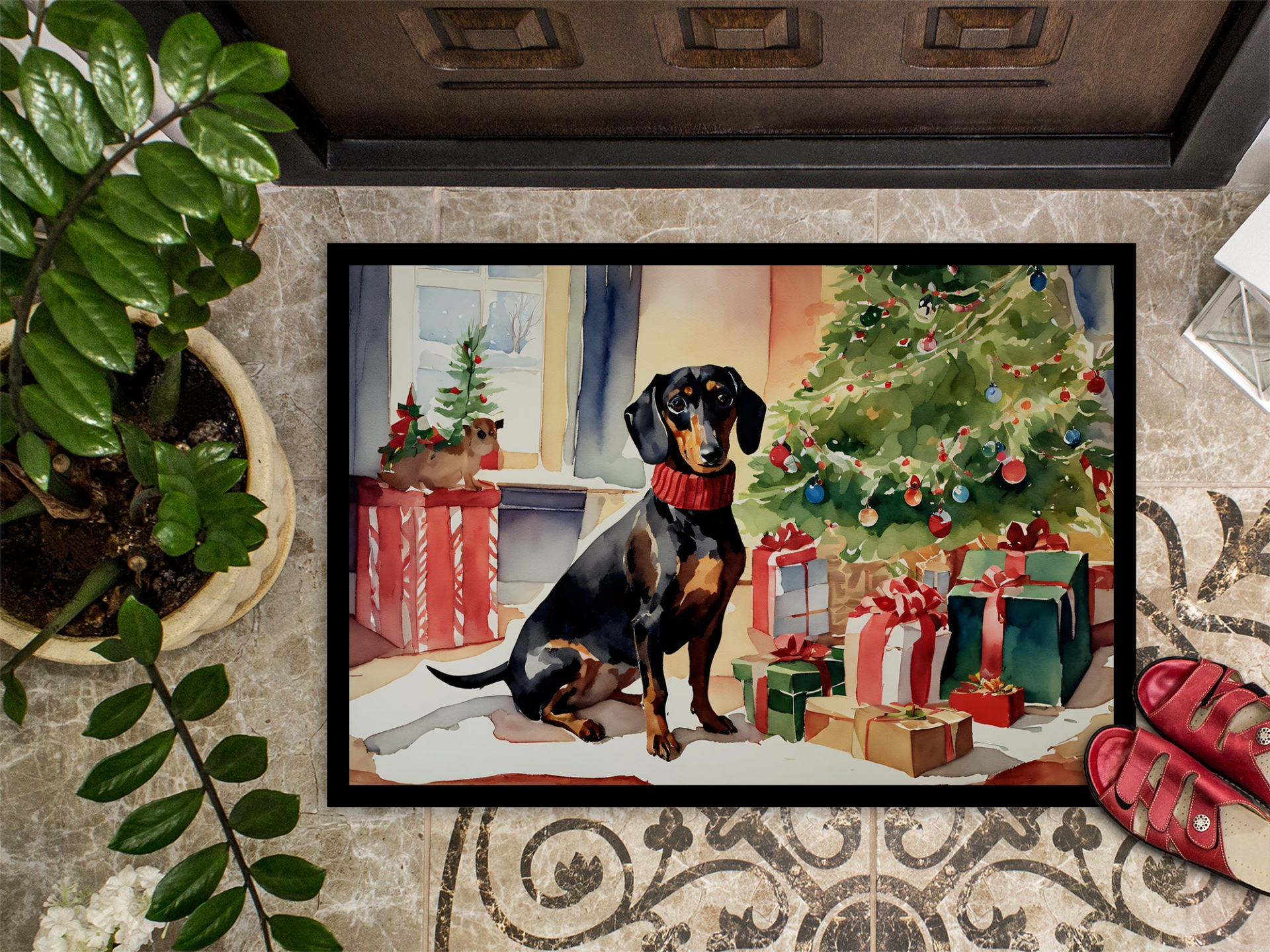 Doormat featuring breed specific Dachshund artwork. Celebrate Christmas with this Christmas Doormat. Welcome your guests in style with our Artwork Door Mat, designed to withstand almost any weather condition. This mat, measuring approximately 24 by 36 inches, is held together by durable black binding tape. Its top layer, composed of polyester felt, is dyed with the eye-catching image you see on the mat. A few layers below provide the mat with stability, while its rubber bottom is stamped to help prevent slipping and ensures safety. Our mat works wonderfully as both an indoor or outdoor door mat. For cleaning, simply hose it off with water or use a power washer - no need for any cleaner that produces suds. Avoid scrubbing with a brush, instead, opt for the vacuum on floor setting. Designed manufactured and printed in the USA, this mat is a perfect addition to your porch, outdoor kitchen, entryway, or any indoor space. Its unique design makes it a charming decorative rug that greets your guests and adds a stylish touch to your home decor.