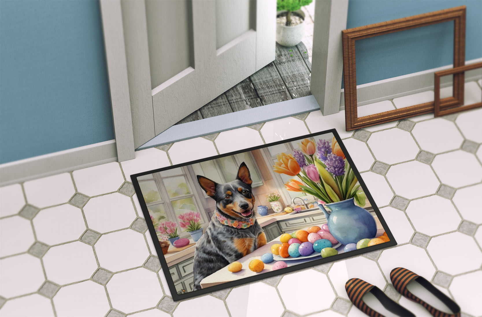 Doormat featuring breed specific Australian Cattle Dog artwork. Celebrate Easter with this Easter Doormat. Welcome your guests in style with our Artwork Door Mat, designed to withstand almost any weather condition. This mat, measuring approximately 18 by 27 inches, is held together by durable black binding tape. Its top layer, composed of polyester felt, is dyed with the eye-catching image you see on the mat. A few layers below provide the mat with stability, while its rubber bottom is stamped to help prevent slipping and ensures safety. Our mat works wonderfully as both an indoor or outdoor door mat. For cleaning, simply hose it off with water or use a power washer - no need for any cleaner that produces suds. Avoid scrubbing with a brush, instead, opt for the vacuum on floor setting. Designed manufactured and printed in the USA, this mat is a perfect addition to your porch, outdoor kitchen, entryway, or any indoor space. Its unique design makes it a charming decorative rug that greets your guests and adds a stylish touch to your home decor.
