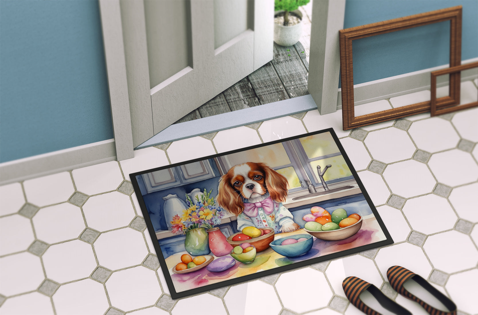 Doormat featuring breed specific Cavalier King Charles Spaniel artwork. Celebrate Easter with this Easter Doormat. Welcome your guests in style with our Artwork Door Mat, designed to withstand almost any weather condition. This mat, measuring approximately 18 by 27 inches, is held together by durable black binding tape. Its top layer, composed of polyester felt, is dyed with the eye-catching image you see on the mat. A few layers below provide the mat with stability, while its rubber bottom is stamped to help prevent slipping and ensures safety. Our mat works wonderfully as both an indoor or outdoor door mat. For cleaning, simply hose it off with water or use a power washer - no need for any cleaner that produces suds. Avoid scrubbing with a brush, instead, opt for the vacuum on floor setting. Designed manufactured and printed in the USA, this mat is a perfect addition to your porch, outdoor kitchen, entryway, or any indoor space. Its unique design makes it a charming decorative rug that greets your guests and adds a stylish touch to your home decor.