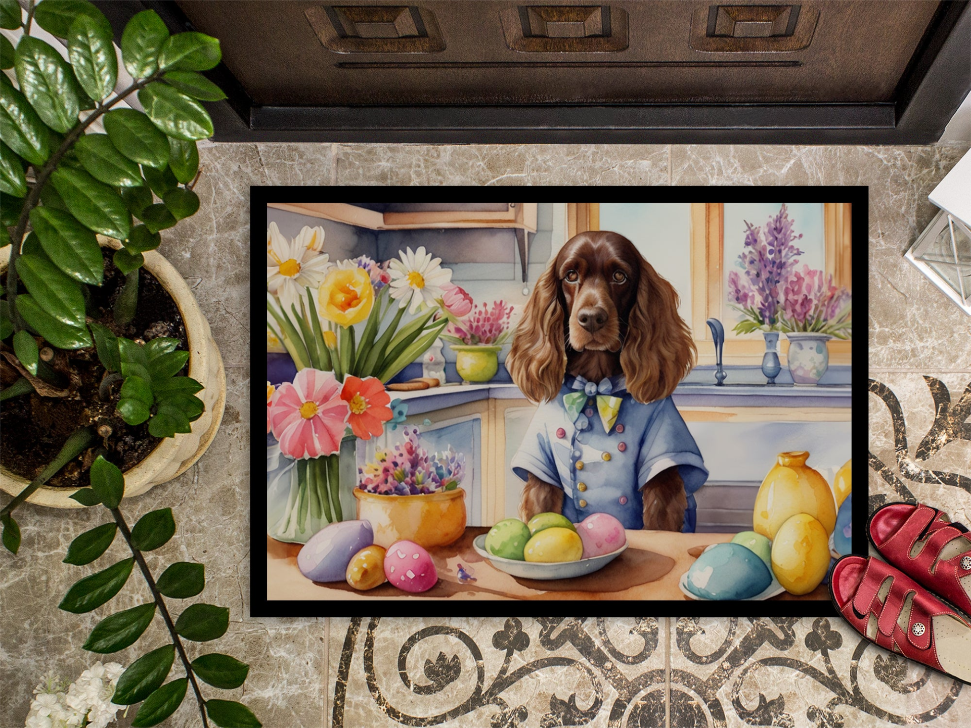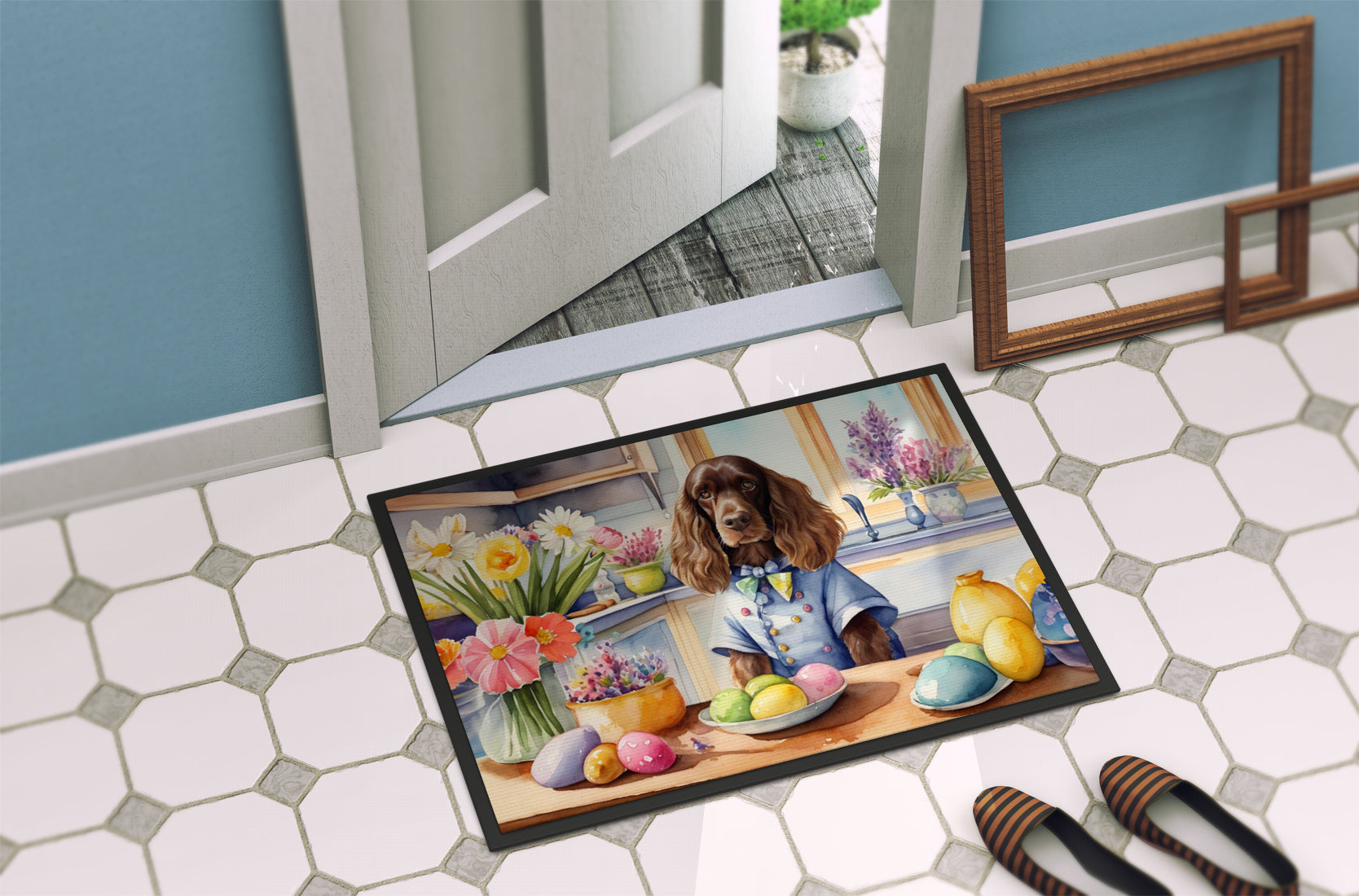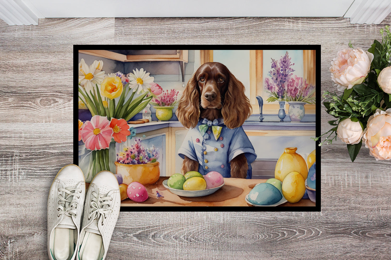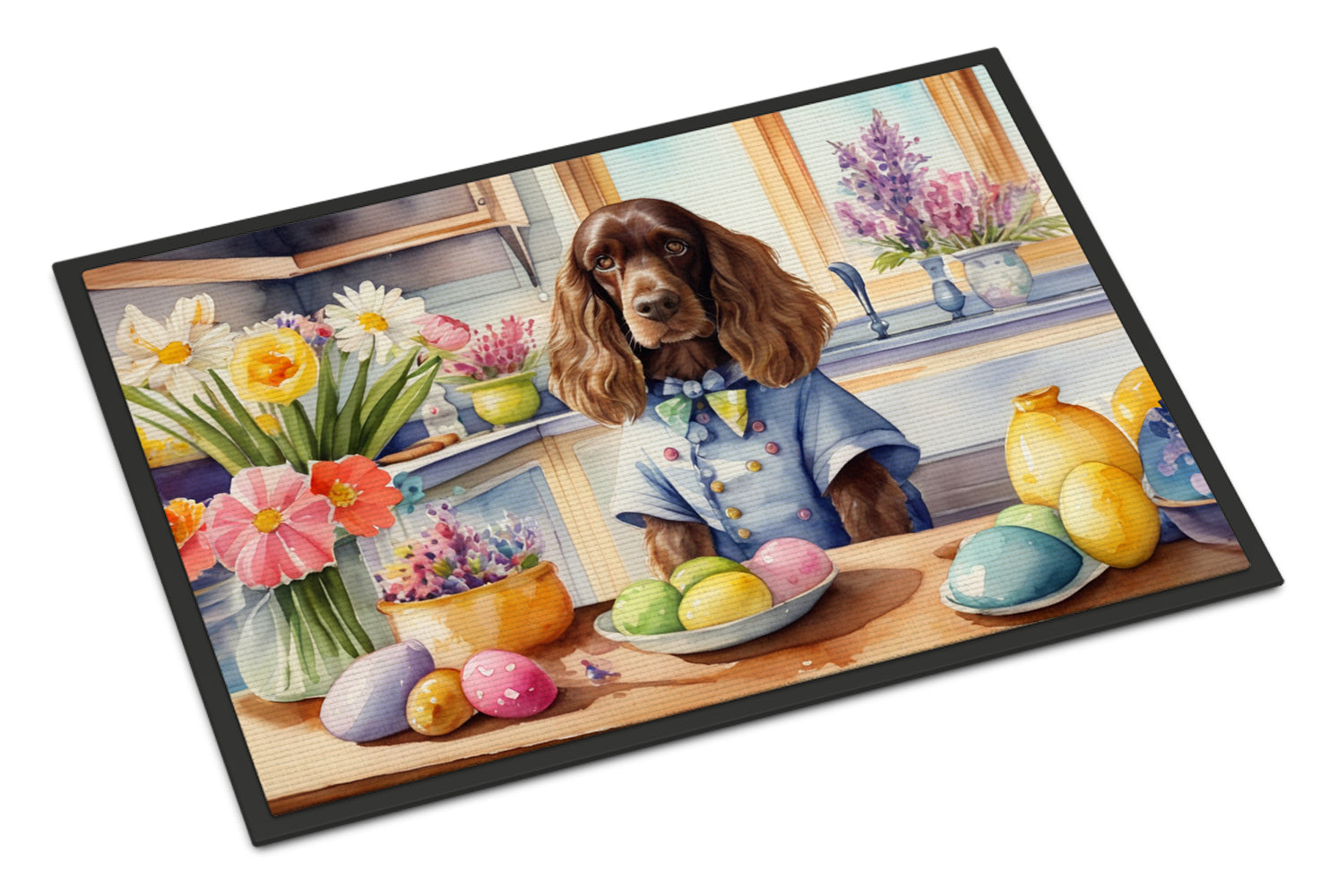 Doormat featuring breed specific English Cocker Spaniel artwork. Celebrate Easter with this Easter Doormat. Welcome your guests in style with our Artwork Door Mat, designed to withstand almost any weather condition. This mat, measuring approximately 18 by 27 inches, is held together by durable black binding tape. Its top layer, composed of polyester felt, is dyed with the eye-catching image you see on the mat. A few layers below provide the mat with stability, while its rubber bottom is stamped to help prevent slipping and ensures safety. Our mat works wonderfully as both an indoor or outdoor door mat. For cleaning, simply hose it off with water or use a power washer - no need for any cleaner that produces suds. Avoid scrubbing with a brush, instead, opt for the vacuum on floor setting. Designed manufactured and printed in the USA, this mat is a perfect addition to your porch, outdoor kitchen, entryway, or any indoor space. Its unique design makes it a charming decorative rug that greets your guests and adds a stylish touch to your home decor.