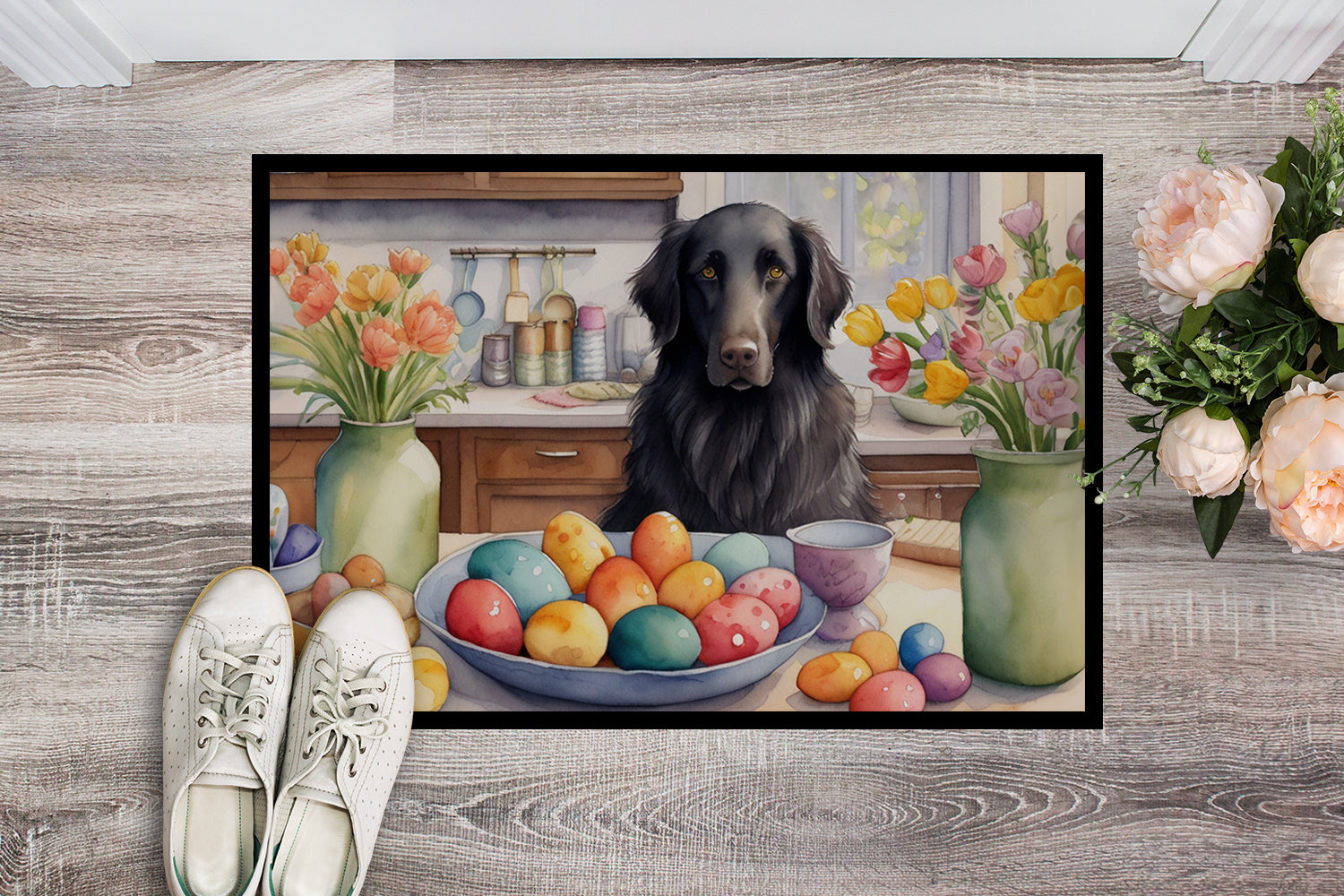Doormat featuring breed specific Flat-Coated Retriever artwork. Celebrate Easter with this Easter Doormat. Welcome your guests in style with our Artwork Door Mat, designed to withstand almost any weather condition. This mat, measuring approximately 18 by 27 inches, is held together by durable black binding tape. Its top layer, composed of polyester felt, is dyed with the eye-catching image you see on the mat. A few layers below provide the mat with stability, while its rubber bottom is stamped to help prevent slipping and ensures safety. Our mat works wonderfully as both an indoor or outdoor door mat. For cleaning, simply hose it off with water or use a power washer - no need for any cleaner that produces suds. Avoid scrubbing with a brush, instead, opt for the vacuum on floor setting. Designed manufactured and printed in the USA, this mat is a perfect addition to your porch, outdoor kitchen, entryway, or any indoor space. Its unique design makes it a charming decorative rug that greets your guests and adds a stylish touch to your home decor.