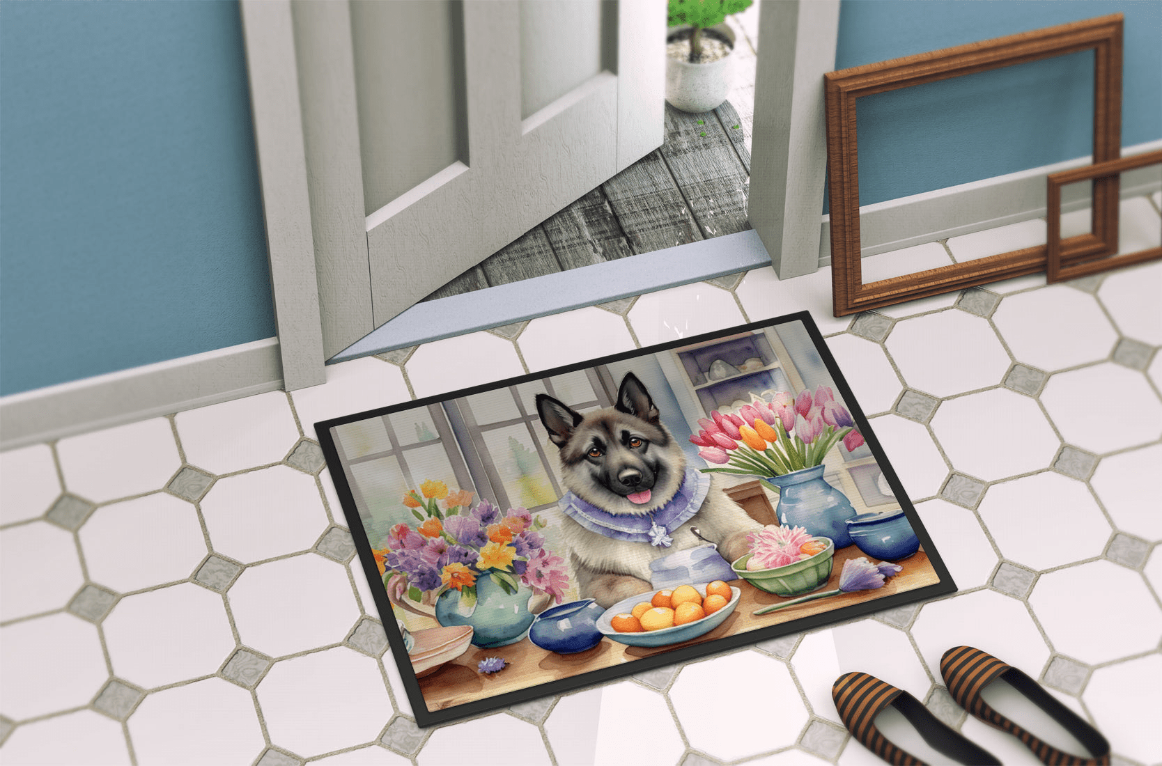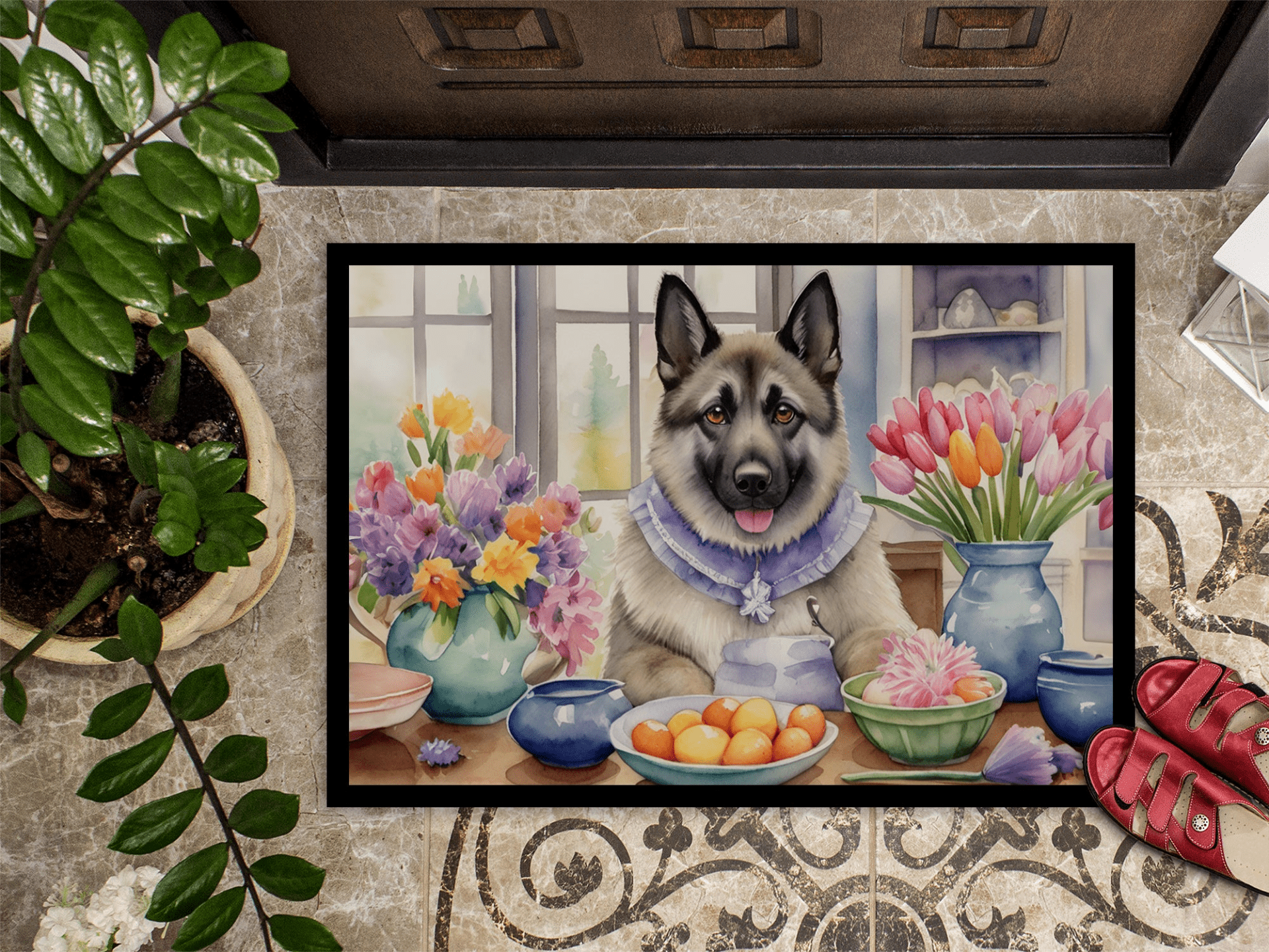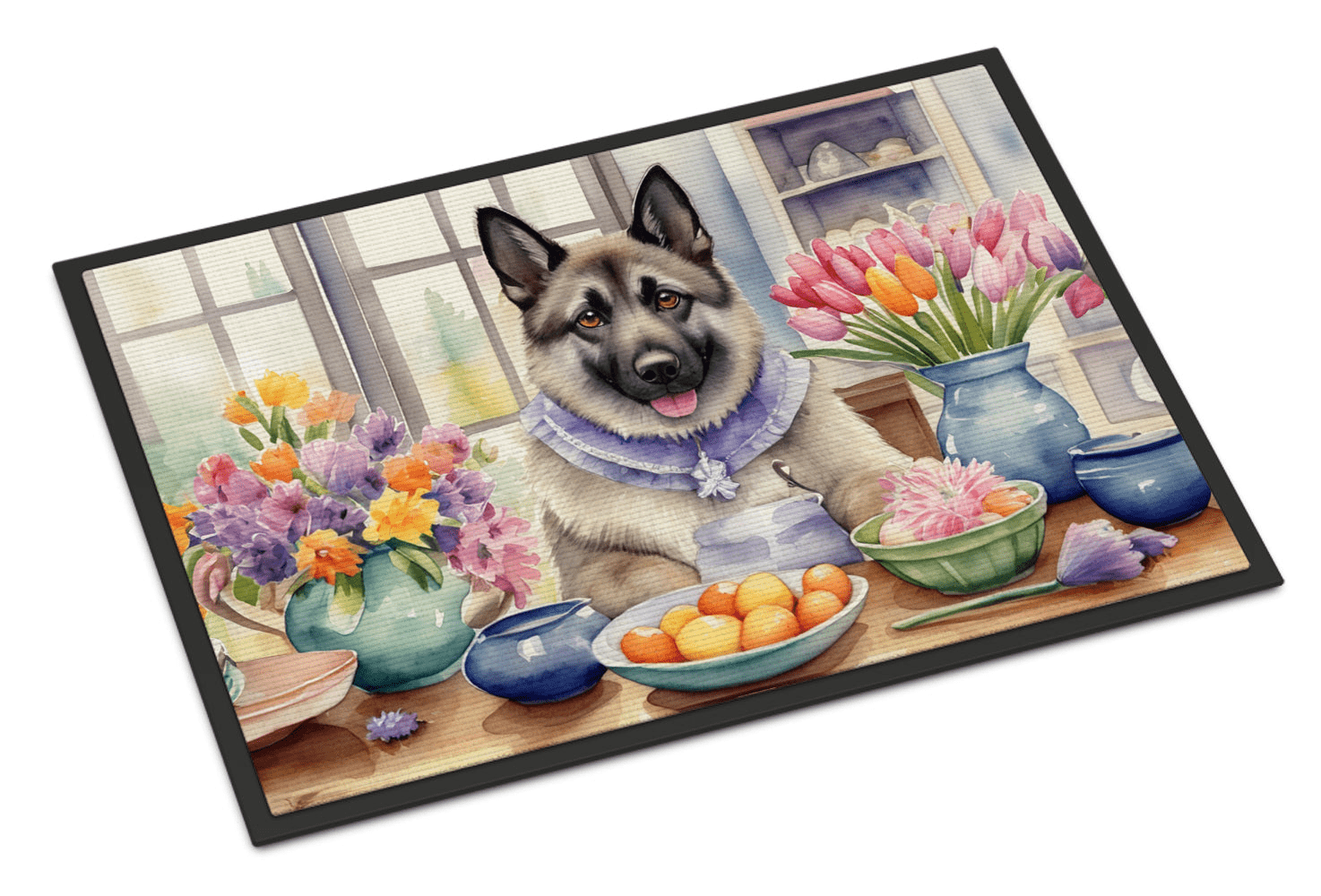 Doormat featuring breed specific Norwegian Elkhound artwork. Celebrate Easter with this Easter Doormat. Welcome your guests in style with our Artwork Door Mat, designed to withstand almost any weather condition. This mat, measuring approximately 18 by 27 inches, is held together by durable black binding tape. Its top layer, composed of polyester felt, is dyed with the eye-catching image you see on the mat. A few layers below provide the mat with stability, while its rubber bottom is stamped to help prevent slipping and ensures safety. Our mat works wonderfully as both an indoor or outdoor door mat. For cleaning, simply hose it off with water or use a power washer - no need for any cleaner that produces suds. Avoid scrubbing with a brush, instead, opt for the vacuum on floor setting. Designed manufactured and printed in the USA, this mat is a perfect addition to your porch, outdoor kitchen, entryway, or any indoor space. Its unique design makes it a charming decorative rug that greets your guests and adds a stylish touch to your home decor.