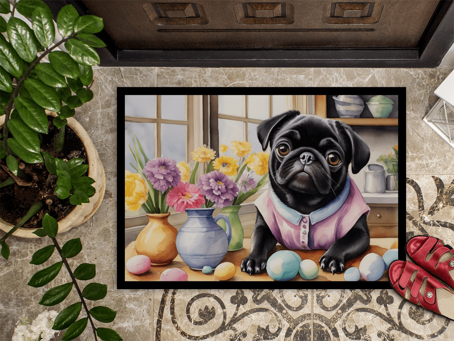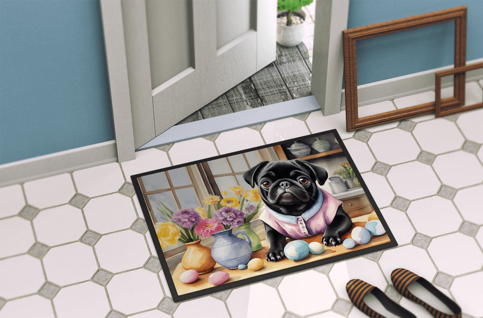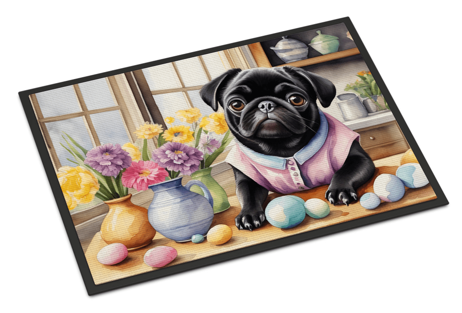 Doormat featuring breed specific Pug artwork. Celebrate Easter with this Easter Doormat. Welcome your guests in style with our Artwork Door Mat, designed to withstand almost any weather condition. This mat, measuring approximately 18 by 27 inches, is held together by durable black binding tape. Its top layer, composed of polyester felt, is dyed with the eye-catching image you see on the mat. A few layers below provide the mat with stability, while its rubber bottom is stamped to help prevent slipping and ensures safety. Our mat works wonderfully as both an indoor or outdoor door mat. For cleaning, simply hose it off with water or use a power washer - no need for any cleaner that produces suds. Avoid scrubbing with a brush, instead, opt for the vacuum on floor setting. Designed manufactured and printed in the USA, this mat is a perfect addition to your porch, outdoor kitchen, entryway, or any indoor space. Its unique design makes it a charming decorative rug that greets your guests and adds a stylish touch to your home decor.