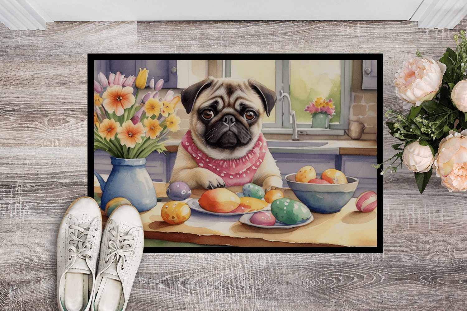 Doormat featuring breed specific Pug artwork. Celebrate Easter with this Easter Doormat. Welcome your guests in style with our Artwork Door Mat, designed to withstand almost any weather condition. This mat, measuring approximately 18 by 27 inches, is held together by durable black binding tape. Its top layer, composed of polyester felt, is dyed with the eye-catching image you see on the mat. A few layers below provide the mat with stability, while its rubber bottom is stamped to help prevent slipping and ensures safety. Our mat works wonderfully as both an indoor or outdoor door mat. For cleaning, simply hose it off with water or use a power washer - no need for any cleaner that produces suds. Avoid scrubbing with a brush, instead, opt for the vacuum on floor setting. Designed manufactured and printed in the USA, this mat is a perfect addition to your porch, outdoor kitchen, entryway, or any indoor space. Its unique design makes it a charming decorative rug that greets your guests and adds a stylish touch to your home decor.