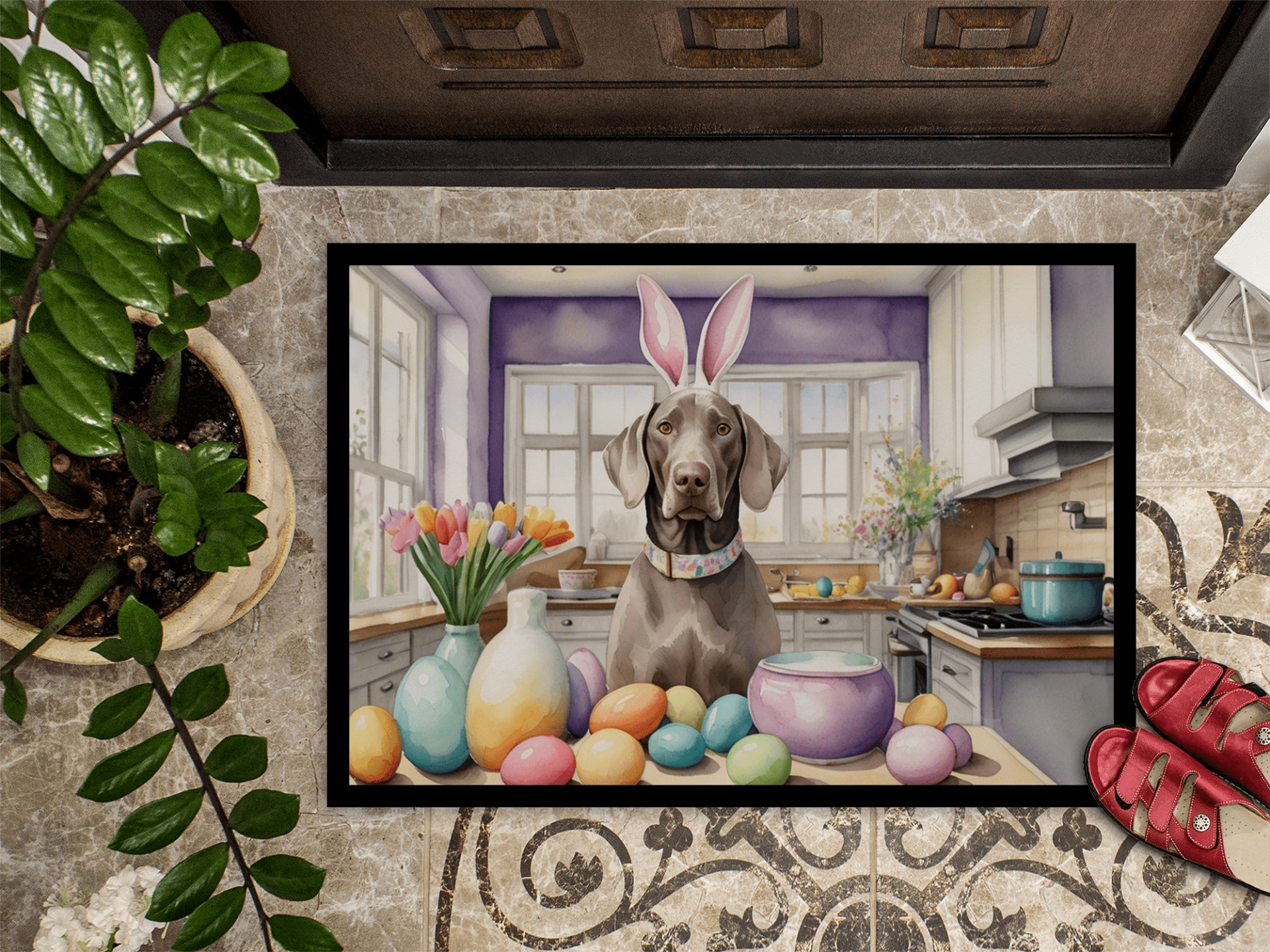 Doormat featuring breed specific Weimaraner artwork. Celebrate Easter with this Easter Doormat. Welcome your guests in style with our Artwork Door Mat, designed to withstand almost any weather condition. This mat, measuring approximately 18 by 27 inches, is held together by durable black binding tape. Its top layer, composed of polyester felt, is dyed with the eye-catching image you see on the mat. A few layers below provide the mat with stability, while its rubber bottom is stamped to help prevent slipping and ensures safety. Our mat works wonderfully as both an indoor or outdoor door mat. For cleaning, simply hose it off with water or use a power washer - no need for any cleaner that produces suds. Avoid scrubbing with a brush, instead, opt for the vacuum on floor setting. Designed manufactured and printed in the USA, this mat is a perfect addition to your porch, outdoor kitchen, entryway, or any indoor space. Its unique design makes it a charming decorative rug that greets your guests and adds a stylish touch to your home decor.