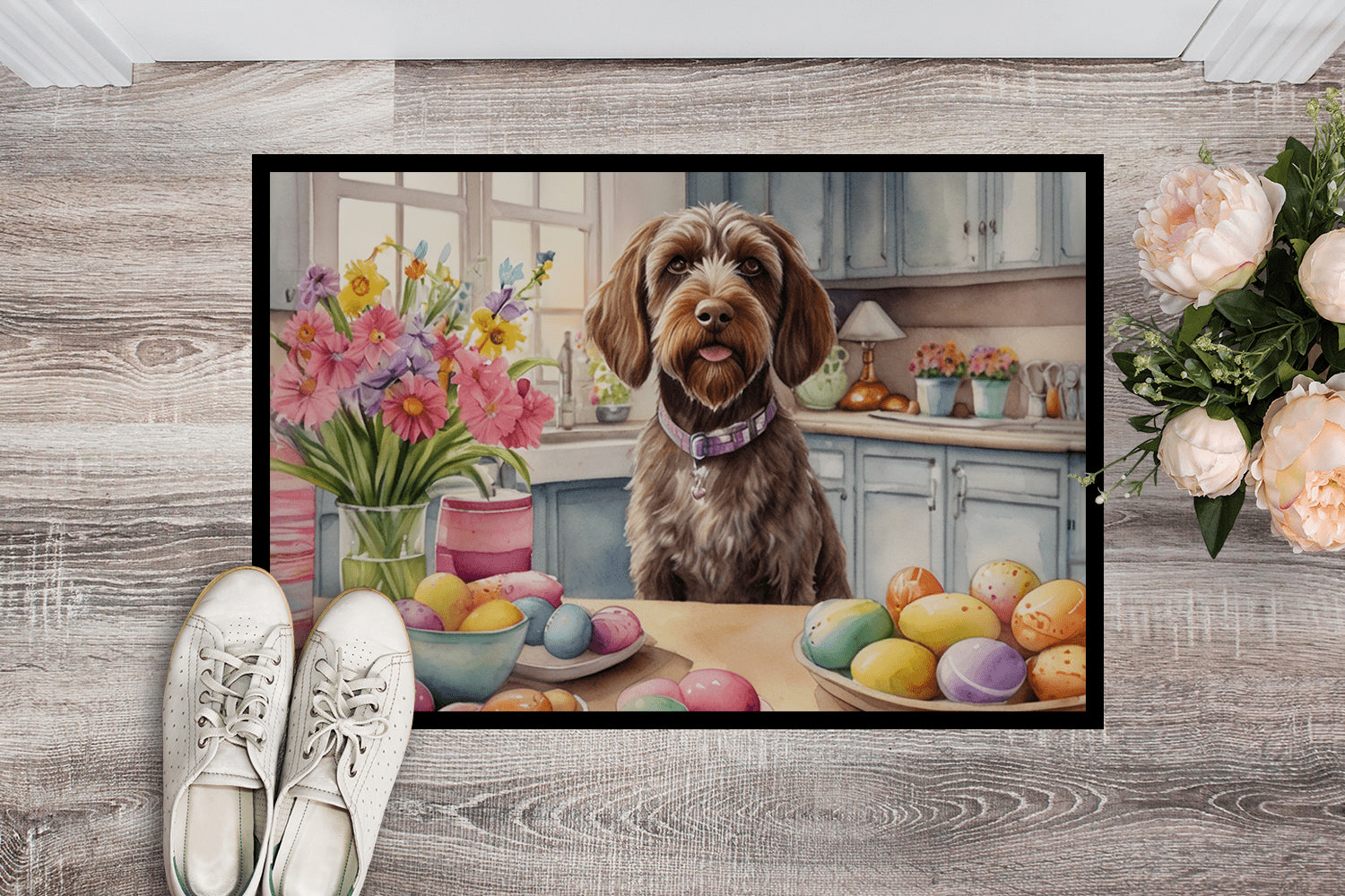 Doormat featuring breed specific Wirehaired Pointing Griffon artwork. Celebrate Easter with this Easter Doormat. Welcome your guests in style with our Artwork Door Mat, designed to withstand almost any weather condition. This mat, measuring approximately 18 by 27 inches, is held together by durable black binding tape. Its top layer, composed of polyester felt, is dyed with the eye-catching image you see on the mat. A few layers below provide the mat with stability, while its rubber bottom is stamped to help prevent slipping and ensures safety. Our mat works wonderfully as both an indoor or outdoor door mat. For cleaning, simply hose it off with water or use a power washer - no need for any cleaner that produces suds. Avoid scrubbing with a brush, instead, opt for the vacuum on floor setting. Designed manufactured and printed in the USA, this mat is a perfect addition to your porch, outdoor kitchen, entryway, or any indoor space. Its unique design makes it a charming decorative rug that greets your guests and adds a stylish touch to your home decor.