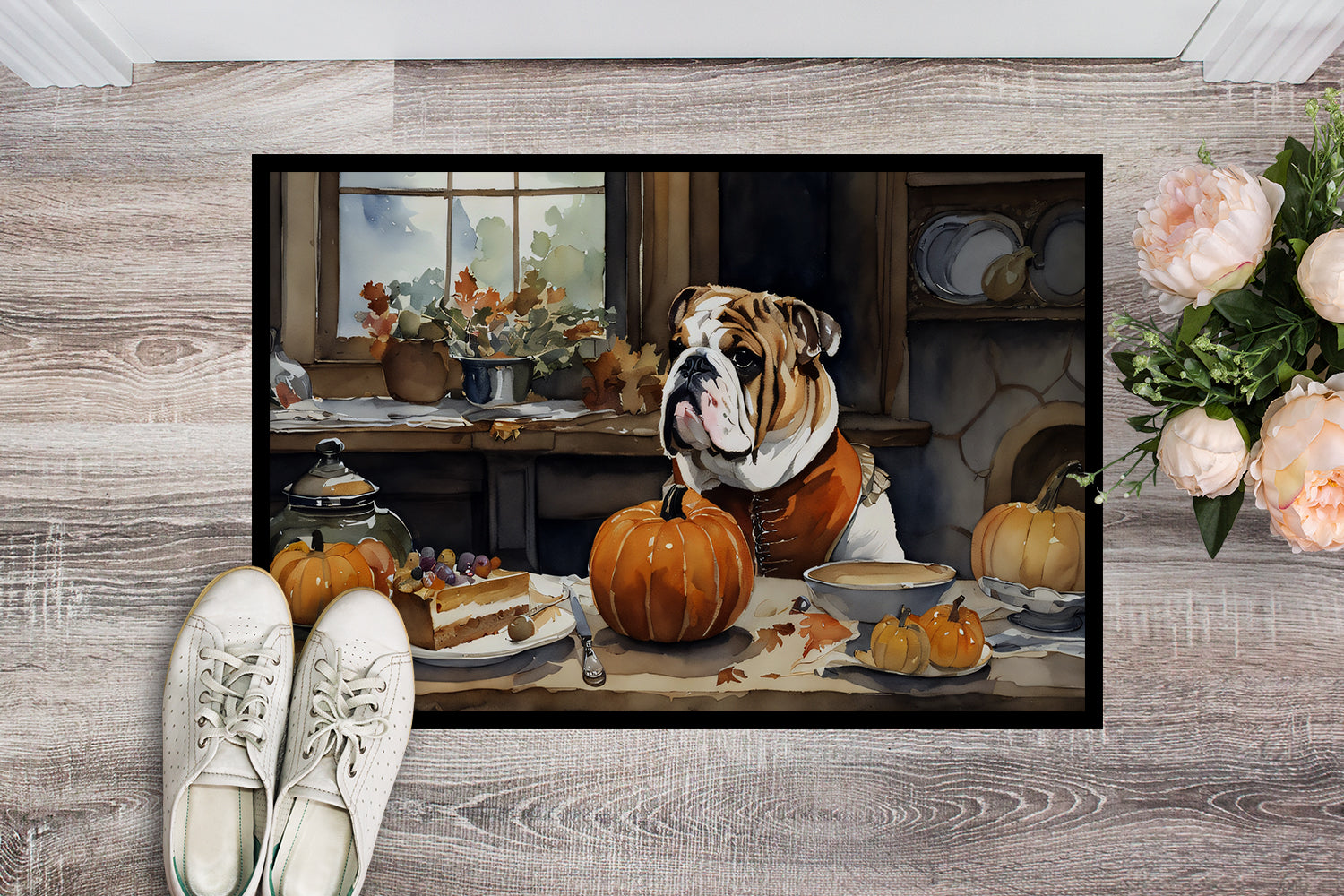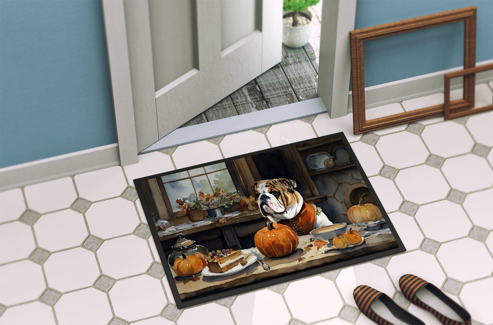 Doormat featuring breed specific English Bulldog artwork. Celebrate Halloween with this Halloween Doormat. Welcome your guests in style with our Artwork Door Mat, designed to withstand almost any weather condition. This mat, measuring approximately 24 by 36 inches, is held together by durable black binding tape. Its top layer, composed of polyester felt, is dyed with the eye-catching image you see on the mat. A few layers below provide the mat with stability, while its rubber bottom is stamped to help prevent slipping and ensures safety. Our mat works wonderfully as both an indoor or outdoor door mat. For cleaning, simply hose it off with water or use a power washer - no need for any cleaner that produces suds. Avoid scrubbing with a brush, instead, opt for the vacuum on floor setting. Designed manufactured and printed in the USA, this mat is a perfect addition to your porch, outdoor kitchen, entryway, or any indoor space. Its unique design makes it a charming decorative rug that greets your guests and adds a stylish touch to your home decor.