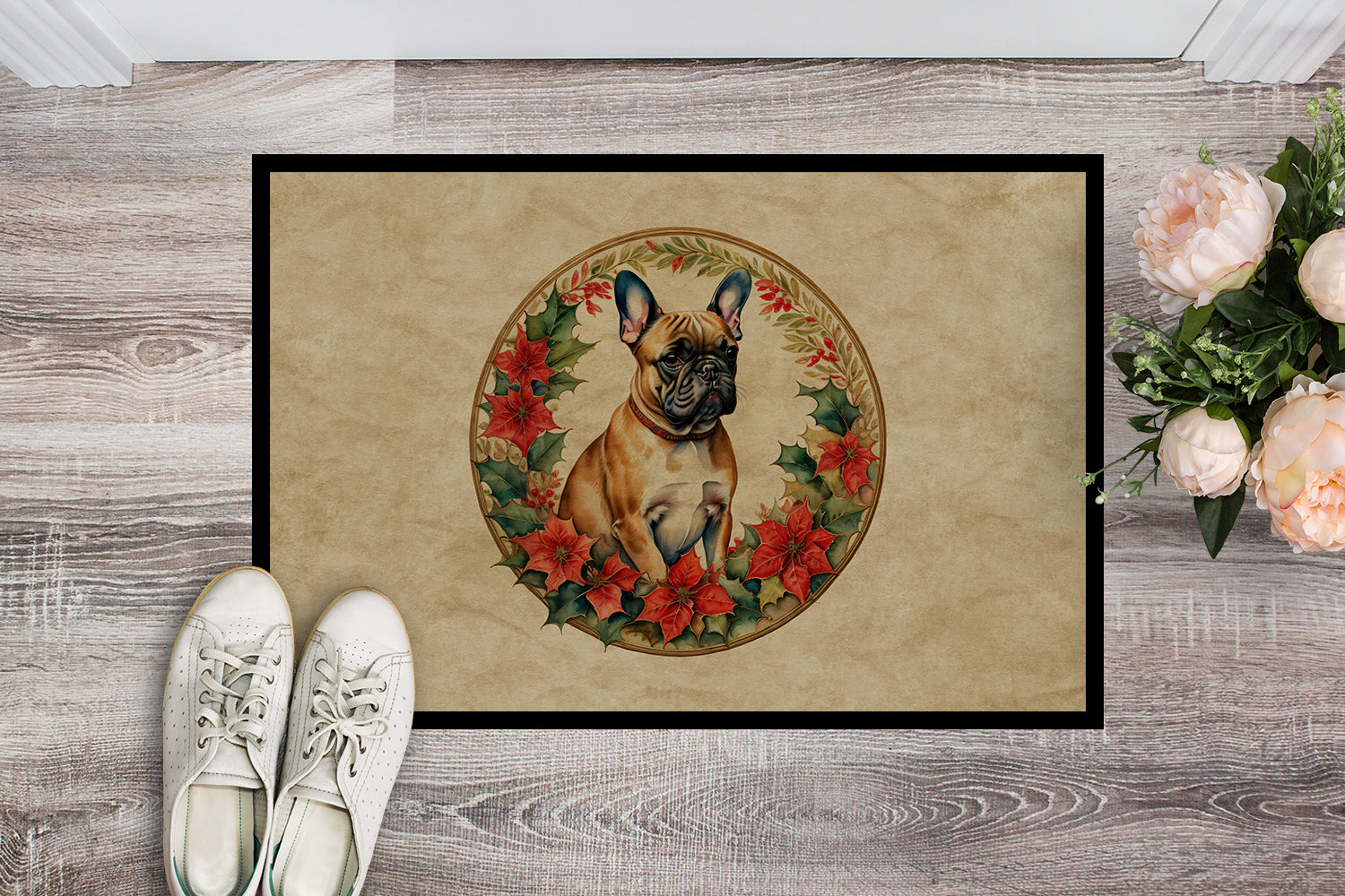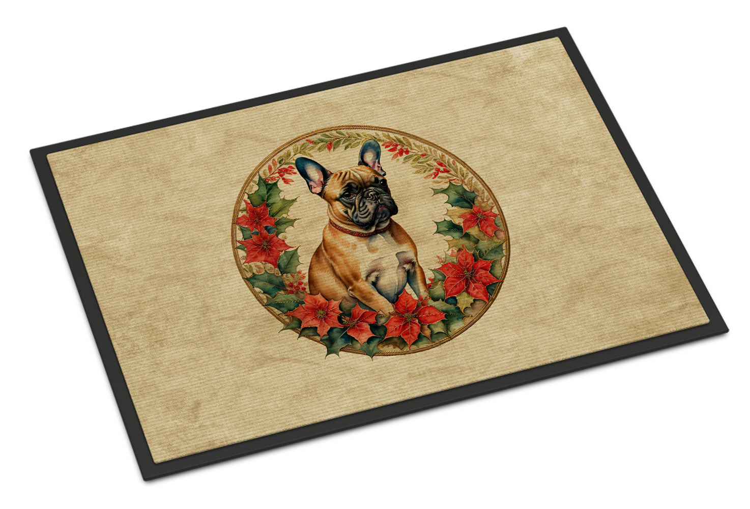 Doormat featuring breed specific French Bulldog artwork. Celebrate Christmas with this Christmas Doormat. Welcome your guests in style with our Artwork Door Mat, designed to withstand almost any weather condition. This mat, measuring approximately 24 by 36 inches, is held together by durable black binding tape. Its top layer, composed of polyester felt, is dyed with the eye-catching image you see on the mat. A few layers below provide the mat with stability, while its rubber bottom is stamped to help prevent slipping and ensures safety. Our mat works wonderfully as both an indoor or outdoor door mat. For cleaning, simply hose it off with water or use a power washer - no need for any cleaner that produces suds. Avoid scrubbing with a brush, instead, opt for the vacuum on floor setting. Designed manufactured and printed in the USA, this mat is a perfect addition to your porch, outdoor kitchen, entryway, or any indoor space. Its unique design makes it a charming decorative rug that greets your guests and adds a stylish touch to your home decor.