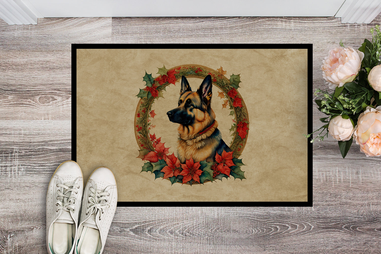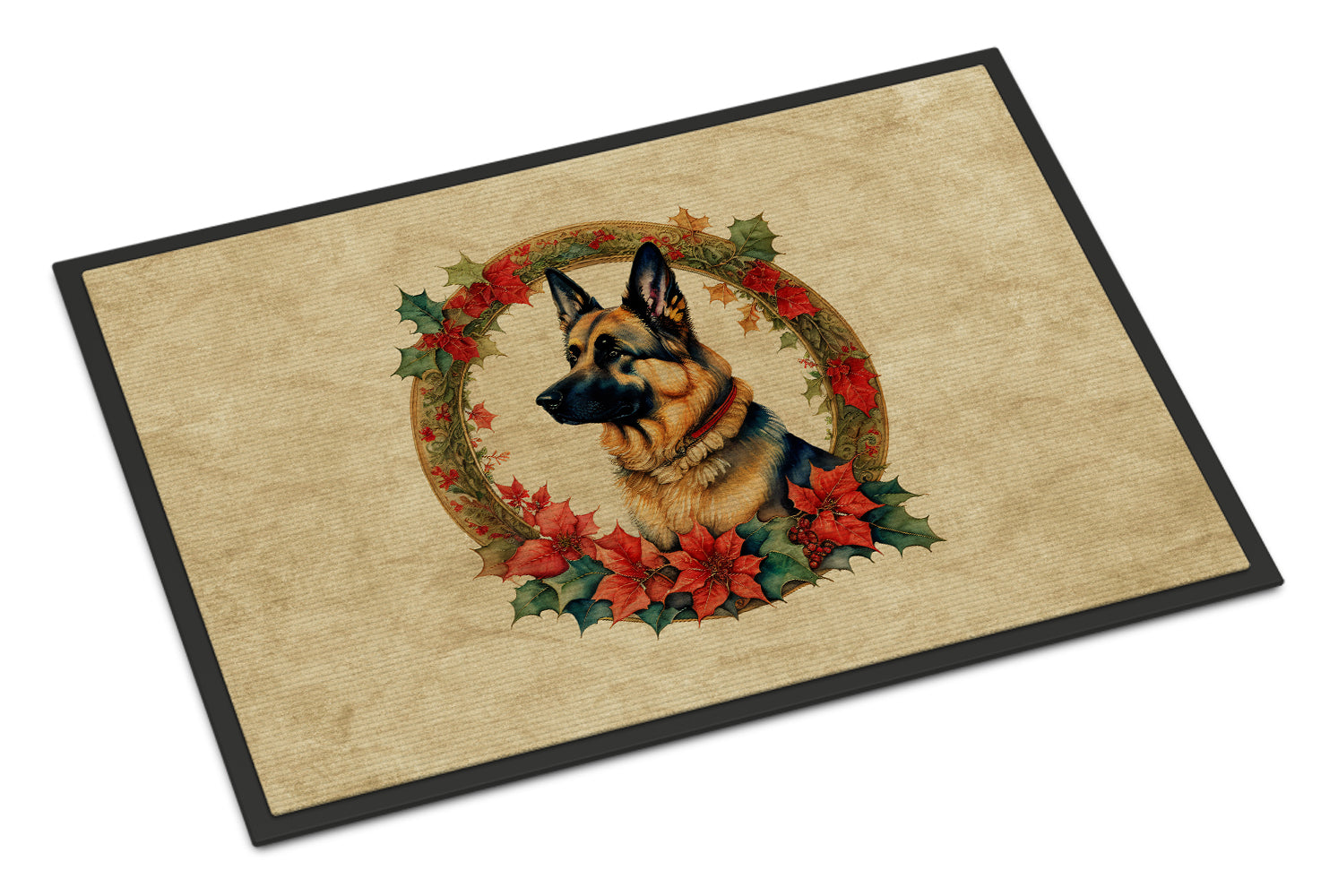 Doormat featuring breed specific German Shepherd artwork. Celebrate Christmas with this Christmas Doormat. Welcome your guests in style with our Artwork Door Mat, designed to withstand almost any weather condition. This mat, measuring approximately 24 by 36 inches, is held together by durable black binding tape. Its top layer, composed of polyester felt, is dyed with the eye-catching image you see on the mat. A few layers below provide the mat with stability, while its rubber bottom is stamped to help prevent slipping and ensures safety. Our mat works wonderfully as both an indoor or outdoor door mat. For cleaning, simply hose it off with water or use a power washer - no need for any cleaner that produces suds. Avoid scrubbing with a brush, instead, opt for the vacuum on floor setting. Designed manufactured and printed in the USA, this mat is a perfect addition to your porch, outdoor kitchen, entryway, or any indoor space. Its unique design makes it a charming decorative rug that greets your guests and adds a stylish touch to your home decor.