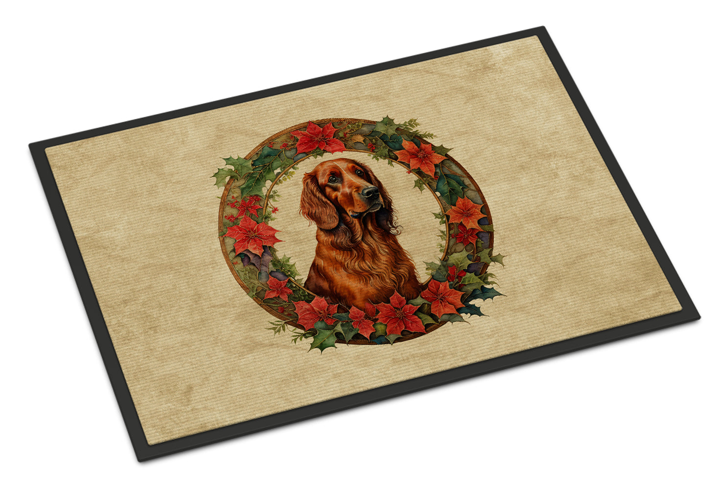Doormat featuring breed specific Irish Setter artwork. Celebrate Christmas with this Christmas Doormat. Welcome your guests in style with our Artwork Door Mat, designed to withstand almost any weather condition. This mat, measuring approximately 24 by 36 inches, is held together by durable black binding tape. Its top layer, composed of polyester felt, is dyed with the eye-catching image you see on the mat. A few layers below provide the mat with stability, while its rubber bottom is stamped to help prevent slipping and ensures safety. Our mat works wonderfully as both an indoor or outdoor door mat. For cleaning, simply hose it off with water or use a power washer - no need for any cleaner that produces suds. Avoid scrubbing with a brush, instead, opt for the vacuum on floor setting. Designed manufactured and printed in the USA, this mat is a perfect addition to your porch, outdoor kitchen, entryway, or any indoor space. Its unique design makes it a charming decorative rug that greets your guests and adds a stylish touch to your home decor.