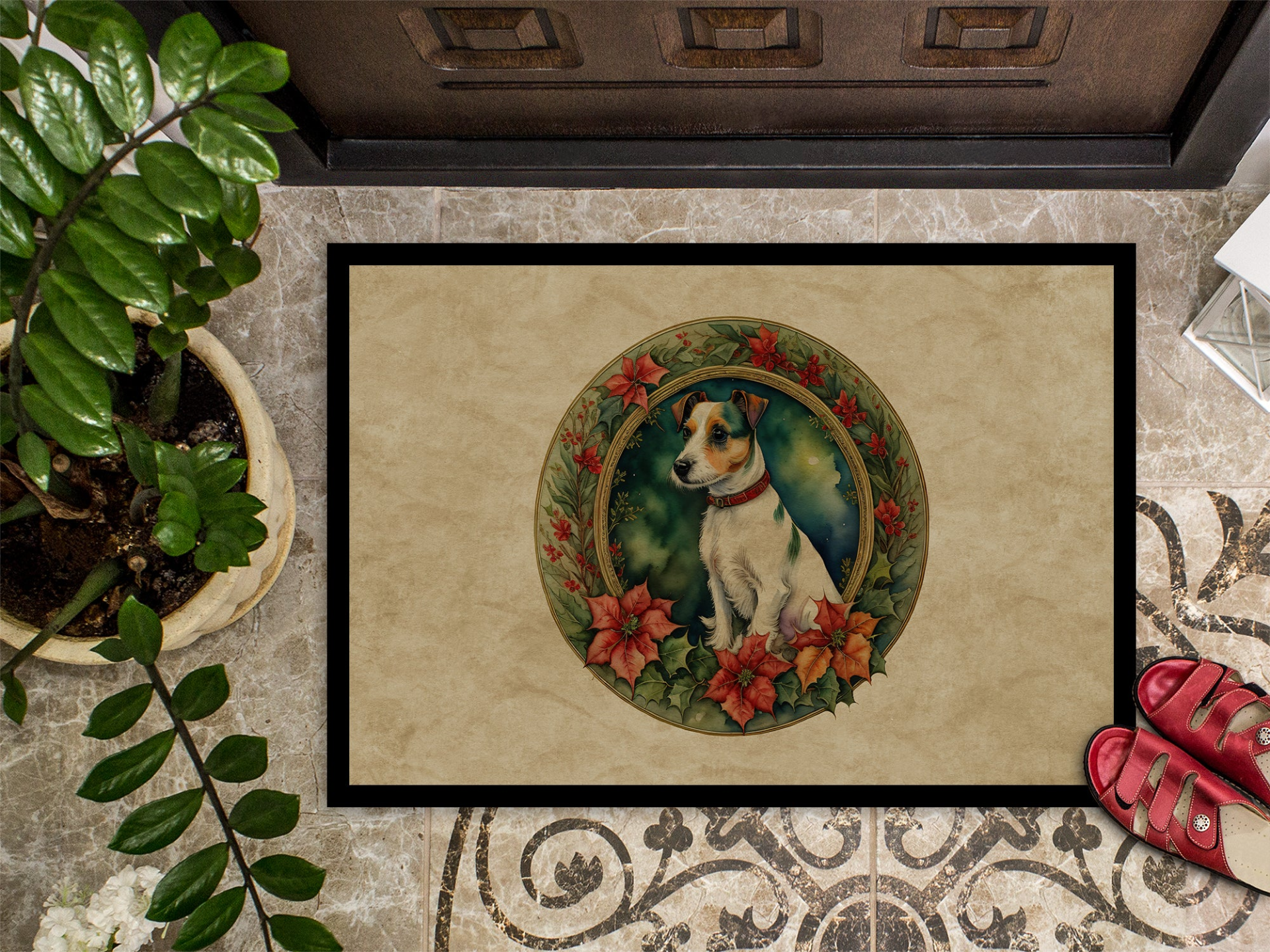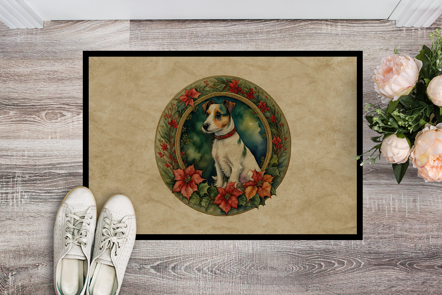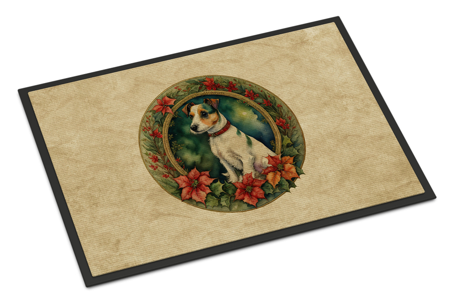 Doormat featuring breed specific Jack Russell Terrier artwork. Celebrate Christmas with this Christmas Doormat. Welcome your guests in style with our Artwork Door Mat, designed to withstand almost any weather condition. This mat, measuring approximately 24 by 36 inches, is held together by durable black binding tape. Its top layer, composed of polyester felt, is dyed with the eye-catching image you see on the mat. A few layers below provide the mat with stability, while its rubber bottom is stamped to help prevent slipping and ensures safety. Our mat works wonderfully as both an indoor or outdoor door mat. For cleaning, simply hose it off with water or use a power washer - no need for any cleaner that produces suds. Avoid scrubbing with a brush, instead, opt for the vacuum on floor setting. Designed manufactured and printed in the USA, this mat is a perfect addition to your porch, outdoor kitchen, entryway, or any indoor space. Its unique design makes it a charming decorative rug that greets your guests and adds a stylish touch to your home decor.