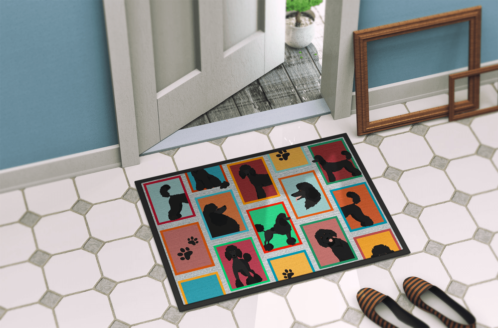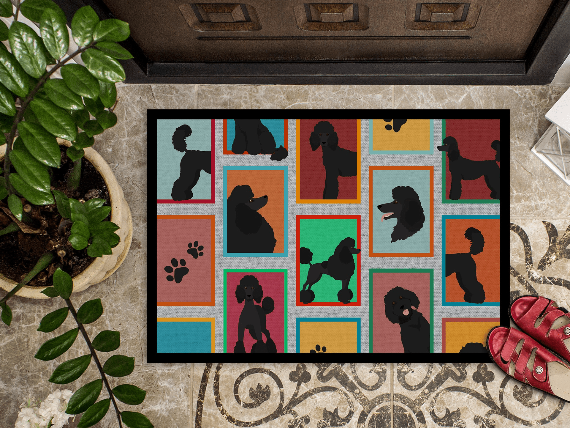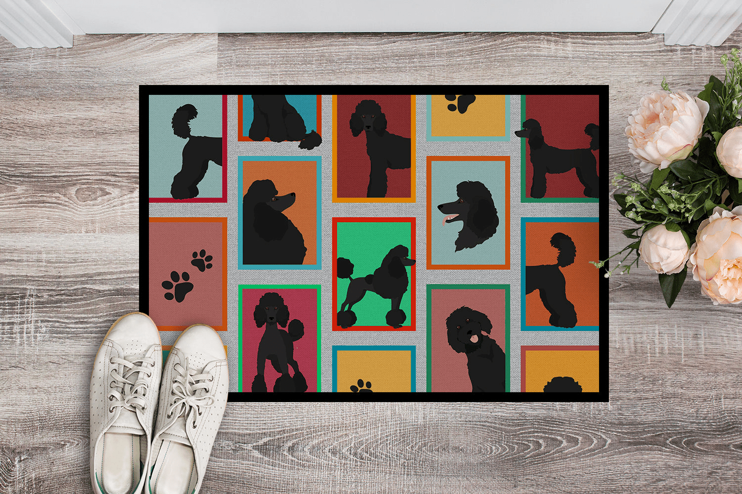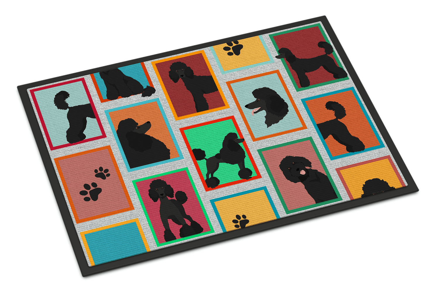 Doormat featuring breed specific Poodle artwork. Welcome your guests in style with our Artwork Door Mat, designed to withstand almost any weather condition. This mat, measuring approximately 18 by 27 inches, is held together by durable black binding tape. Its top layer, composed of polyester felt, is dyed with the eye-catching image you see on the mat. A few layers below provide the mat with stability, while its rubber bottom is stamped to help prevent slipping and ensures safety. Our mat works wonderfully as both an indoor or outdoor door mat. For cleaning, simply hose it off with water or use a power washer - no need for any cleaner that produces suds. Avoid scrubbing with a brush, instead, opt for the vacuum on floor setting. Designed manufactured and printed in the USA, this mat is a perfect addition to your porch, outdoor kitchen, entryway, or any indoor space. Its unique design makes it a charming decorative rug that greets your guests and adds a stylish touch to your home decor.