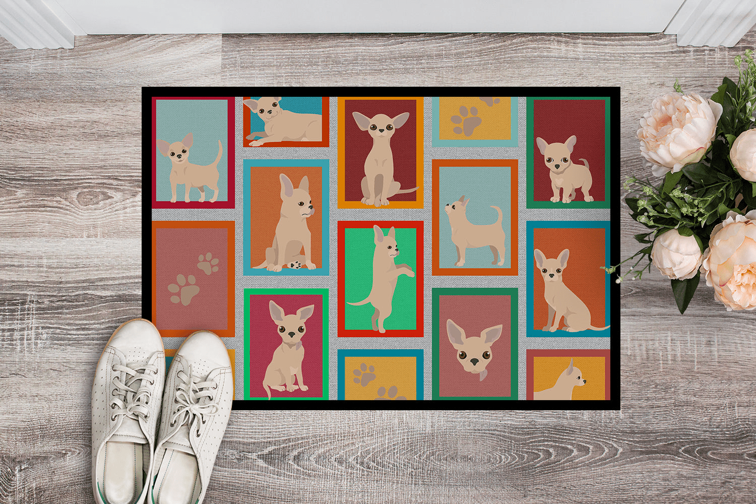 Doormat featuring breed specific Chihuahua artwork. Welcome your guests in style with our Artwork Door Mat, designed to withstand almost any weather condition. This mat, measuring approximately 18 by 27 inches, is held together by durable black binding tape. Its top layer, composed of polyester felt, is dyed with the eye-catching image you see on the mat. A few layers below provide the mat with stability, while its rubber bottom is stamped to help prevent slipping and ensures safety. Our mat works wonderfully as both an indoor or outdoor door mat. For cleaning, simply hose it off with water or use a power washer - no need for any cleaner that produces suds. Avoid scrubbing with a brush, instead, opt for the vacuum on floor setting. Designed manufactured and printed in the USA, this mat is a perfect addition to your porch, outdoor kitchen, entryway, or any indoor space. Its unique design makes it a charming decorative rug that greets your guests and adds a stylish touch to your home decor.