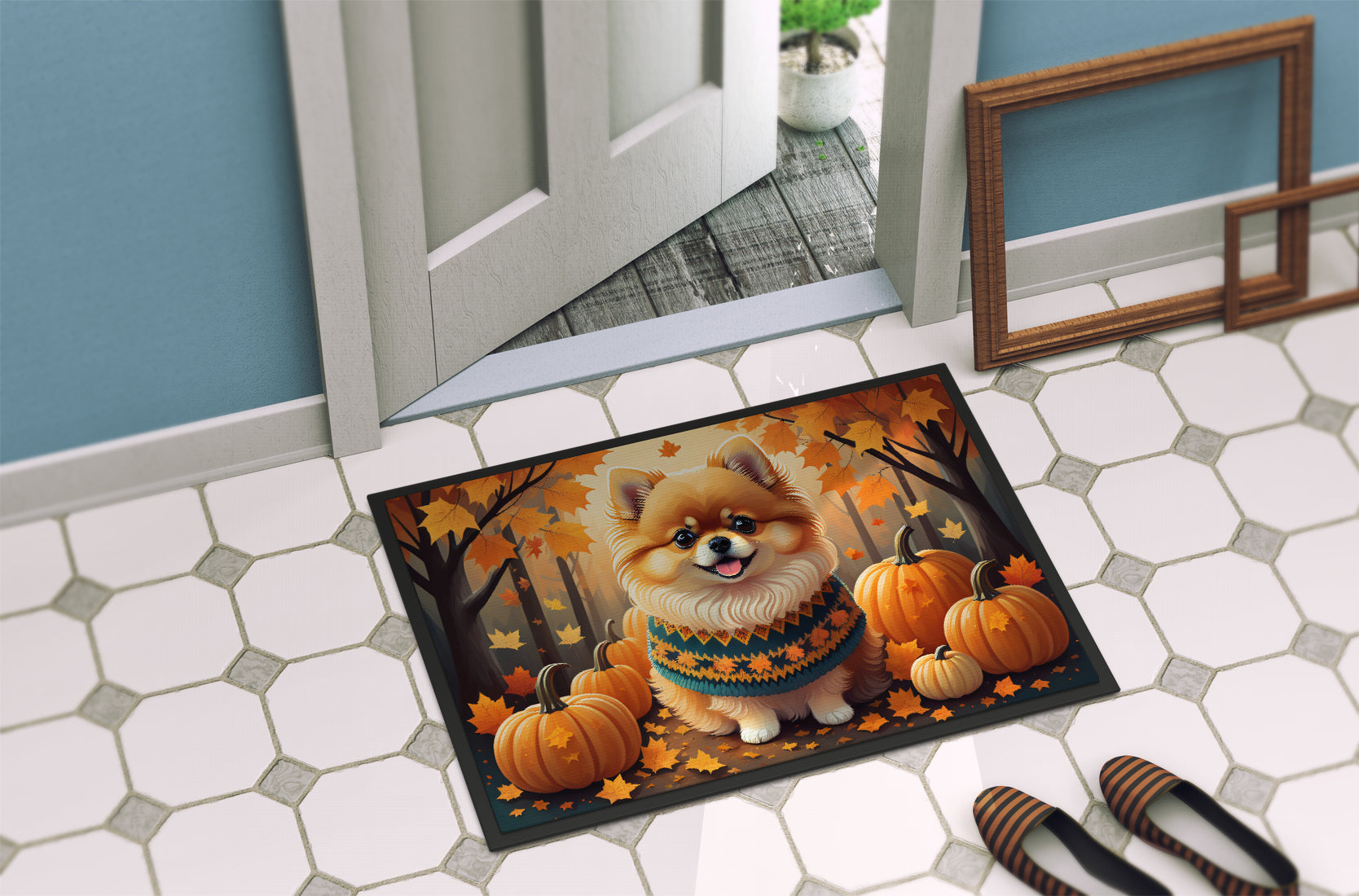 Doormat featuring breed specific Pomeranian artwork. Welcome your guests in style with our Artwork Door Mat, designed to withstand almost any weather condition. This mat, measuring approximately 24 by 36 inches, is held together by durable black binding tape. Its top layer, composed of polyester felt, is dyed with the eye-catching image you see on the mat. A few layers below provide the mat with stability, while its rubber bottom is stamped to help prevent slipping and ensures safety. Our mat works wonderfully as both an indoor or outdoor door mat. For cleaning, simply hose it off with water or use a power washer - no need for any cleaner that produces suds. Avoid scrubbing with a brush, instead, opt for the vacuum on floor setting. Designed manufactured and printed in the USA, this mat is a perfect addition to your porch, outdoor kitchen, entryway, or any indoor space. Its unique design makes it a charming decorative rug that greets your guests and adds a stylish touch to your home decor.