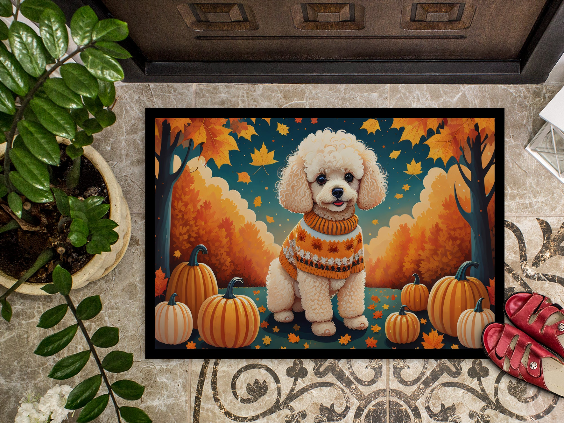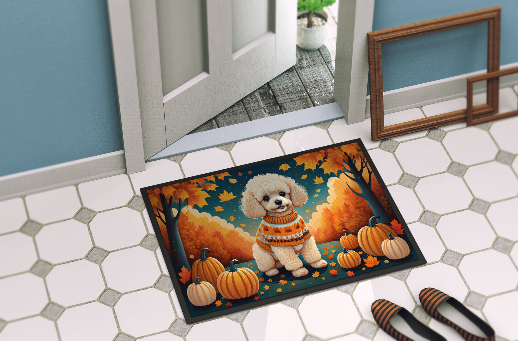 Doormat featuring breed specific Poodle artwork. Welcome your guests in style with our Artwork Door Mat, designed to withstand almost any weather condition. This mat, measuring approximately 24 by 36 inches, is held together by durable black binding tape. Its top layer, composed of polyester felt, is dyed with the eye-catching image you see on the mat. A few layers below provide the mat with stability, while its rubber bottom is stamped to help prevent slipping and ensures safety. Our mat works wonderfully as both an indoor or outdoor door mat. For cleaning, simply hose it off with water or use a power washer - no need for any cleaner that produces suds. Avoid scrubbing with a brush, instead, opt for the vacuum on floor setting. Designed manufactured and printed in the USA, this mat is a perfect addition to your porch, outdoor kitchen, entryway, or any indoor space. Its unique design makes it a charming decorative rug that greets your guests and adds a stylish touch to your home decor.