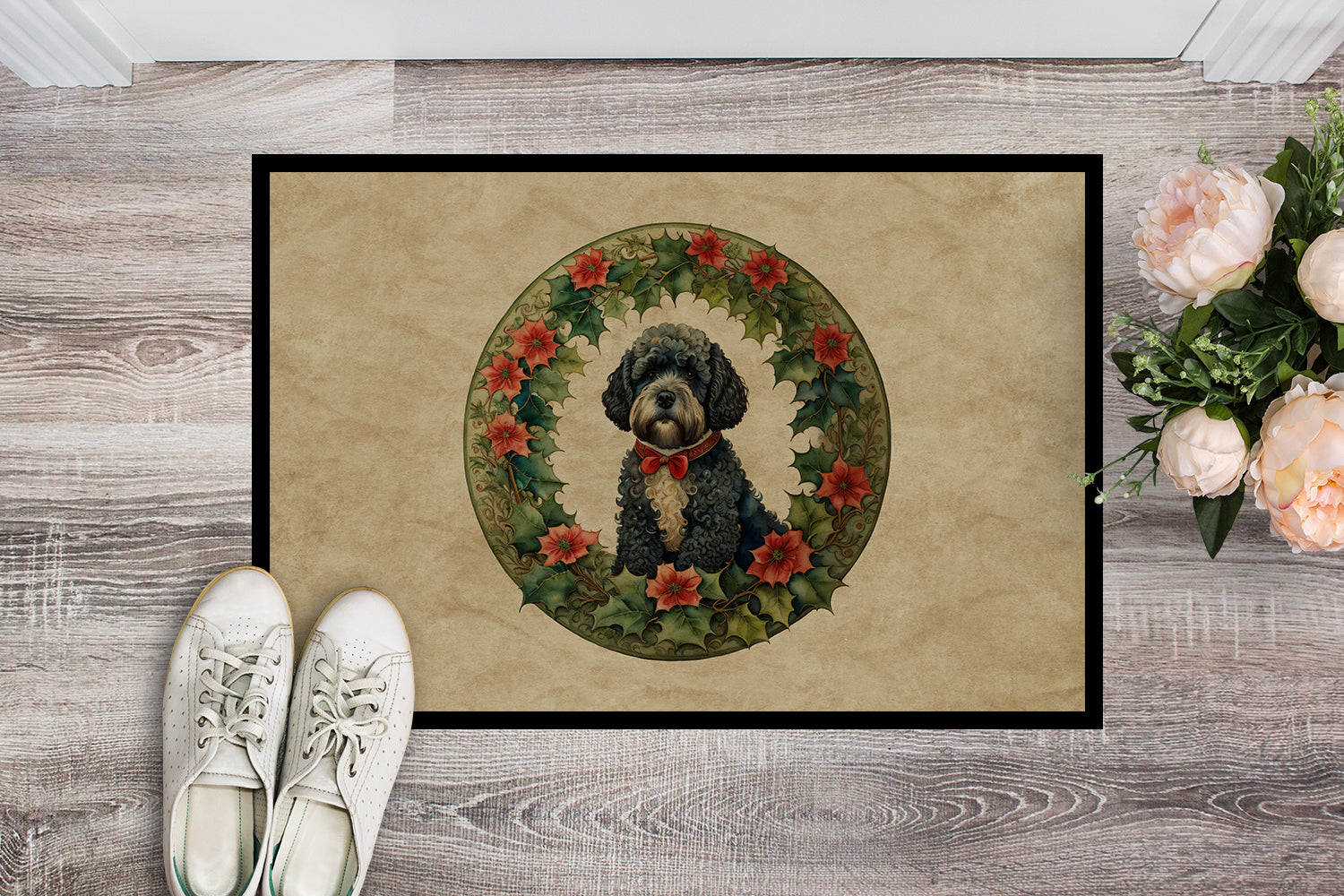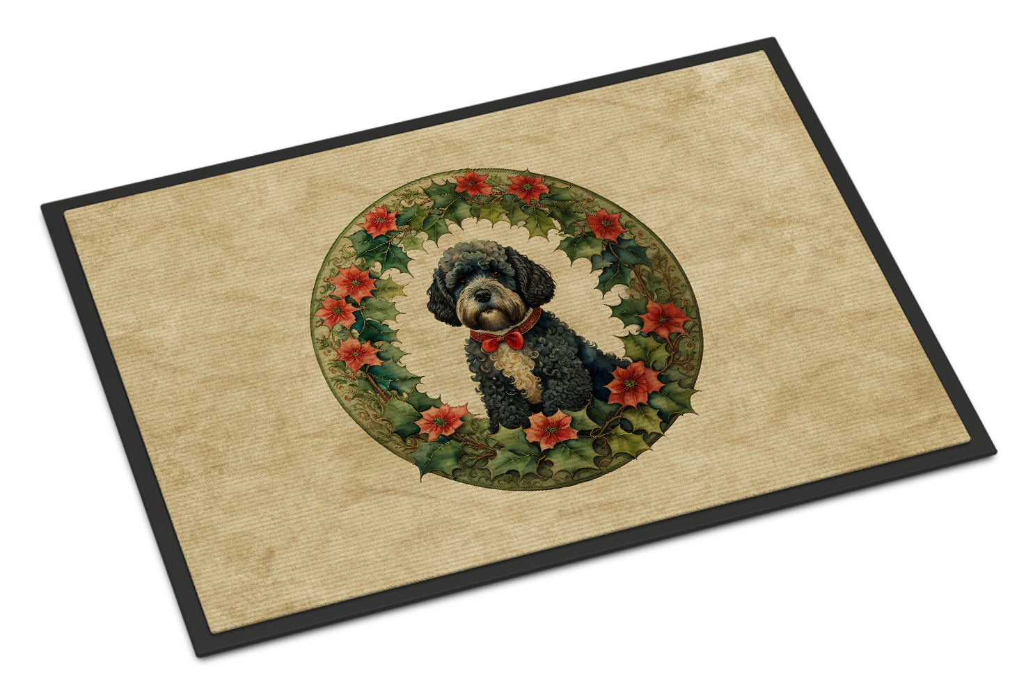 Doormat featuring breed specific Portuguese Water Dog artwork. Celebrate Christmas with this Christmas Doormat. Welcome your guests in style with our Artwork Door Mat, designed to withstand almost any weather condition. This mat, measuring approximately 24 by 36 inches, is held together by durable black binding tape. Its top layer, composed of polyester felt, is dyed with the eye-catching image you see on the mat. A few layers below provide the mat with stability, while its rubber bottom is stamped to help prevent slipping and ensures safety. Our mat works wonderfully as both an indoor or outdoor door mat. For cleaning, simply hose it off with water or use a power washer - no need for any cleaner that produces suds. Avoid scrubbing with a brush, instead, opt for the vacuum on floor setting. Designed manufactured and printed in the USA, this mat is a perfect addition to your porch, outdoor kitchen, entryway, or any indoor space. Its unique design makes it a charming decorative rug that greets your guests and adds a stylish touch to your home decor.