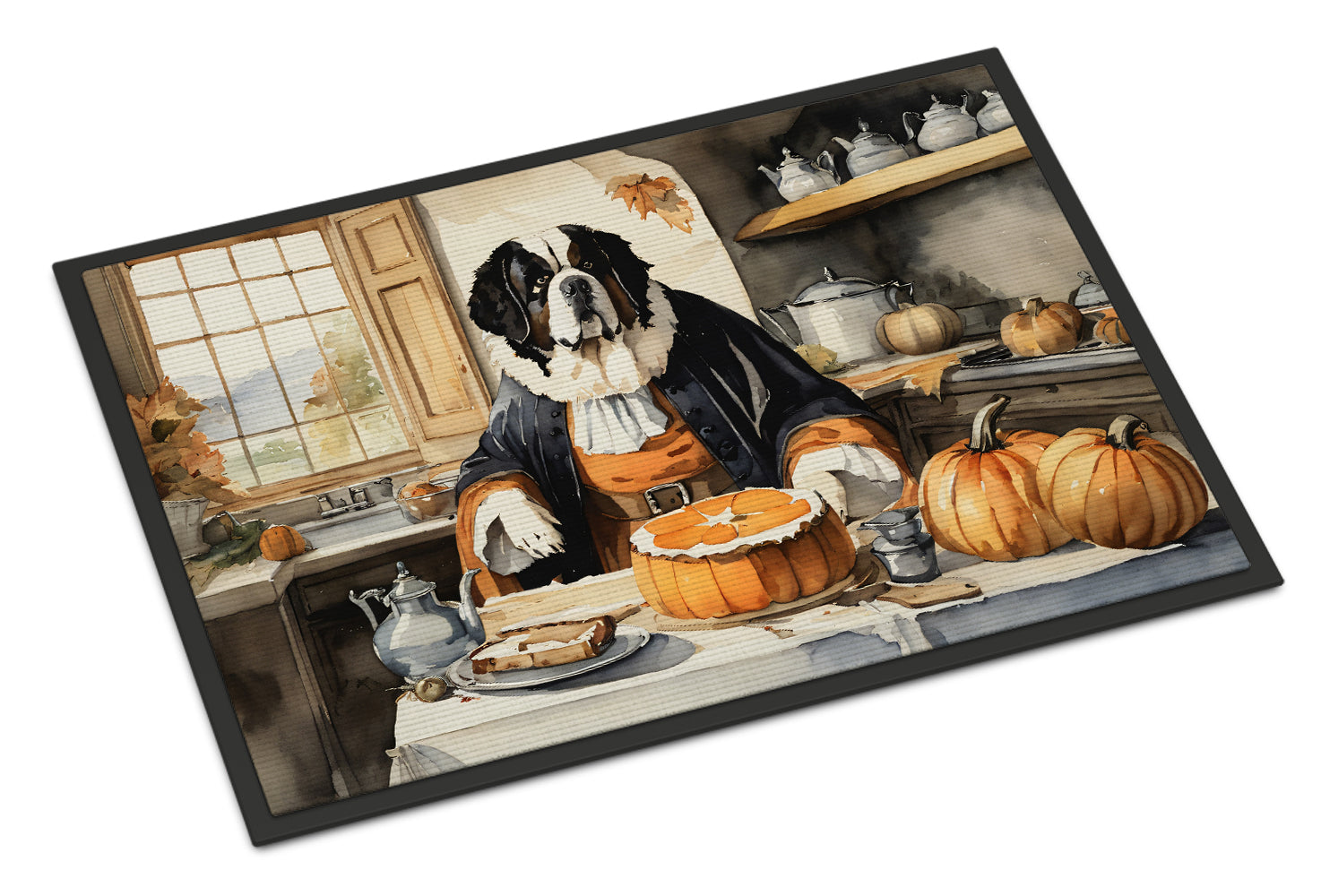 Doormat featuring breed specific Saint Bernard artwork. Celebrate Halloween with this Halloween Doormat. Welcome your guests in style with our Artwork Door Mat, designed to withstand almost any weather condition. This mat, measuring approximately 24 by 36 inches, is held together by durable black binding tape. Its top layer, composed of polyester felt, is dyed with the eye-catching image you see on the mat. A few layers below provide the mat with stability, while its rubber bottom is stamped to help prevent slipping and ensures safety. Our mat works wonderfully as both an indoor or outdoor door mat. For cleaning, simply hose it off with water or use a power washer - no need for any cleaner that produces suds. Avoid scrubbing with a brush, instead, opt for the vacuum on floor setting. Designed manufactured and printed in the USA, this mat is a perfect addition to your porch, outdoor kitchen, entryway, or any indoor space. Its unique design makes it a charming decorative rug that greets your guests and adds a stylish touch to your home decor.