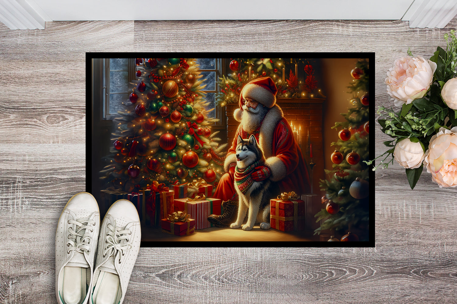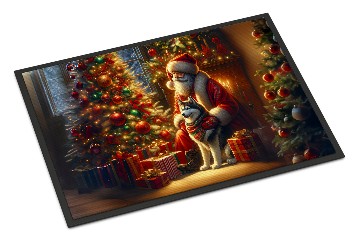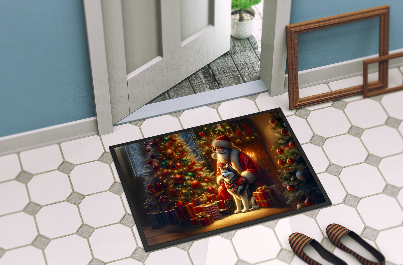 Doormat featuring breed specific Siberian Husky artwork. Celebrate Christmas with this Christmas Doormat. Welcome your guests in style with our Artwork Door Mat, designed to withstand almost any weather condition. This mat, measuring approximately 18 by 27 inches, is held together by durable black binding tape. Its top layer, composed of polyester felt, is dyed with the eye-catching image you see on the mat. A few layers below provide the mat with stability, while its rubber bottom is stamped to help prevent slipping and ensures safety. Our mat works wonderfully as both an indoor or outdoor door mat. For cleaning, simply hose it off with water or use a power washer - no need for any cleaner that produces suds. Avoid scrubbing with a brush, instead, opt for the vacuum on floor setting. Designed manufactured and printed in the USA, this mat is a perfect addition to your porch, outdoor kitchen, entryway, or any indoor space. Its unique design makes it a charming decorative rug that greets your guests and adds a stylish touch to your home decor.