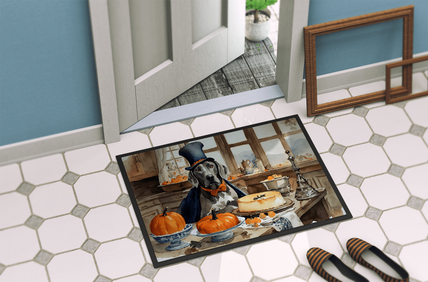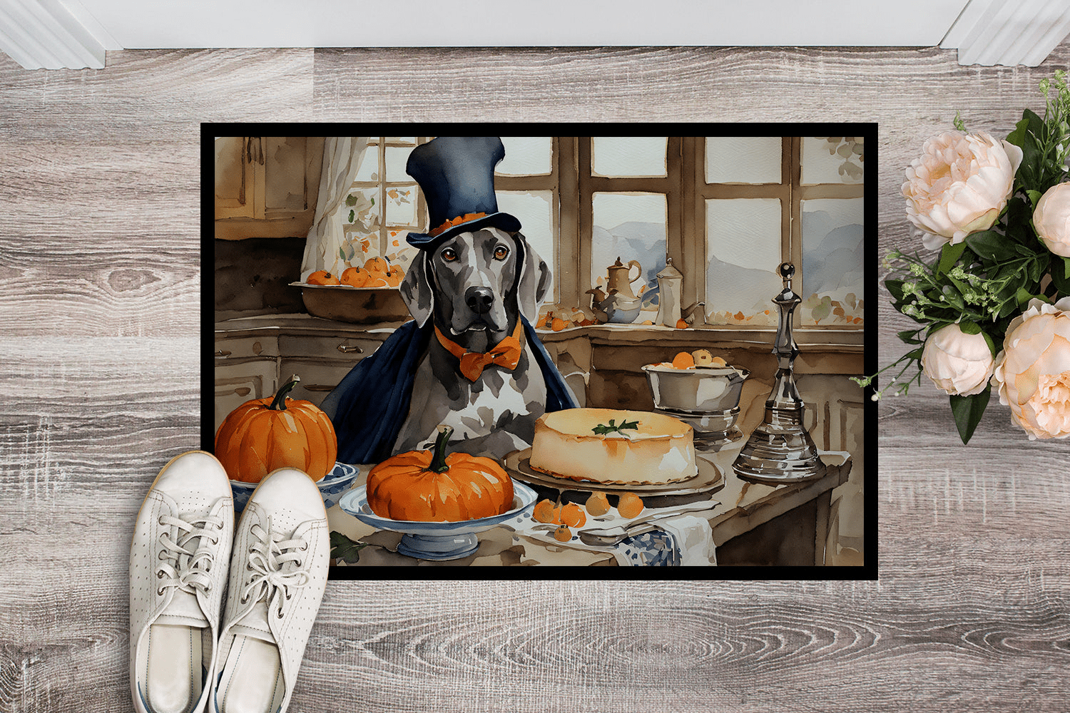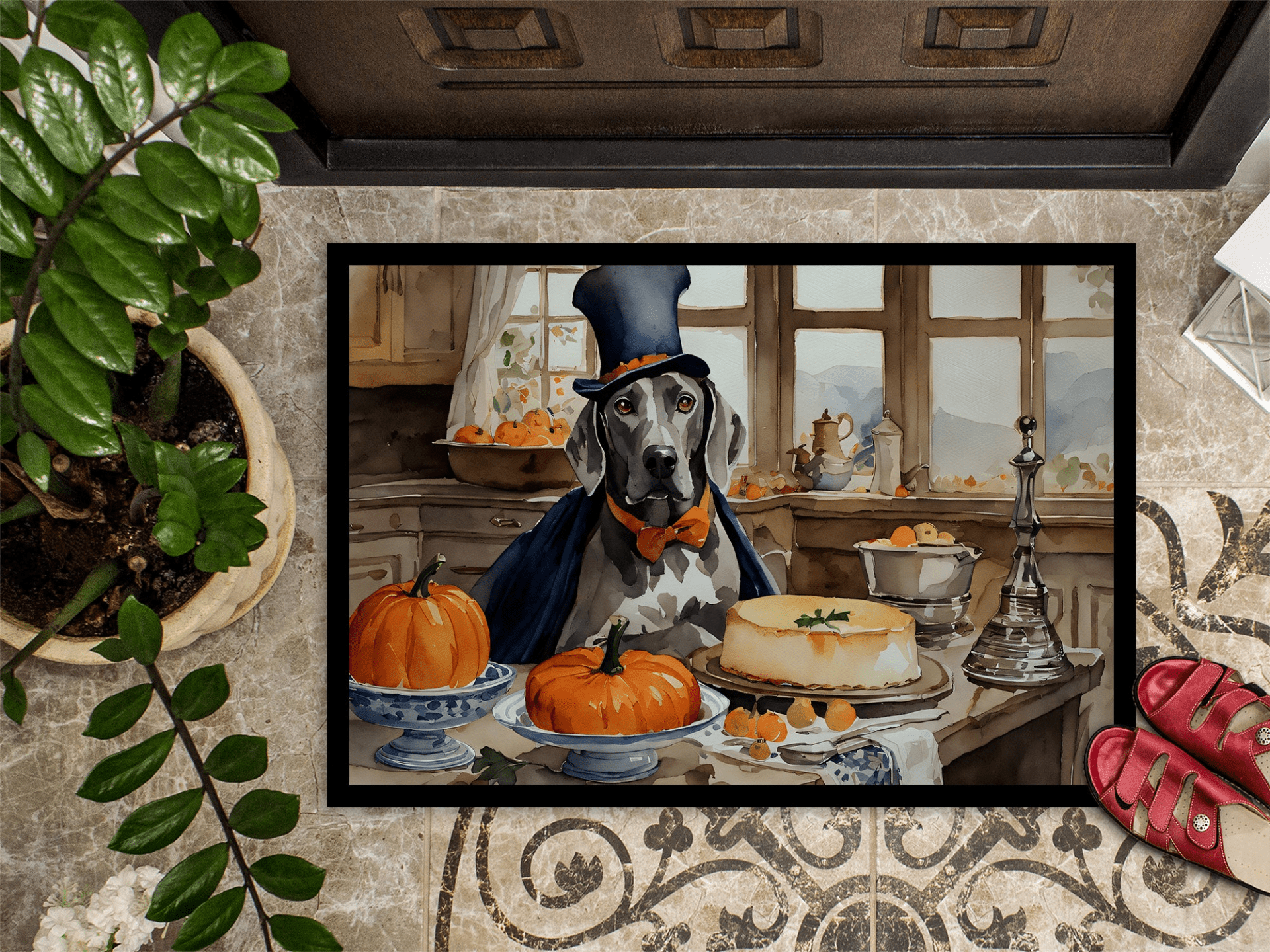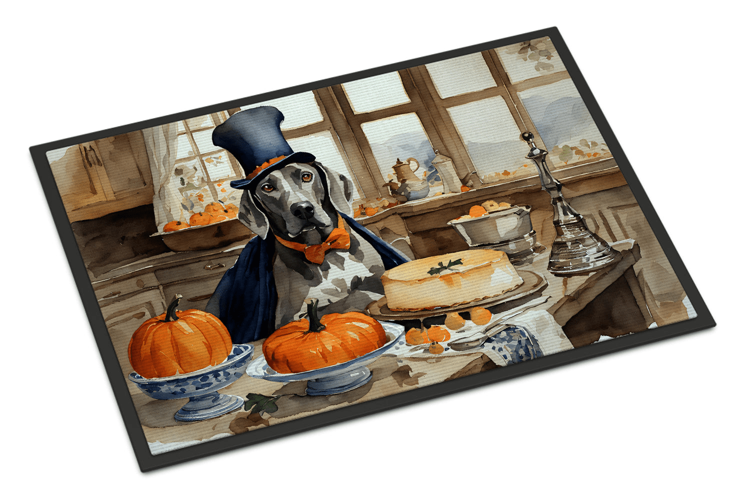 Doormat featuring breed specific Weimaraner artwork. Celebrate Halloween with this Halloween Doormat. Welcome your guests in style with our Artwork Door Mat, designed to withstand almost any weather condition. This mat, measuring approximately 18 by 27 inches, is held together by durable black binding tape. Its top layer, composed of polyester felt, is dyed with the eye-catching image you see on the mat. A few layers below provide the mat with stability, while its rubber bottom is stamped to help prevent slipping and ensures safety. Our mat works wonderfully as both an indoor or outdoor door mat. For cleaning, simply hose it off with water or use a power washer - no need for any cleaner that produces suds. Avoid scrubbing with a brush, instead, opt for the vacuum on floor setting. Designed manufactured and printed in the USA, this mat is a perfect addition to your porch, outdoor kitchen, entryway, or any indoor space. Its unique design makes it a charming decorative rug that greets your guests and adds a stylish touch to your home decor.