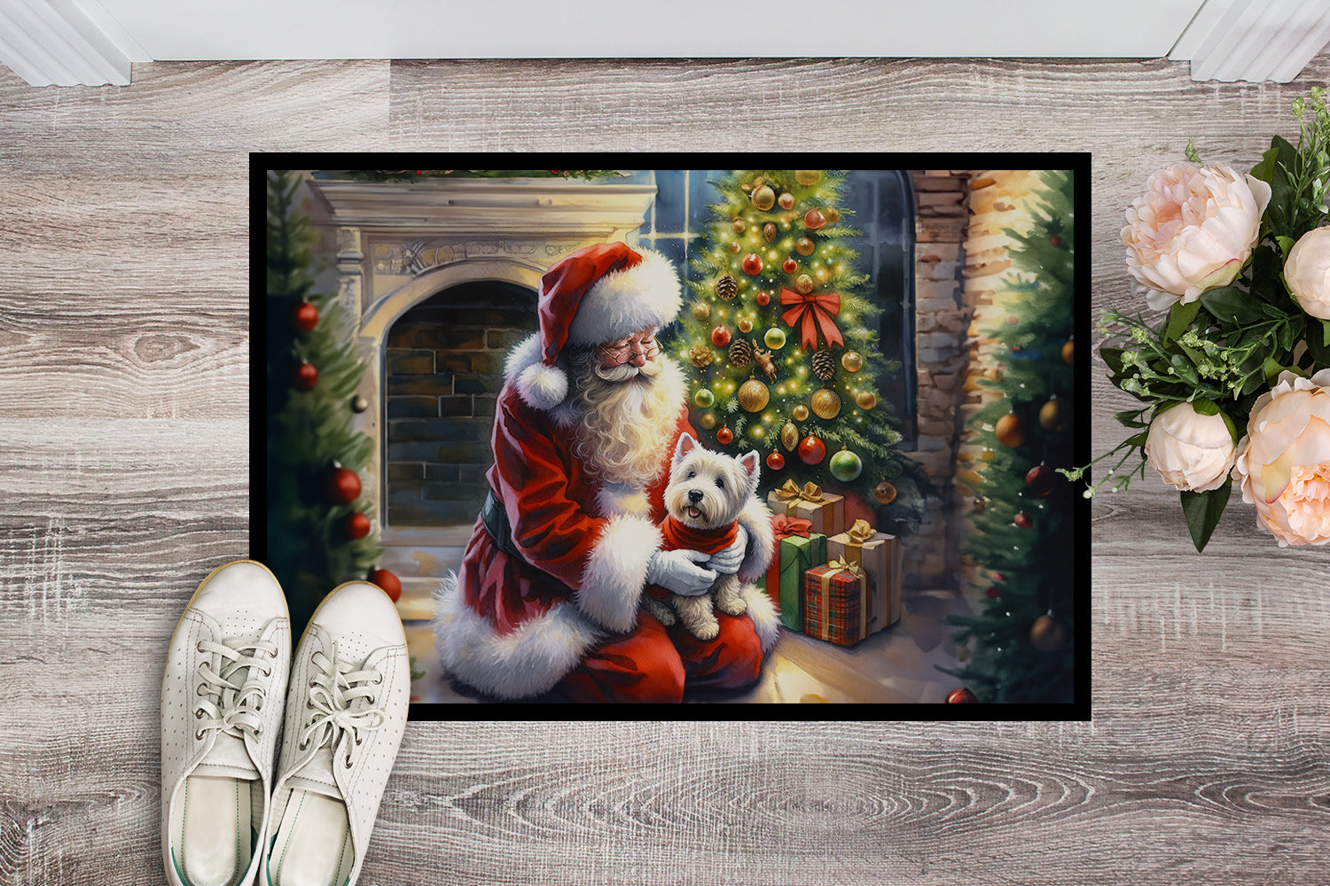 Doormat featuring breed specific West Highland White Terrier artwork. Celebrate Christmas with this Christmas Doormat. Welcome your guests in style with our Artwork Door Mat, designed to withstand almost any weather condition. This mat, measuring approximately 18 by 27 inches, is held together by durable black binding tape. Its top layer, composed of polyester felt, is dyed with the eye-catching image you see on the mat. A few layers below provide the mat with stability, while its rubber bottom is stamped to help prevent slipping and ensures safety. Our mat works wonderfully as both an indoor or outdoor door mat. For cleaning, simply hose it off with water or use a power washer - no need for any cleaner that produces suds. Avoid scrubbing with a brush, instead, opt for the vacuum on floor setting. Designed manufactured and printed in the USA, this mat is a perfect addition to your porch, outdoor kitchen, entryway, or any indoor space. Its unique design makes it a charming decorative rug that greets your guests and adds a stylish touch to your home decor.