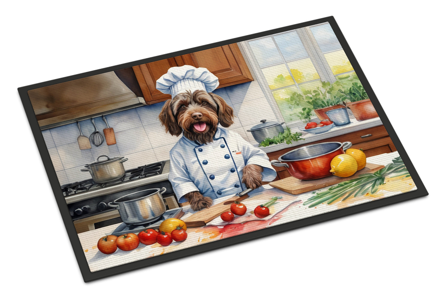Doormat featuring breed specific Wirehaired Pointing Griffon artwork. Welcome your guests in style with our Artwork Door Mat, designed to withstand almost any weather condition. This mat, measuring approximately 18 by 27 inches, is held together by durable black binding tape. Its top layer, composed of polyester felt, is dyed with the eye-catching image you see on the mat. A few layers below provide the mat with stability, while its rubber bottom is stamped to help prevent slipping and ensures safety. Our mat works wonderfully as both an indoor or outdoor door mat. For cleaning, simply hose it off with water or use a power washer - no need for any cleaner that produces suds. Avoid scrubbing with a brush, instead, opt for the vacuum on floor setting. Designed manufactured and printed in the USA, this mat is a perfect addition to your porch, outdoor kitchen, entryway, or any indoor space. Its unique design makes it a charming decorative rug that greets your guests and adds a stylish touch to your home decor.