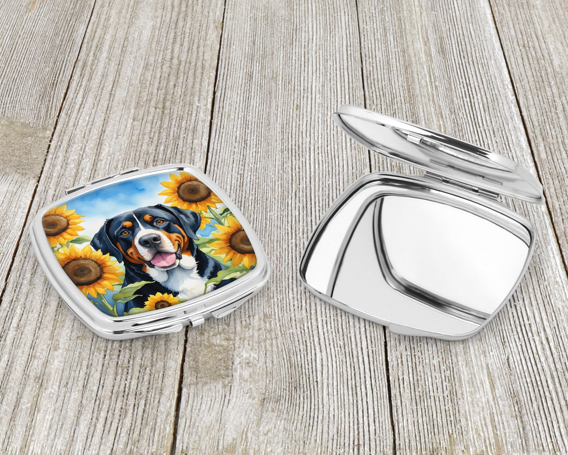 Compact Mirror featuring breed specific Greater Swiss Mountain Dog artwork. Introducing our Square Compact Mirror, a blend of elegance, functionality, and compactness, perfect for on-the-go touch-ups. This Silvertone metal mirror, with dimensions of 2.75 inches x 3 inches x .3 inches, fits effortlessly into your purse, handbag, or pocket, ensuring that you can check your appearance anytime, anywhere. Our compact mirror stands out with its eye-catching artwork on the front, adding a dash of style to this practical accessory. It is more than just a mirror; it's a statement piece that reflects your personality and aesthetic. When opened, this compact reveals two mirrors inside, doubling your perspective for precise touch-ups. The Silvertone metal construction ensures durability while maintaining a lightweight feel, making it an ideal everyday carry item. Whether you're rushing to a meeting, prepping for a dinner date, or just need a quick check on your look, our Square Compact Mirror is your reliable companion. Experience the perfect blend of style and practicality with this must-have accessory.