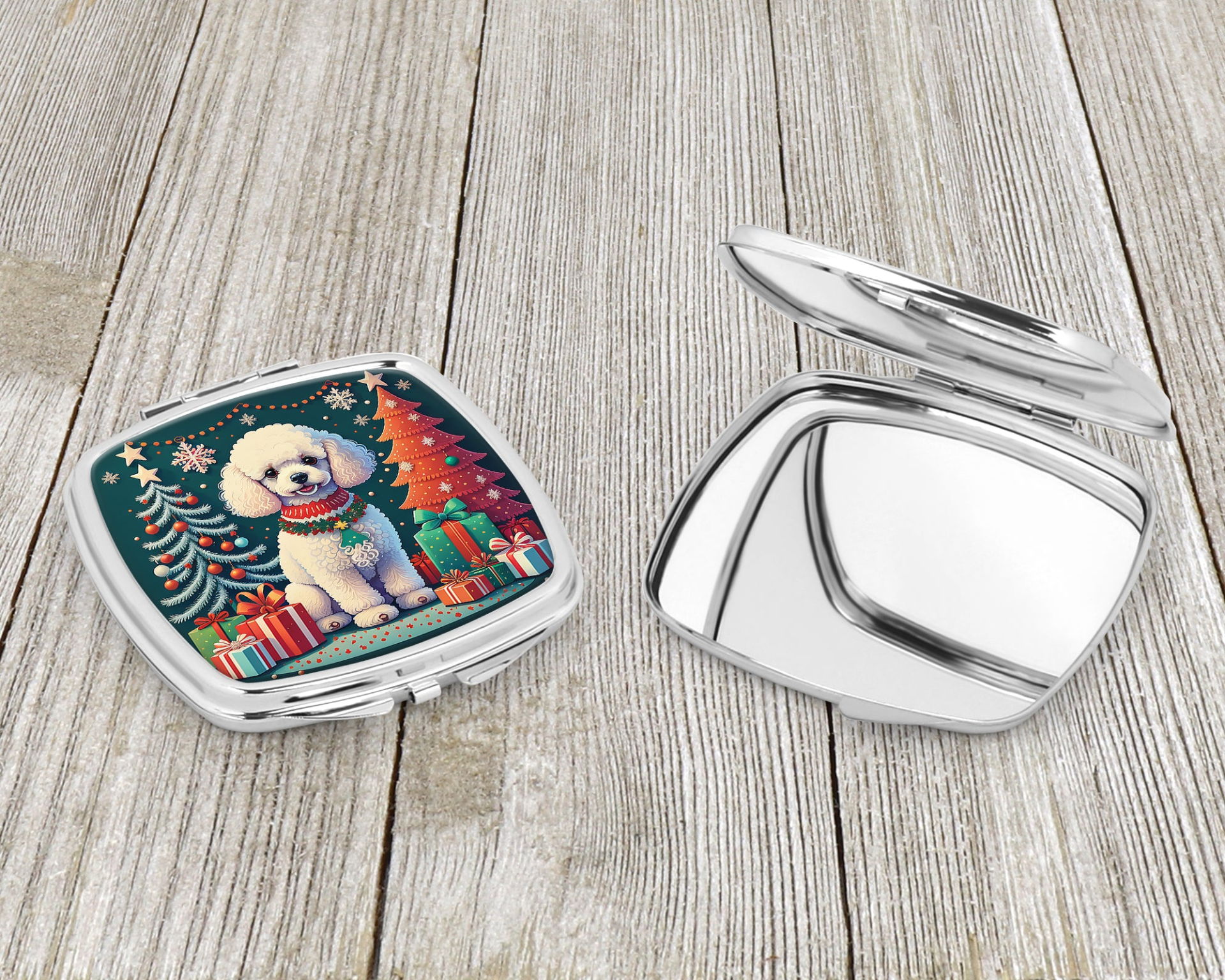 Compact Mirror featuring breed specific Poodle artwork. Celebrate Christmas with this Christmas Compact Mirror. Introducing our Square Compact Mirror, a blend of elegance, functionality, and compactness, perfect for on-the-go touch-ups. This Silvertone metal mirror, with dimensions of 2.75 inches x 3 inches x .3 inches, fits effortlessly into your purse, handbag, or pocket, ensuring that you can check your appearance anytime, anywhere. Our compact mirror stands out with its eye-catching artwork on the front, adding a dash of style to this practical accessory. It is more than just a mirror; it's a statement piece that reflects your personality and aesthetic. When opened, this compact reveals two mirrors inside, doubling your perspective for precise touch-ups. The Silvertone metal construction ensures durability while maintaining a lightweight feel, making it an ideal everyday carry item. Whether you're rushing to a meeting, prepping for a dinner date, or just need a quick check on your look, our Square Compact Mirror is your reliable companion. Experience the perfect blend of style and practicality with this must-have accessory.