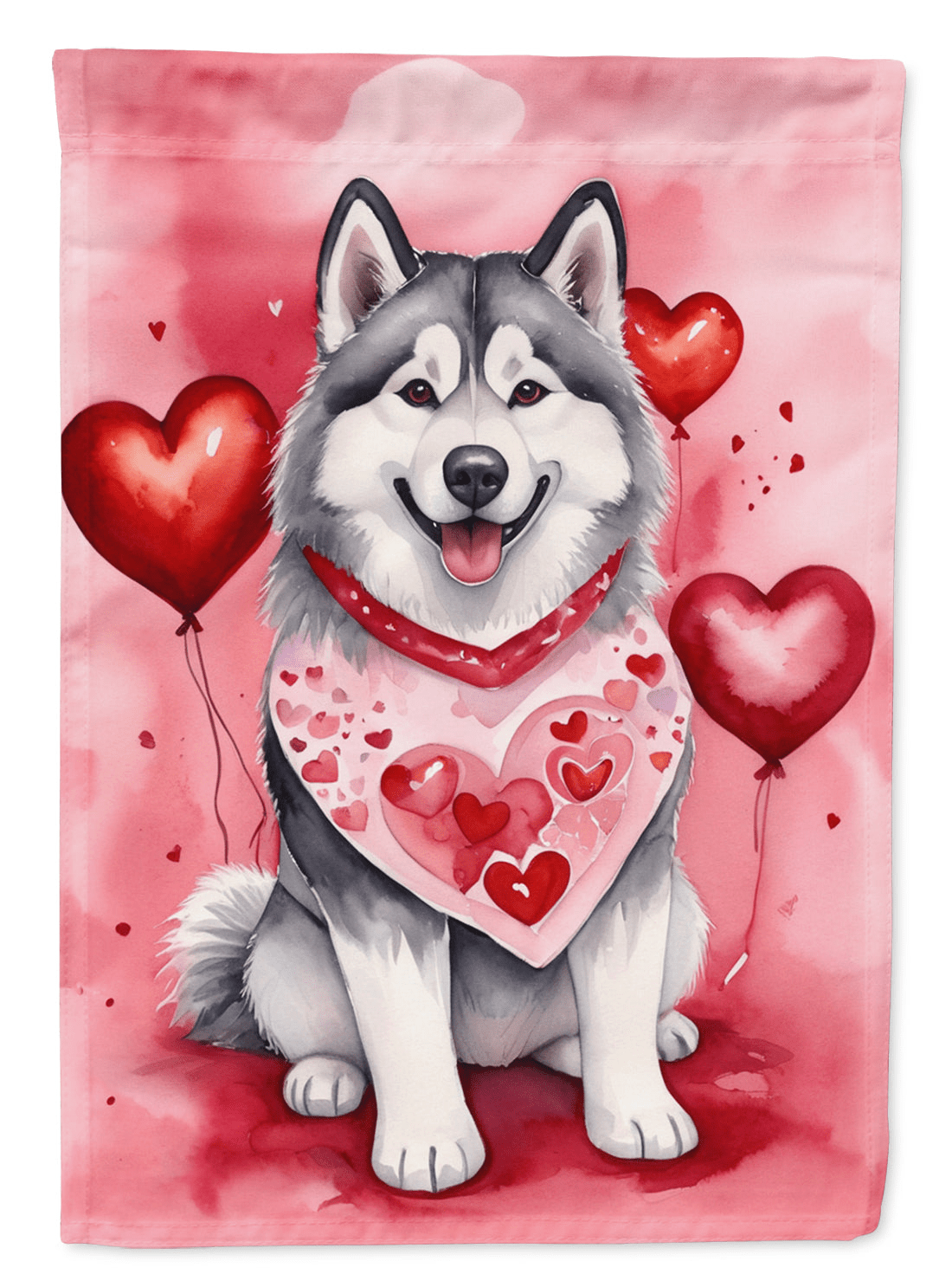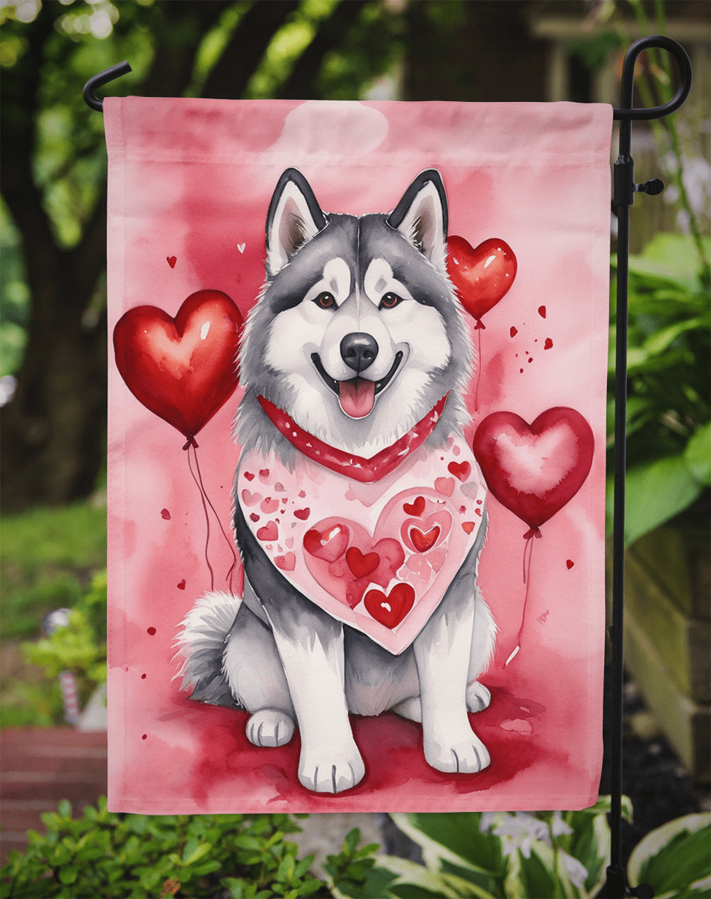 Garden Flag featuring breed specific Alaskan Malamute artwork. Celebrate Valentine's Day with this Valentine's Day Garden Flag. Enhance the beauty of your garden, patio, or yard with Caroline's Treasures Decorative Garden Flag, proudly made in the USA. Crafted from two pieces of thick, double-sided polyester fabric, this 2-ply garden flag is designed to withstand various weather conditions, making it water-resistant and weatherproof. Featuring correctly readable words on both sides, this garden flag offers a delightful visual experience from any angle. With its heavier weight, it stands out among other garden flags, ensuring stability and durability even in wind, rain, and snow. Measuring approximately 11 1/4 inches by 15 1/2 inches, this flag allows you to personalize your outdoor decor. It comes with a 1 1/2-inch sleeve sewn in, allowing easy attachment to any standard garden flag stand or garden size porch hanger (sold separately). Make a statement in your outdoor space with Caroline's Treasures Decorative Garden Flag, a vibrant and high-quality flag that adds color and personality to your surroundings. Proudly made in the USA, it's a symbol of quality craftsmanship and attention to detail.