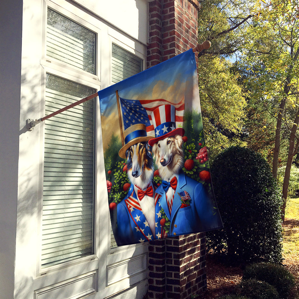 House Flag featuring breed specific Borzoi artwork. Presenting our Heavy Duty Polyester House Size Decorative Sleeve Pole Flag, a vibrant addition to enhance the aesthetic appeal of your home. This large decorative flag, measuring approximately 28 x 40 inches, offers ample coverage and visibility. Each flag is meticulously sewn and made individually, ensuring a unique piece that may slightly vary in size. It's a sleeve pole flag, designed to fit a standard decorative flag pole effortlessly. Please note that the flag pole and bracket are not included and should be purchased separately. What sets our flag apart is its dual-sided print. The design is mirrored on both sides of the fabric, allowing for uniform visibility regardless of the angle. Printed in full color, our flag showcases vibrant hues that truly stand out. To ensure lasting vibrancy and durability, the dyes are heat-set into the fabric. This ensures your flag remains bright and captivating through various weather conditions. Elevate the look of your home with our Heavy Duty Polyester House Size Decorative Sleeve Pole Flag!