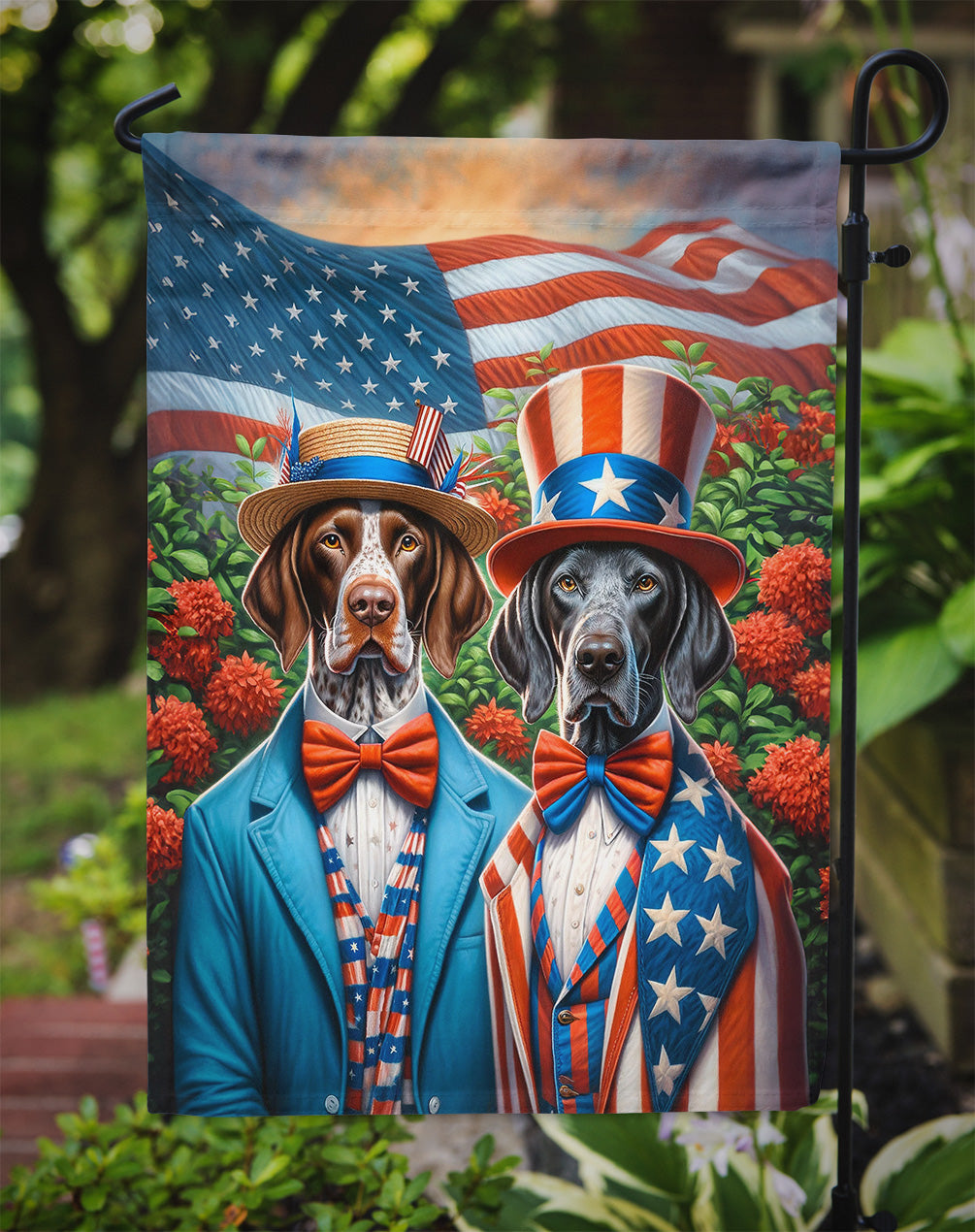Garden Flag featuring breed specific Pointer artwork. Enhance the beauty of your garden, patio, or yard with Caroline's Treasures Decorative Garden Flag, proudly made in the USA. Crafted from two pieces of thick, double-sided polyester fabric, this 2-ply garden flag is designed to withstand various weather conditions, making it water-resistant and weatherproof. Featuring correctly readable words on both sides, this garden flag offers a delightful visual experience from any angle. With its heavier weight, it stands out among other garden flags, ensuring stability and durability even in wind, rain, and snow. Measuring approximately 11 1/4 inches by 15 1/2 inches, this flag allows you to personalize your outdoor decor. It comes with a 1 1/2-inch sleeve sewn in, allowing easy attachment to any standard garden flag stand or garden size porch hanger (sold separately). Make a statement in your outdoor space with Caroline's Treasures Decorative Garden Flag, a vibrant and high-quality flag that adds color and personality to your surroundings. Proudly made in the USA, it's a symbol of quality craftsmanship and attention to detail.