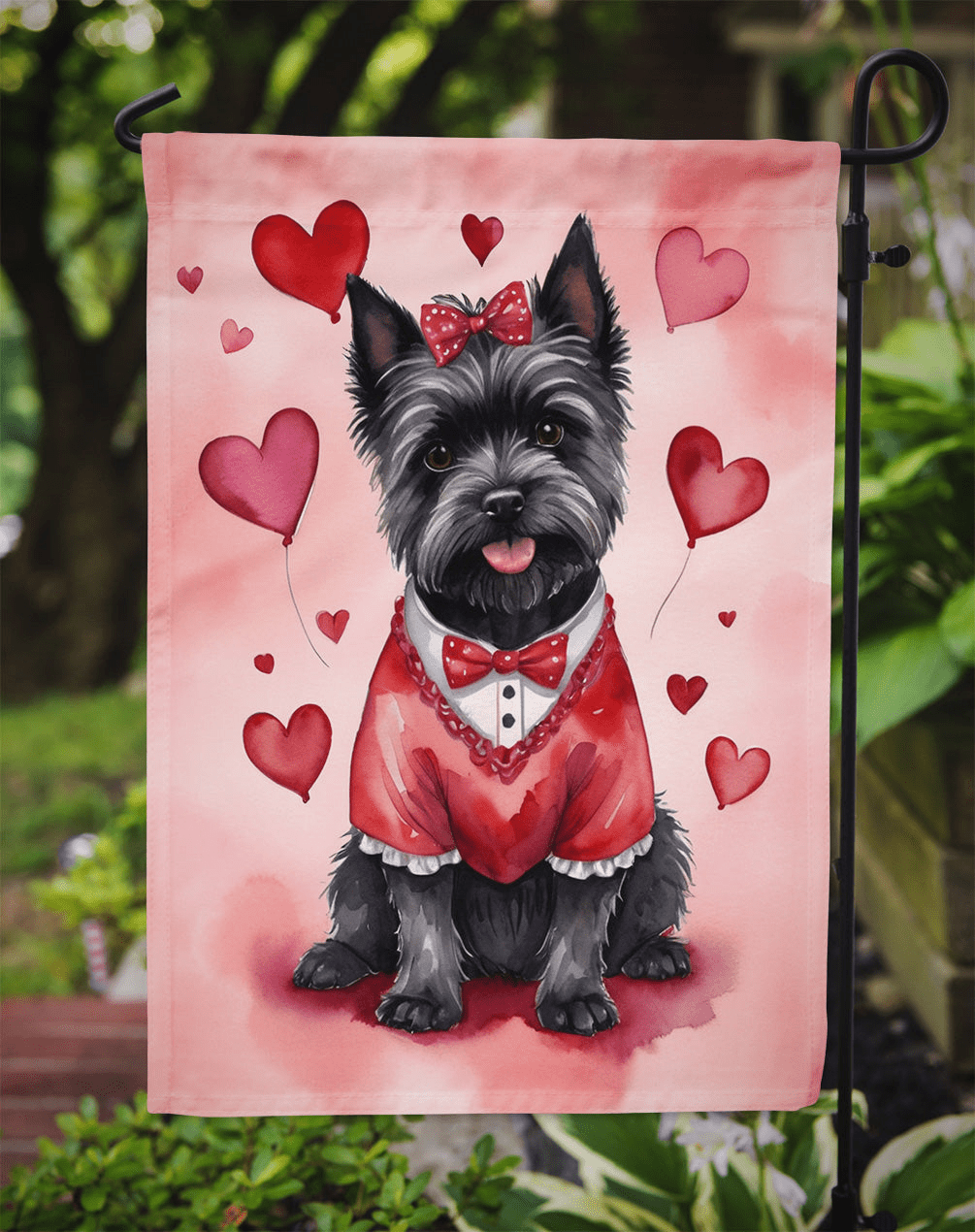 Garden Flag featuring breed specific Cairn Terrier artwork. Celebrate Valentine's Day with this Valentine's Day Garden Flag. Enhance the beauty of your garden, patio, or yard with Caroline's Treasures Decorative Garden Flag, proudly made in the USA. Crafted from two pieces of thick, double-sided polyester fabric, this 2-ply garden flag is designed to withstand various weather conditions, making it water-resistant and weatherproof. Featuring correctly readable words on both sides, this garden flag offers a delightful visual experience from any angle. With its heavier weight, it stands out among other garden flags, ensuring stability and durability even in wind, rain, and snow. Measuring approximately 11 1/4 inches by 15 1/2 inches, this flag allows you to personalize your outdoor decor. It comes with a 1 1/2-inch sleeve sewn in, allowing easy attachment to any standard garden flag stand or garden size porch hanger (sold separately). Make a statement in your outdoor space with Caroline's Treasures Decorative Garden Flag, a vibrant and high-quality flag that adds color and personality to your surroundings. Proudly made in the USA, it's a symbol of quality craftsmanship and attention to detail.